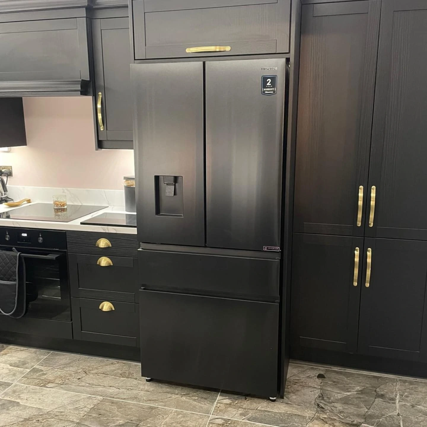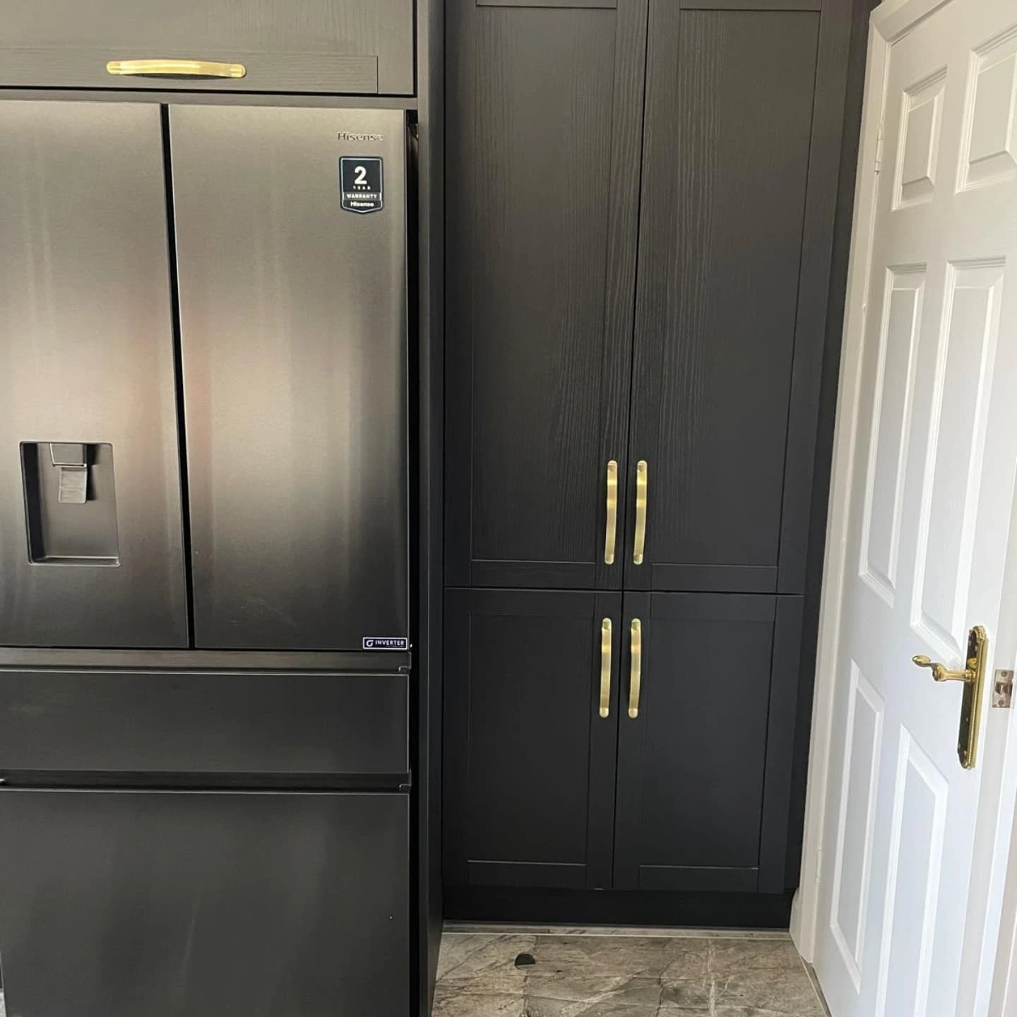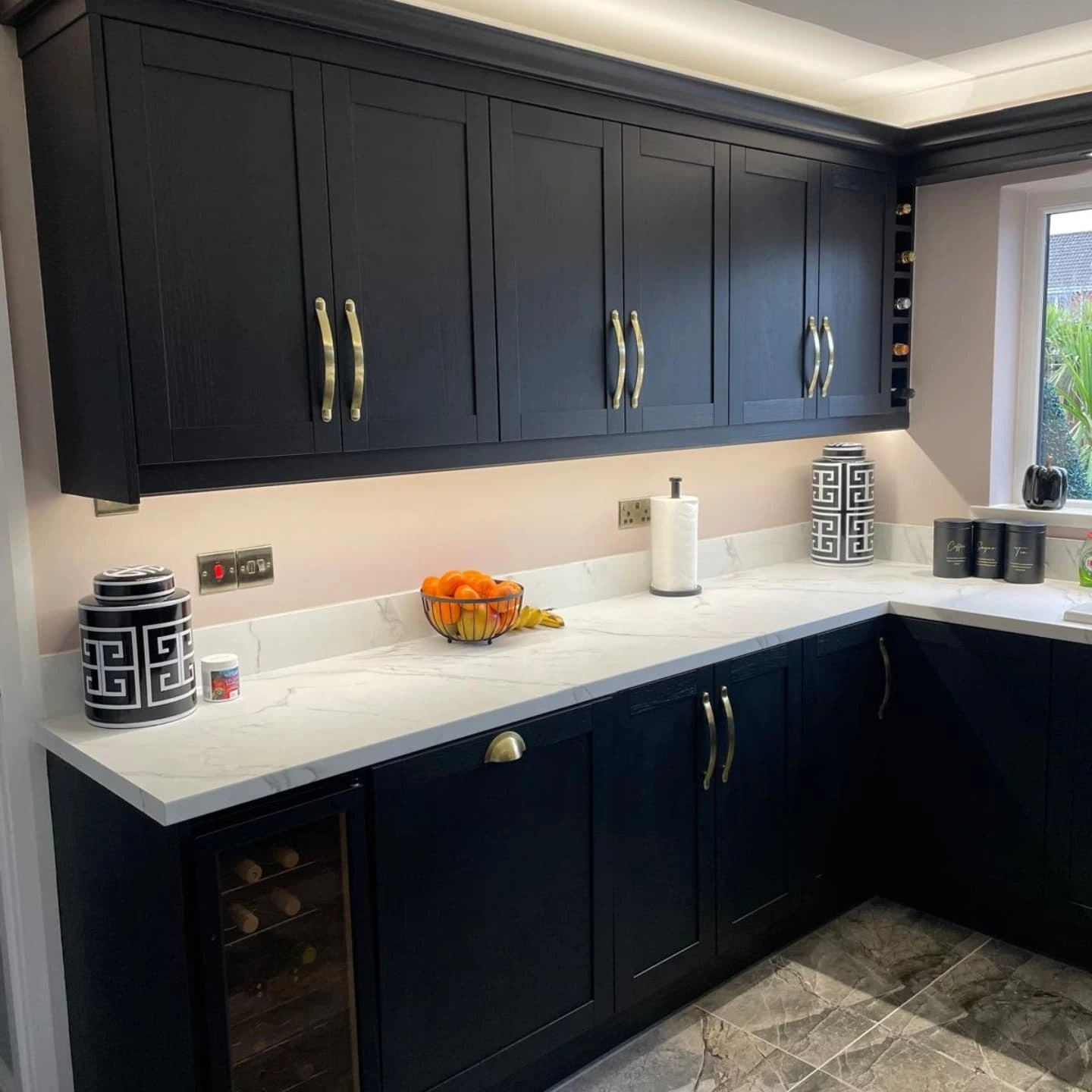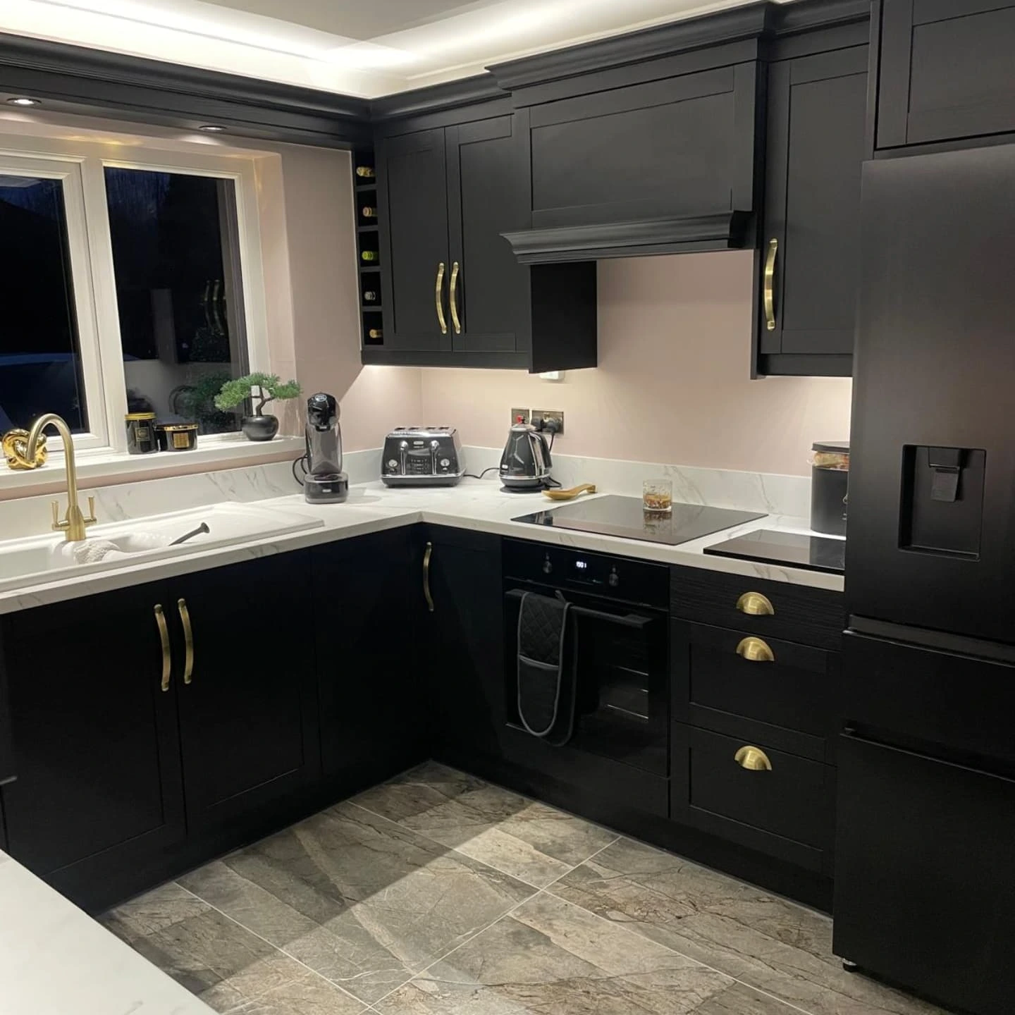 Кухня Аливария сочетает матовые черные фасады, светлую столешницу под белый камень и аккуратные латунные детали, создавая спокойный контраст в стиле современной классики и минимализма; П-образная форма удобна в работе, а фурнитура Blum обеспечивает мягкое и тихое использование.