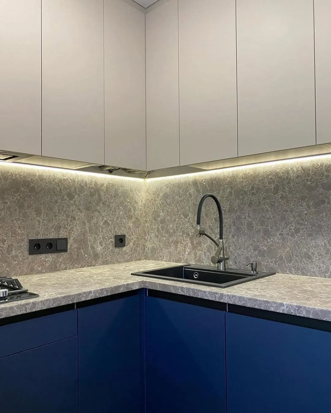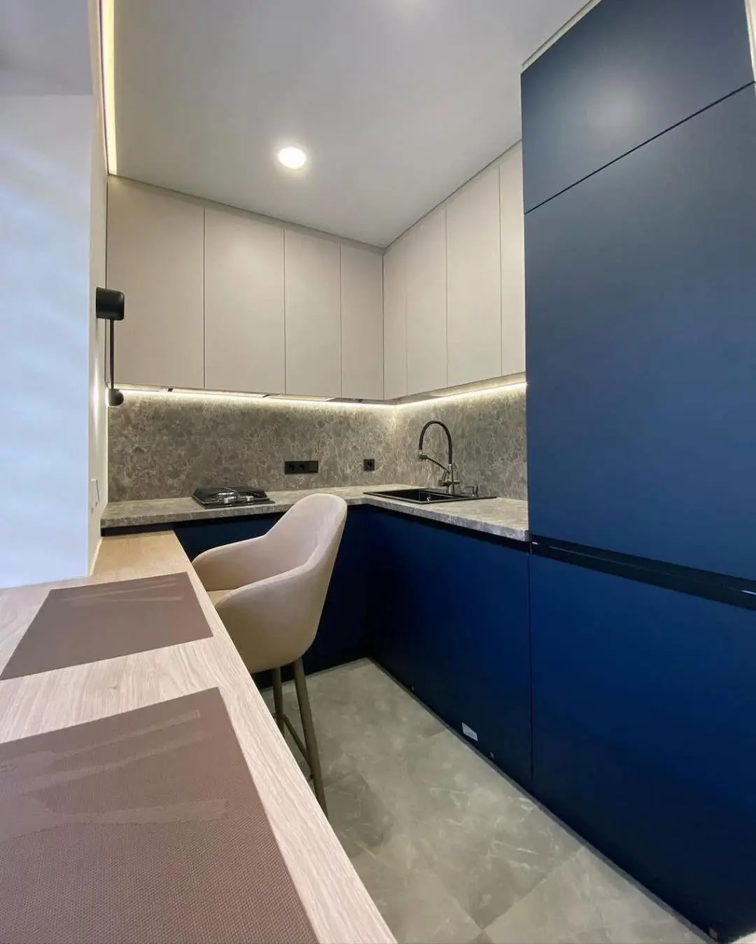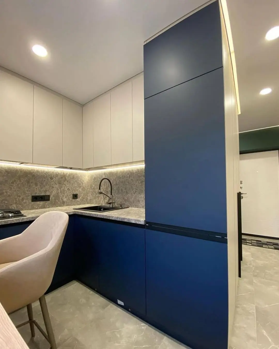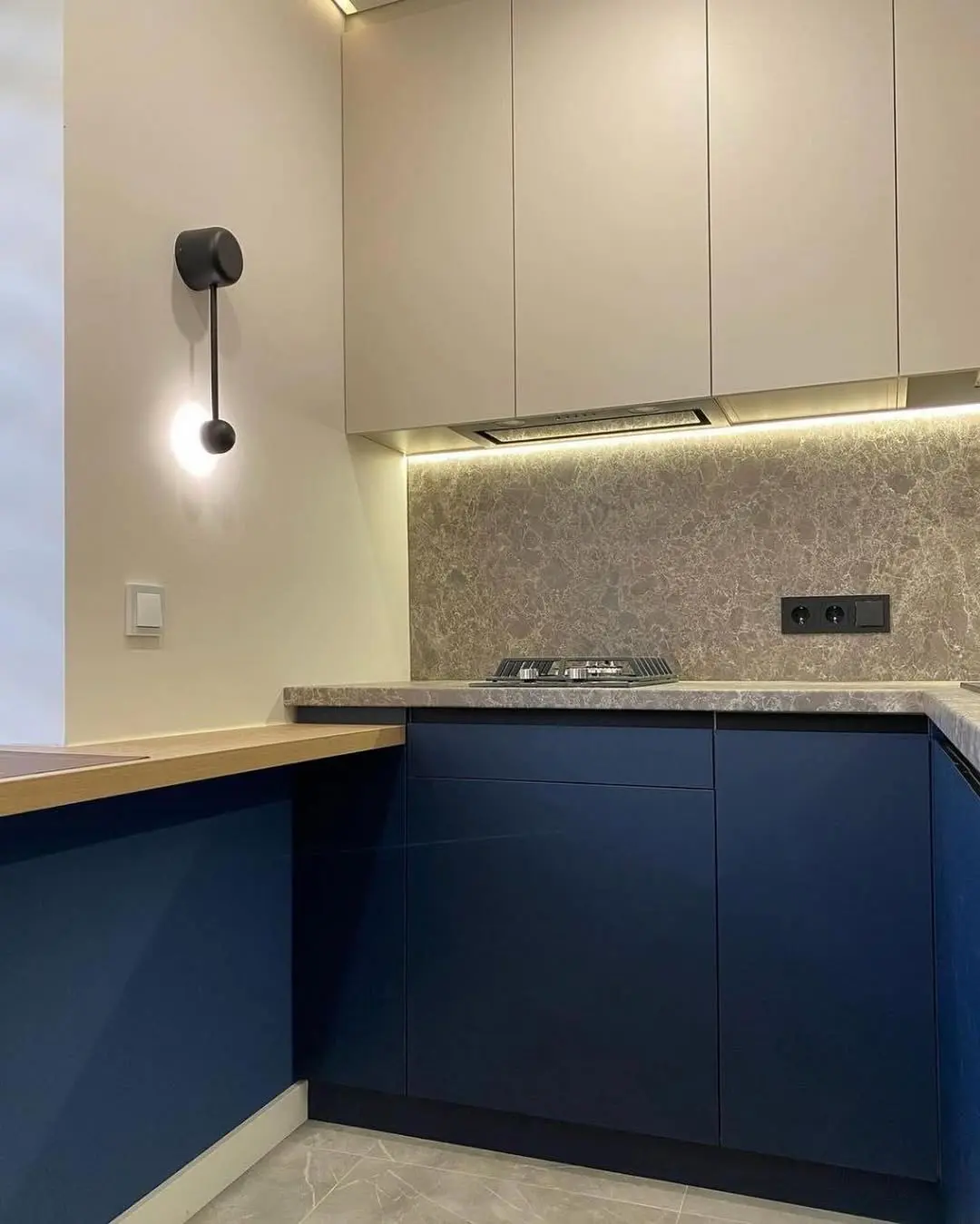 Кухня Астелли выполнена в элегантной цветовой гамме — сочетании глубокого синего и мягкого бежевого оттенков.