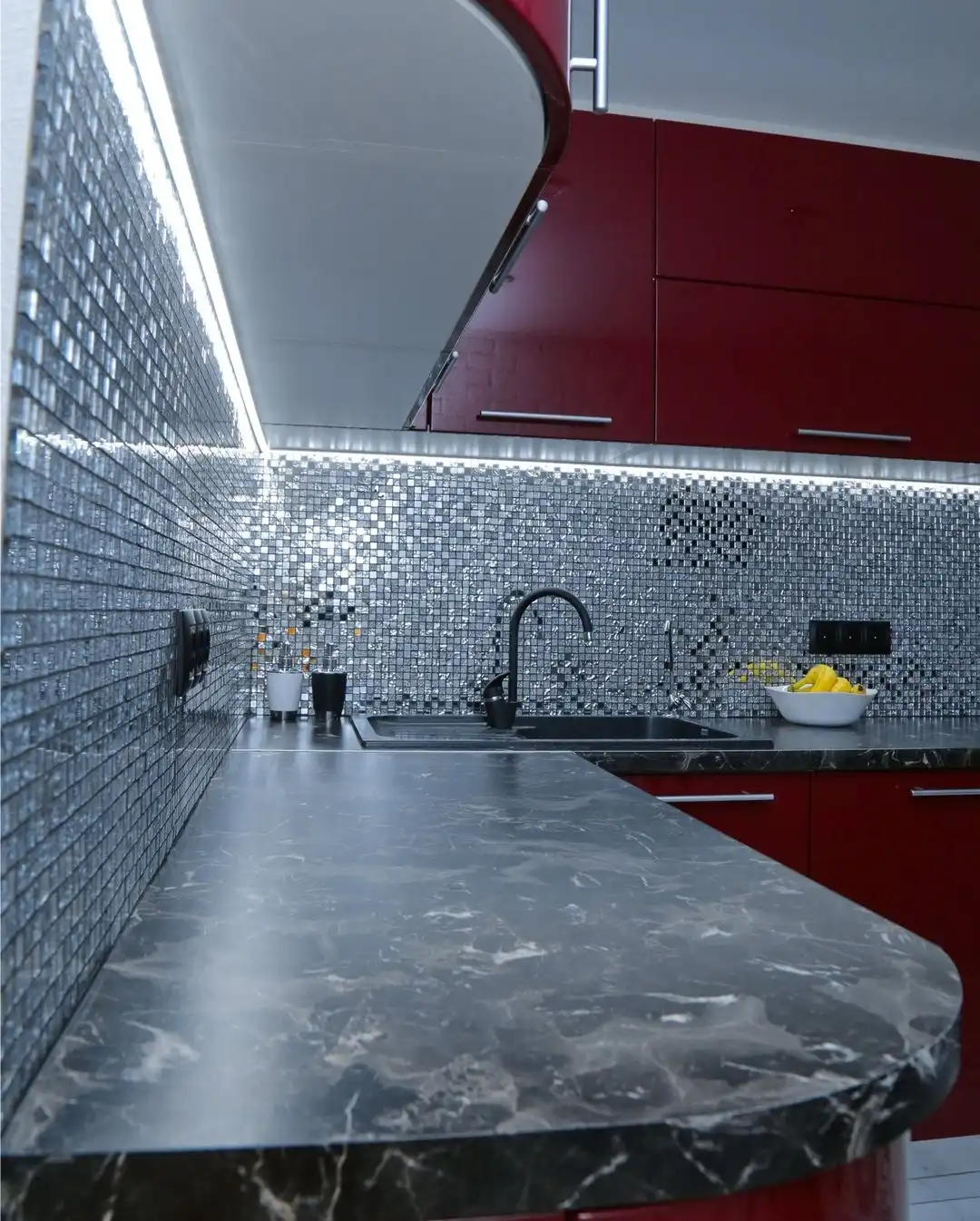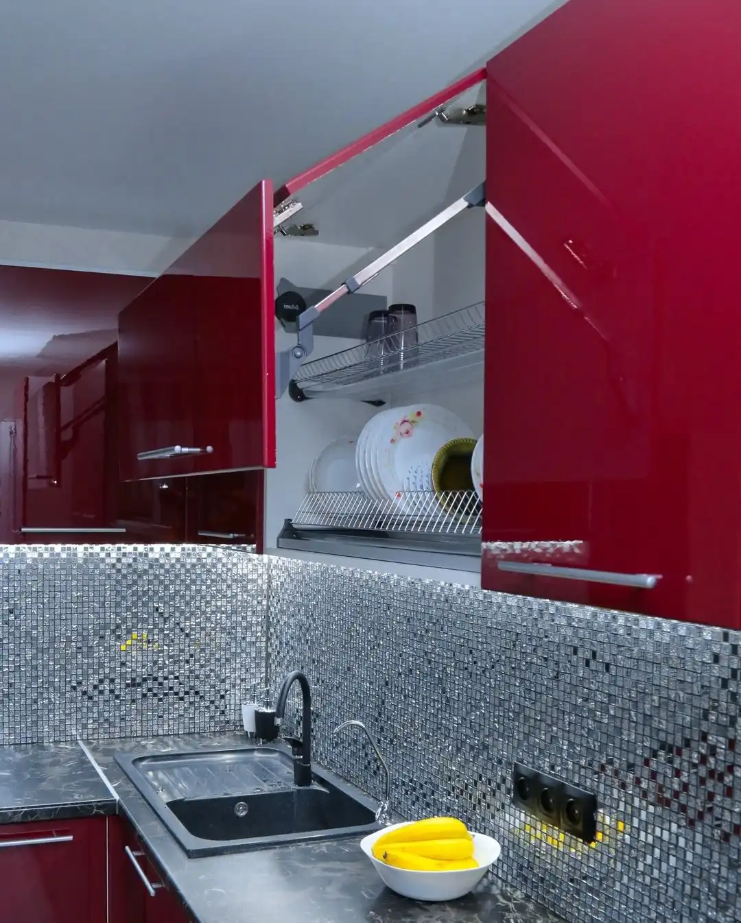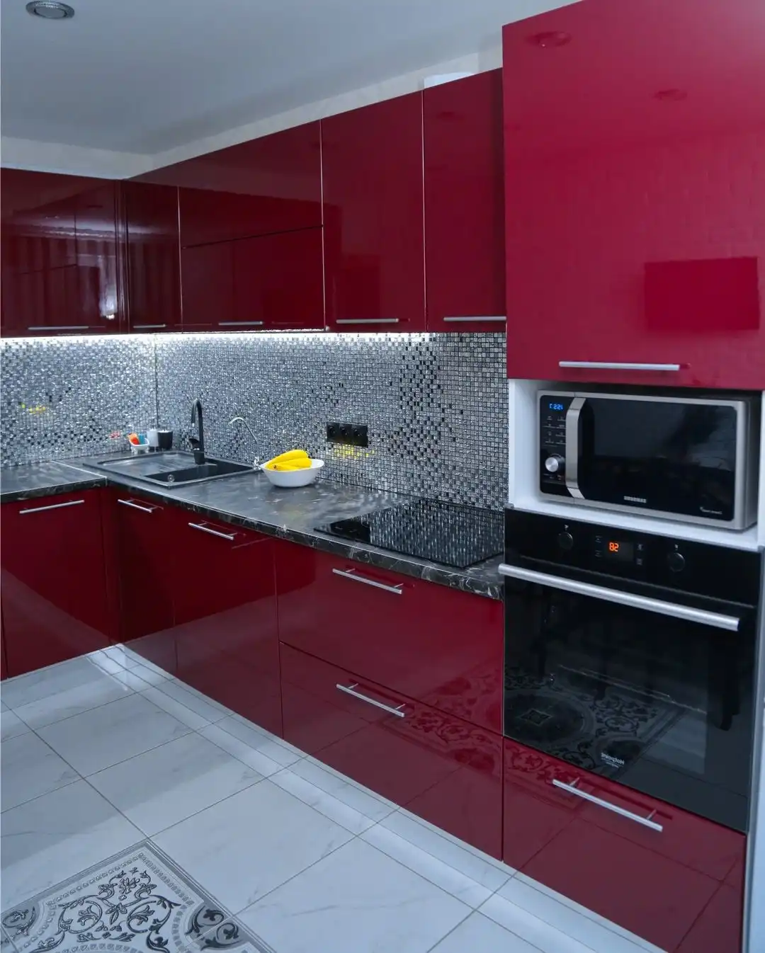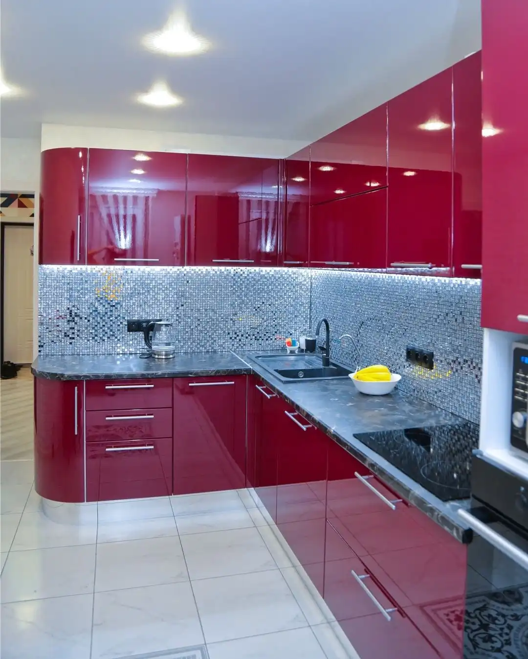 Кухня Астрид выделяется глубоким вишнёвым глянцем и чистыми современными линиями. Яркие фасады из МДФ создают ощущение динамики, а холодный серый столешничный тон добавляет интерьеру баланса. Угловая форма делает пространство практичным и удобным, а фурнитура Blum обеспечивает долговечность и плавность движений.