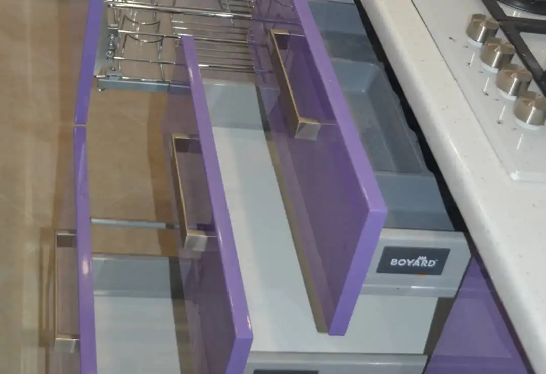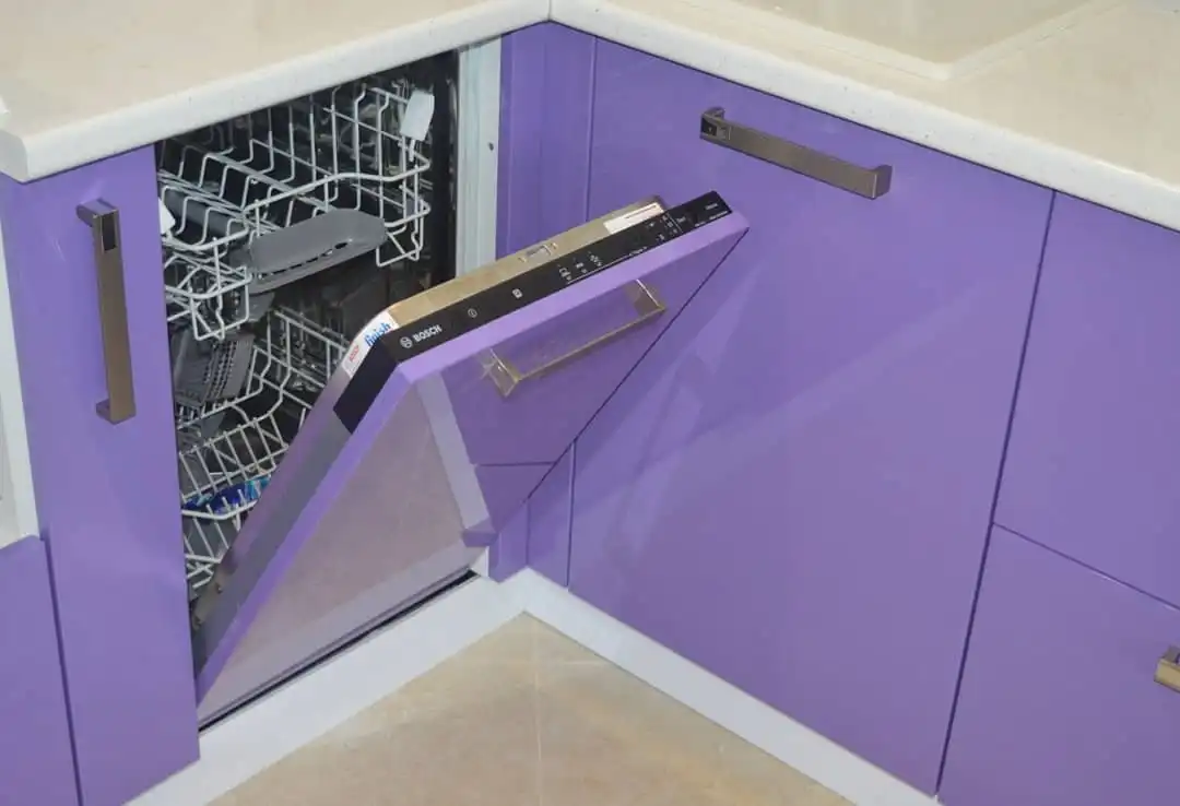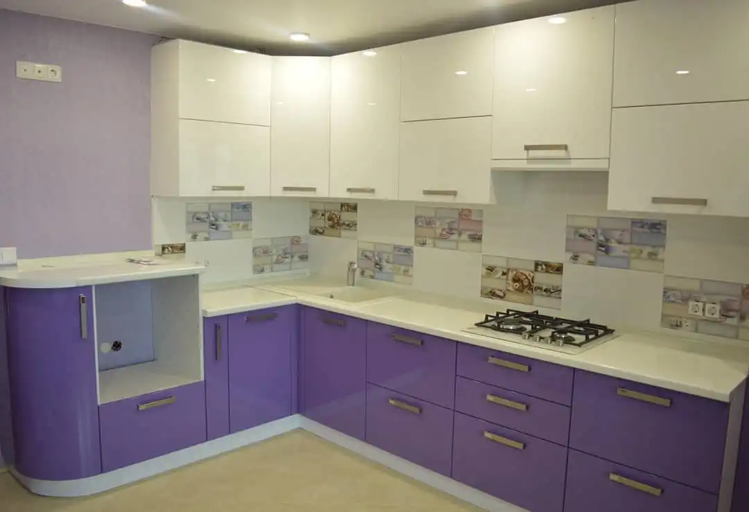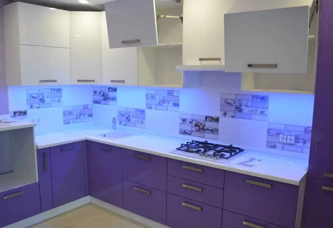 Кухня Аурелин оформлена в мягких лавандовых оттенках с белыми верхними фасадами. Глянцевое покрытие подчёркивает чистоту линий и делает пространство визуально светлее.