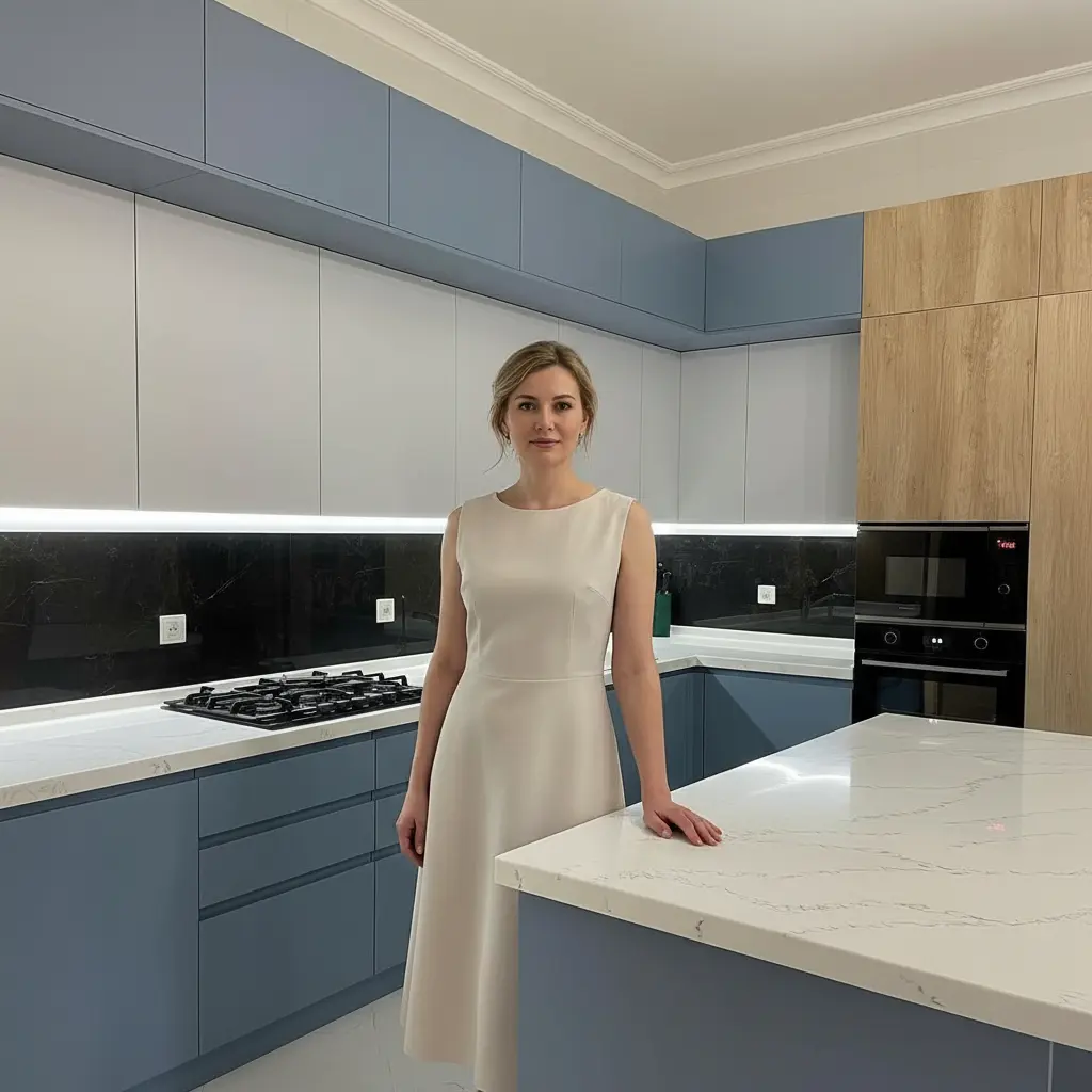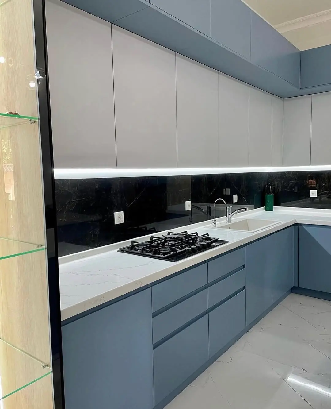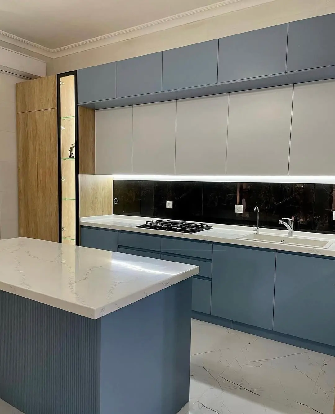 Фасады из МДФ с матовой эмалью в нежно-голубом и сером оттенках создают атмосферу лёгкости и уюта. Вставки под дерево добавляют естественности, а мраморная столешница из искусственного камня подчёркивает премиальность интерьера. Фурнитура Firmax обеспечивает надёжность и плавность открывания.