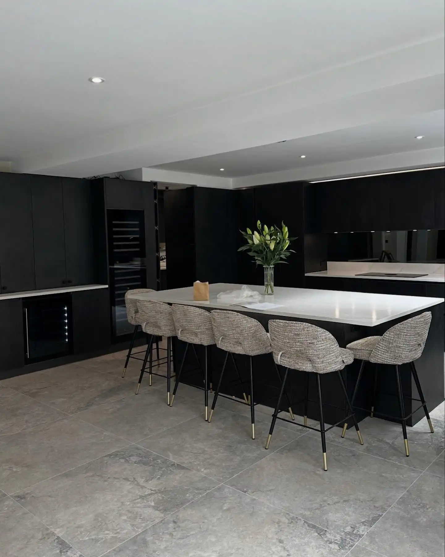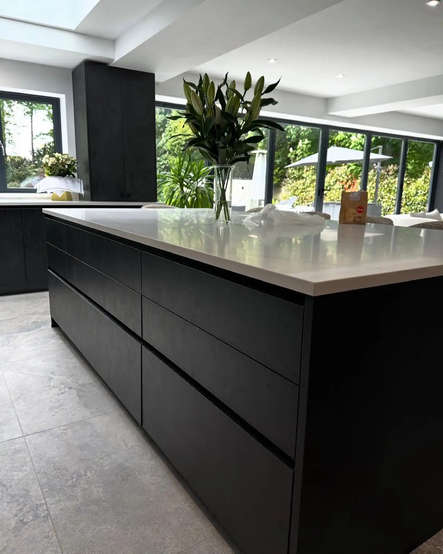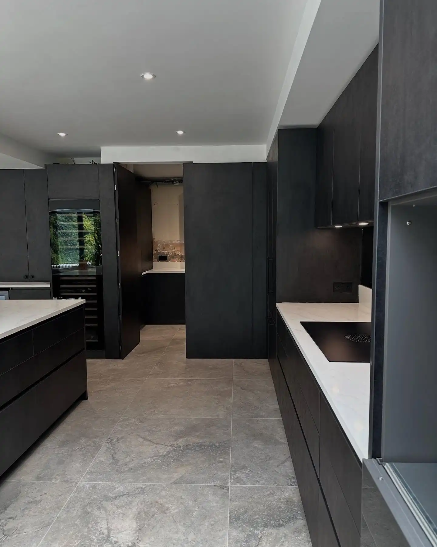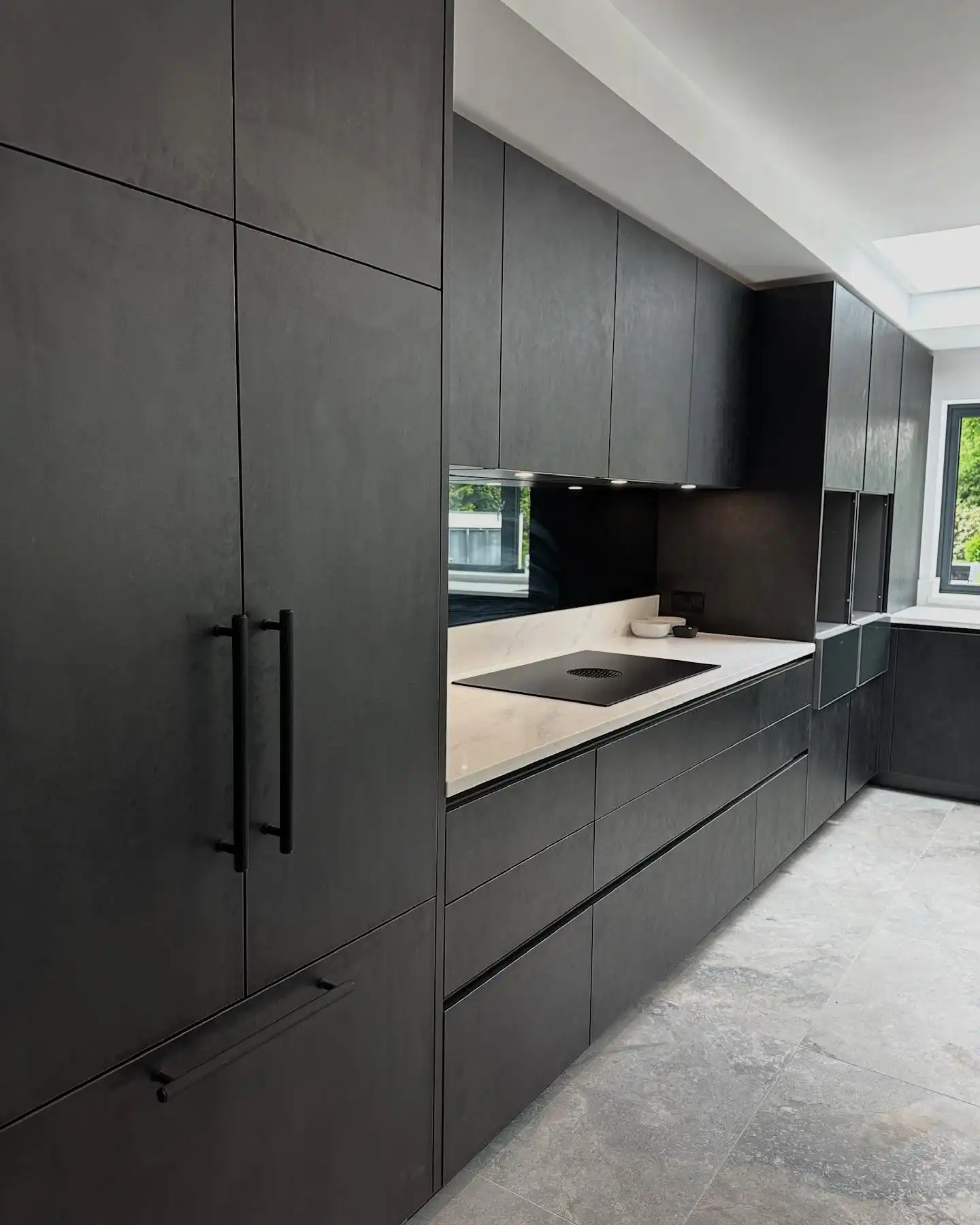 Кухня Дарвена выполнена в графитовом матовом цвете с белой столешницей под камень, создавая сдержанный лофт с минималистичной геометрией; П-образная форма и большой остров дают просторное рабочее поле и удобное зонирование, а фурнитура Hettich обеспечивает мягкое и тихое использование.