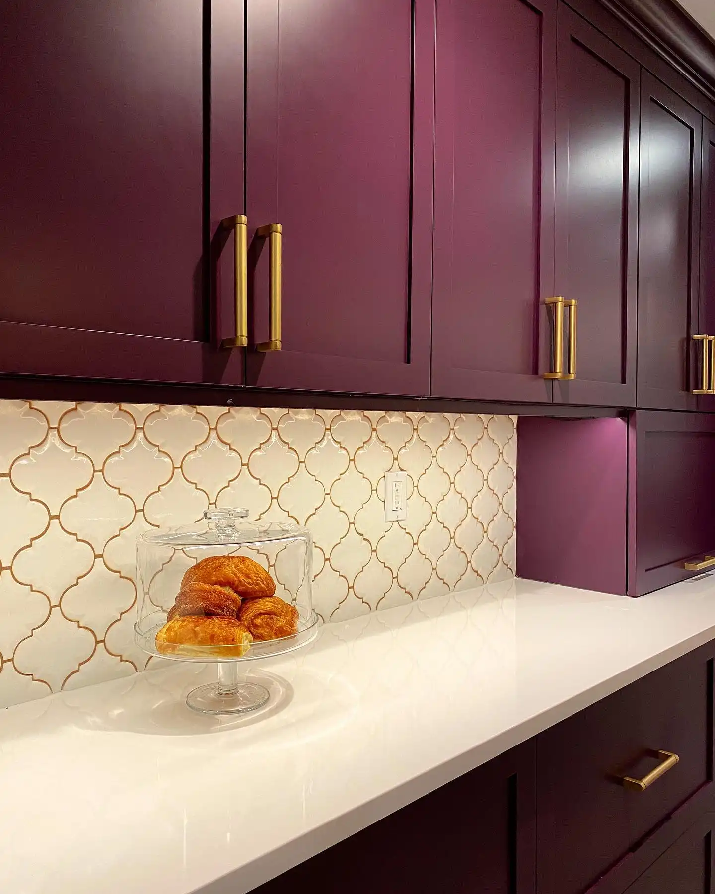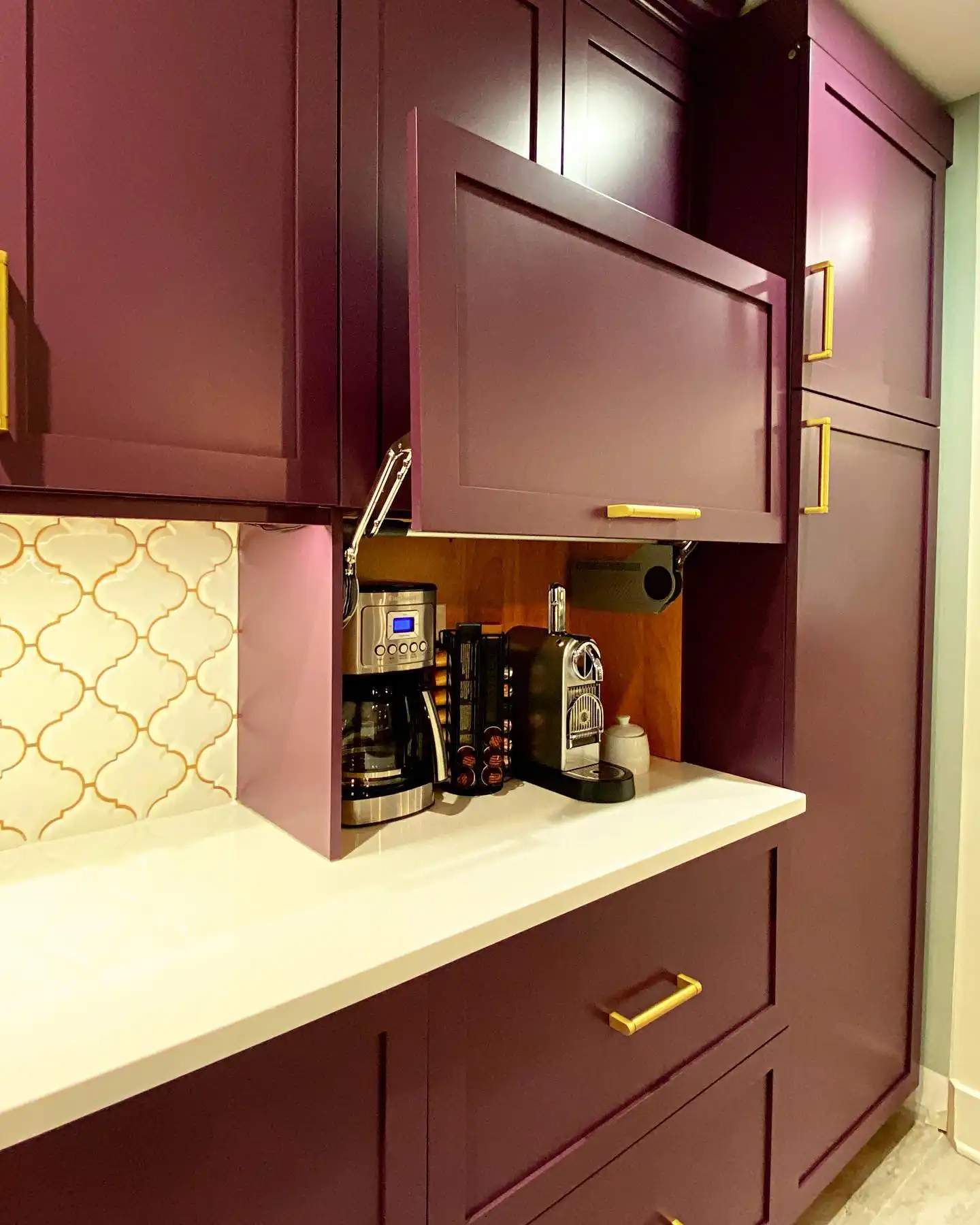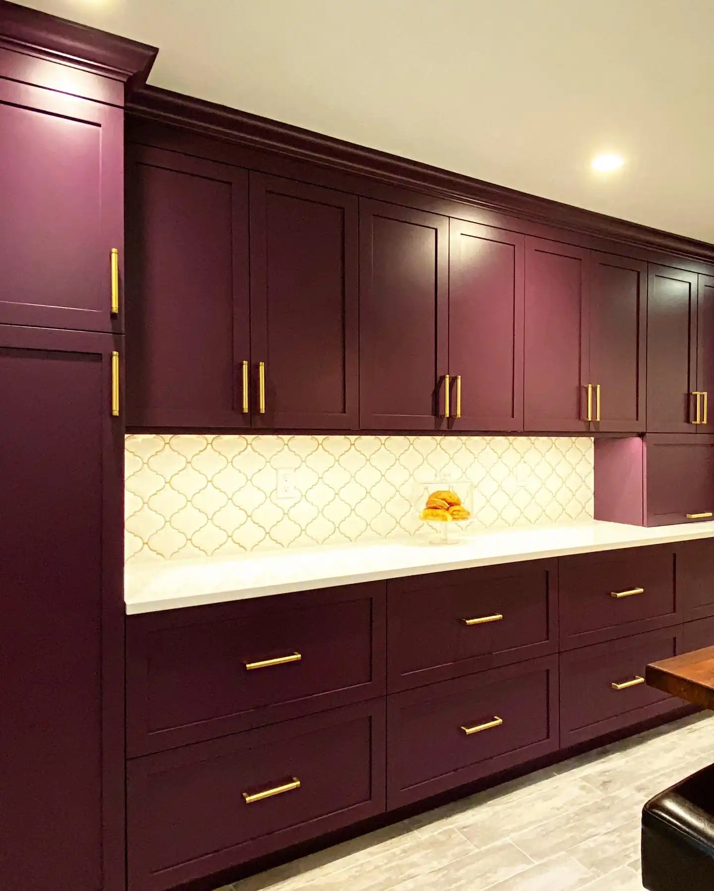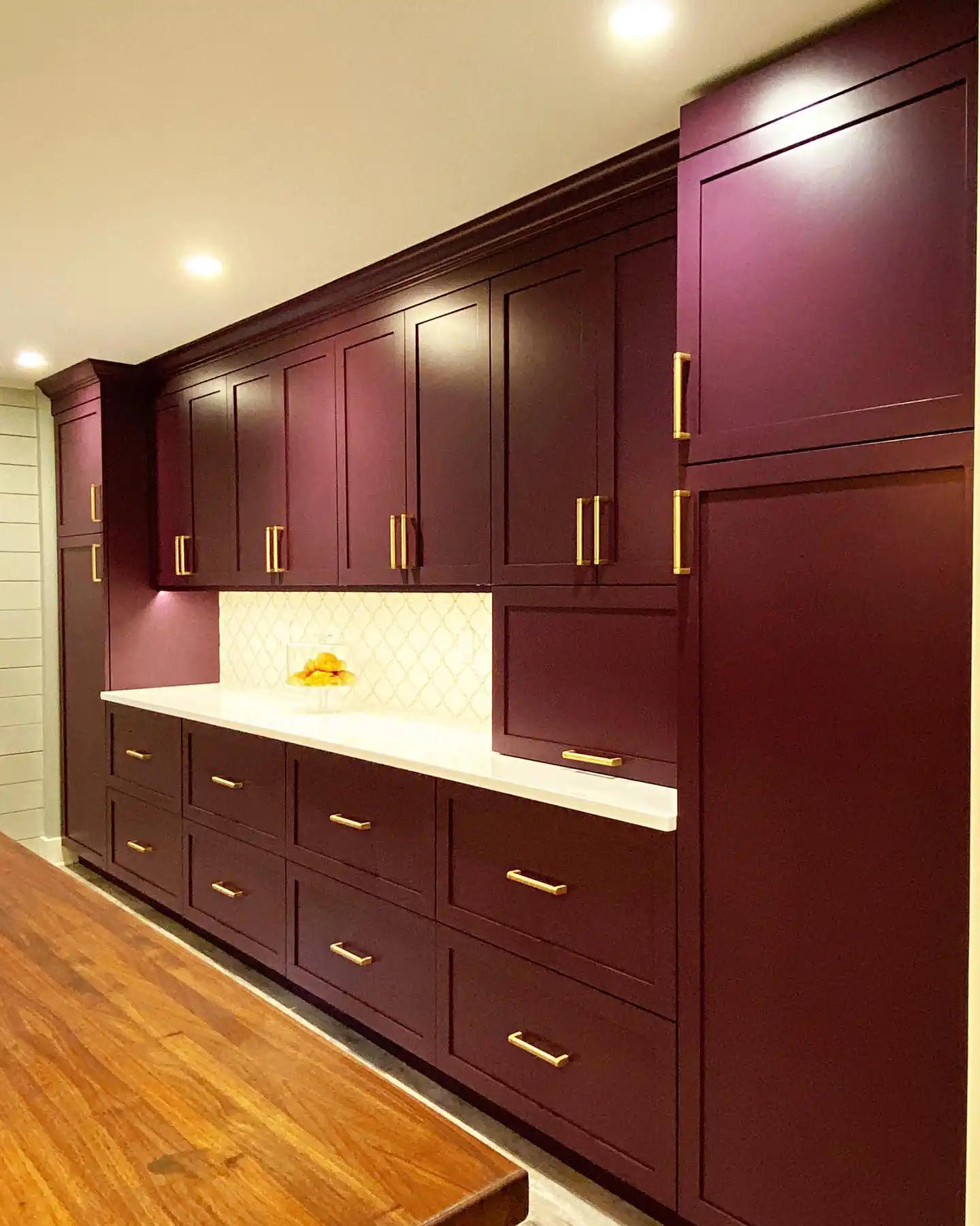 Кухня Элара воплощает изысканность и глубину цвета. Бордово-сливовые матовые фасады с акцентными золотыми ручками создают атмосферу тепла и стиля.