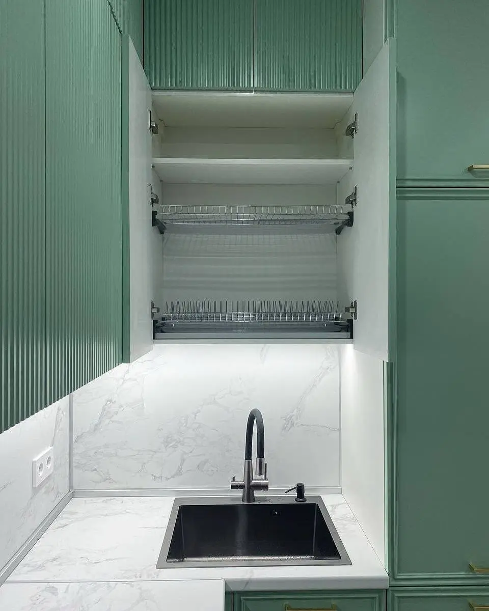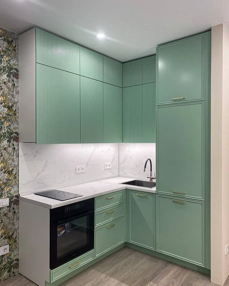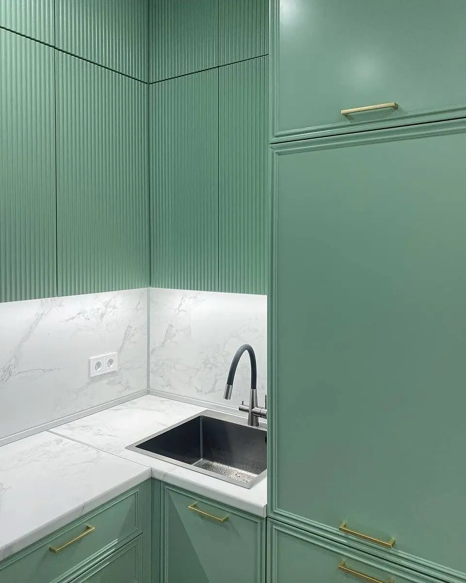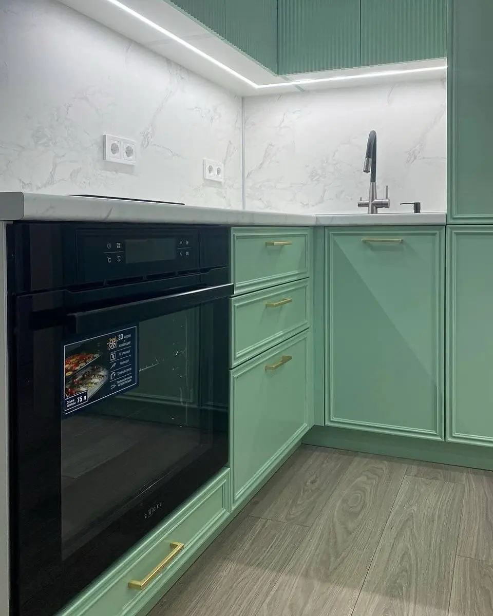 Мятно-зелёный цвет освежает интерьер, а серый корпус и мраморная столешница придают утончённость и баланс.