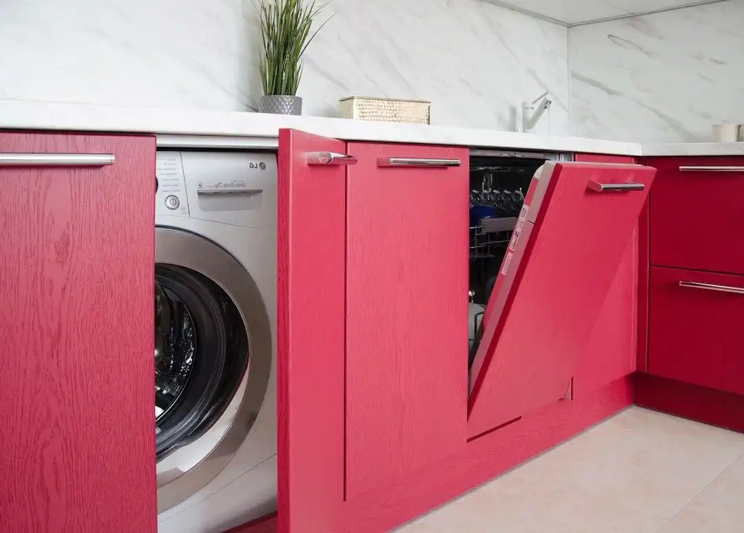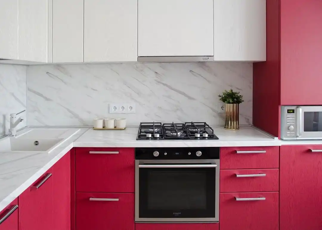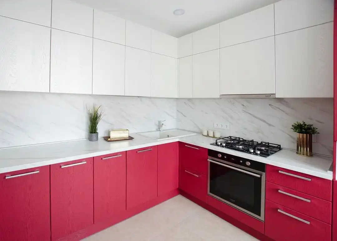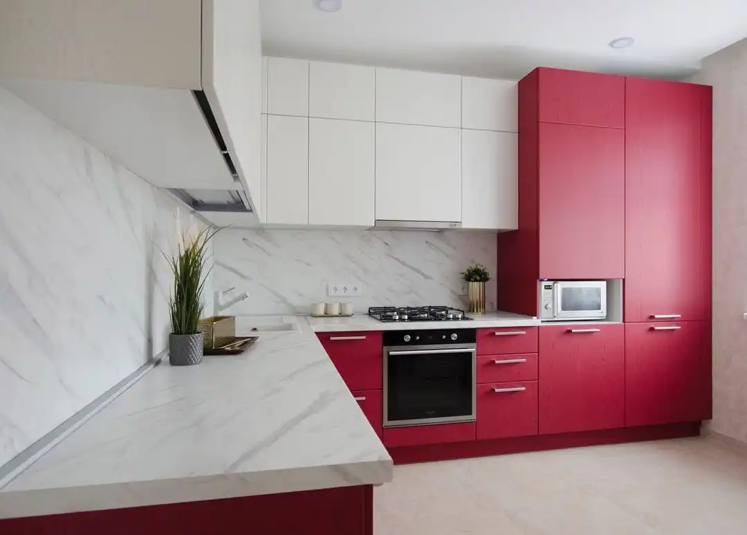 Кухня Эмира — гармония уюта и современного минимализма. Кораллово-красные фасады с лёгкой текстурой дерева подчёркивают естественность, а белые верхние модули и столешница под мрамор придают интерьеру свет и простор. Угловая форма делает кухню функциональной, а фурнитура Hettich обеспечивает надёжность и комфорт в каждом движении.