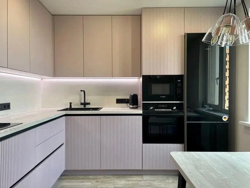 Кухня Эстелла — сочетание современного дизайна и утончённой текстуры фасадов. Матовое покрытие с вертикальной фрезеровкой подчёркивает индивидуальность интерьера, а светло-бежево-серая палитра создаёт ощущение уюта и пространства.