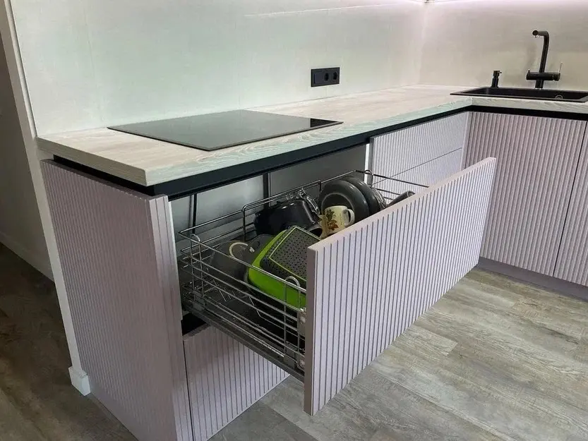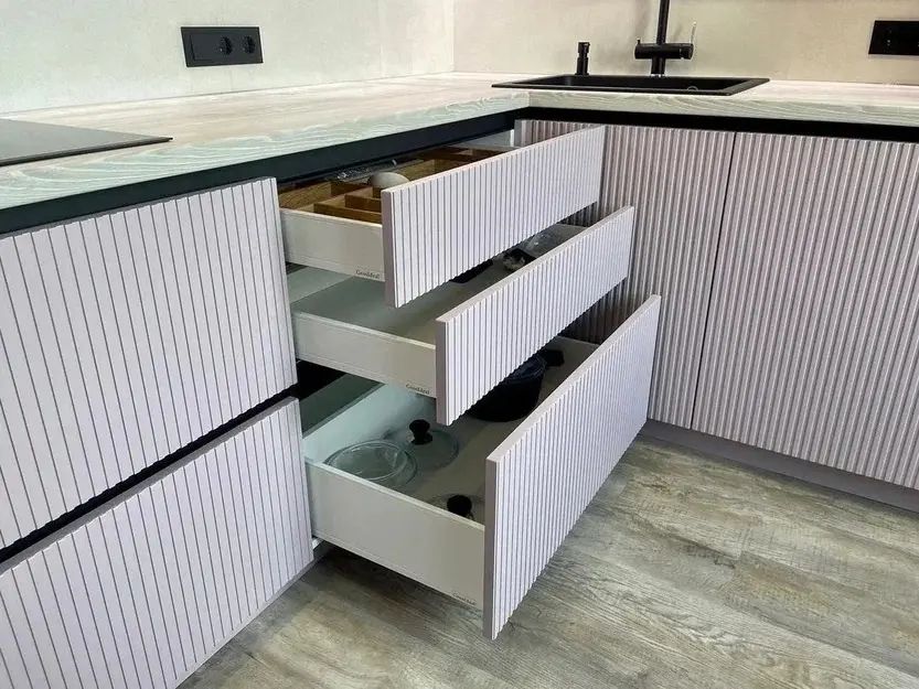 Столешница из пластика под мрамор добавляет практичности, а фурнитура Blum обеспечивает плавность и долговечность в использовании.