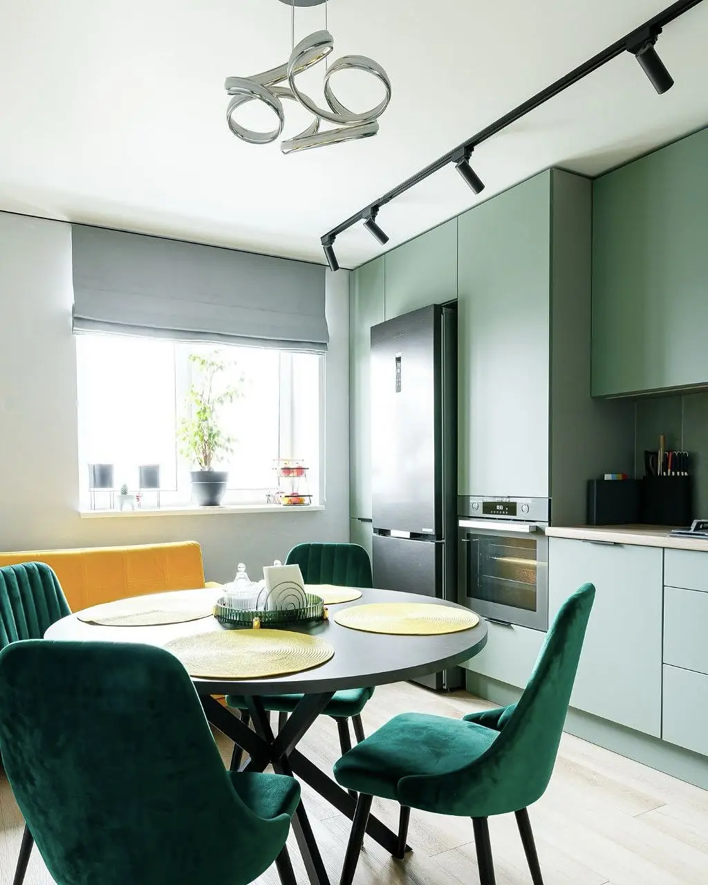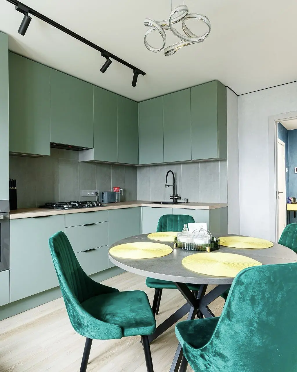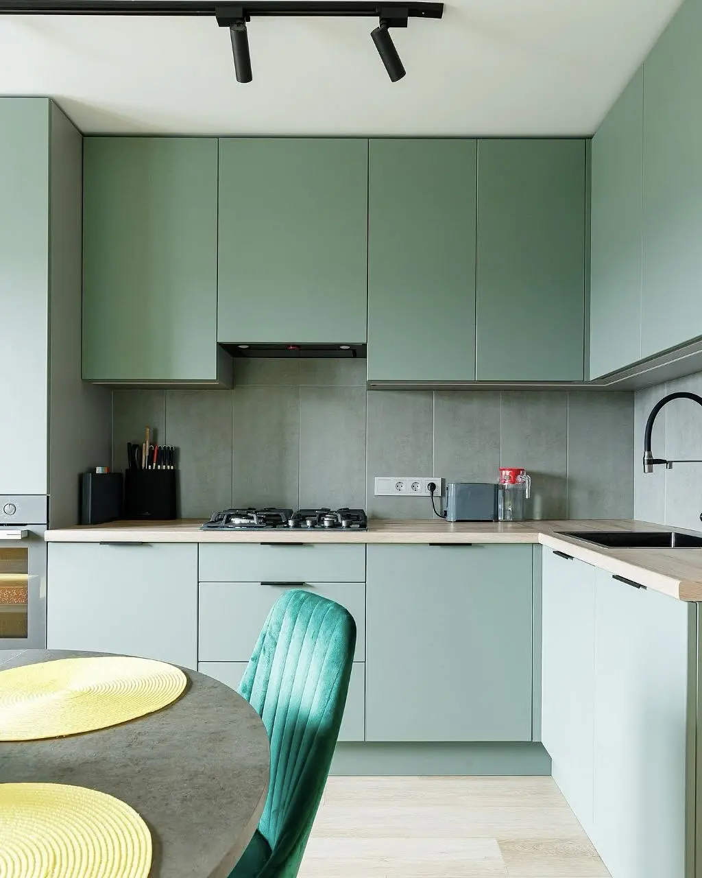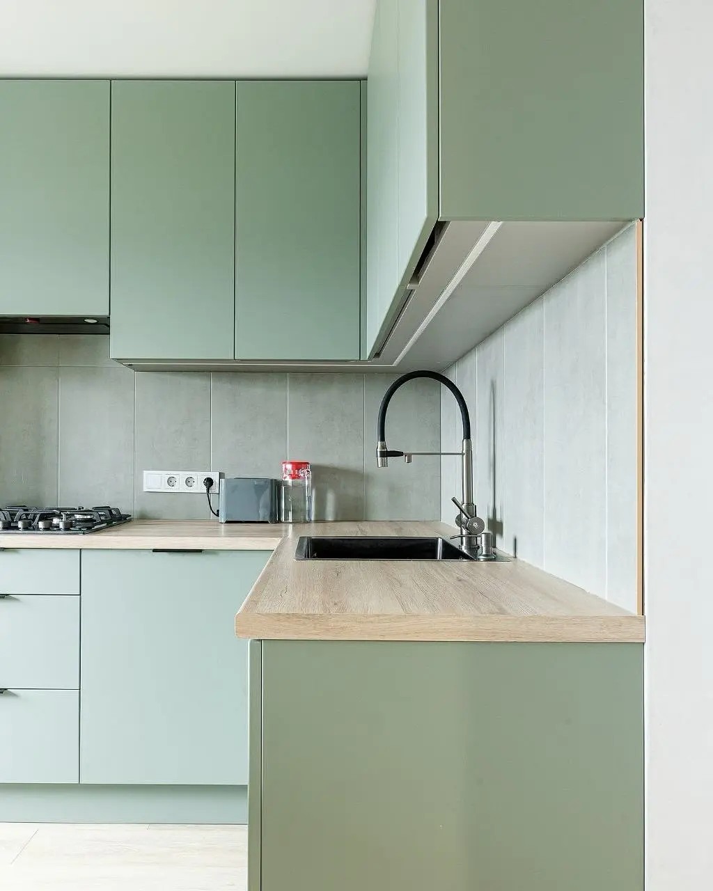 Матовые зелёные фасады гармонируют с серым фартуком и деревянной столешницей, подчёркивая современный минимализм.