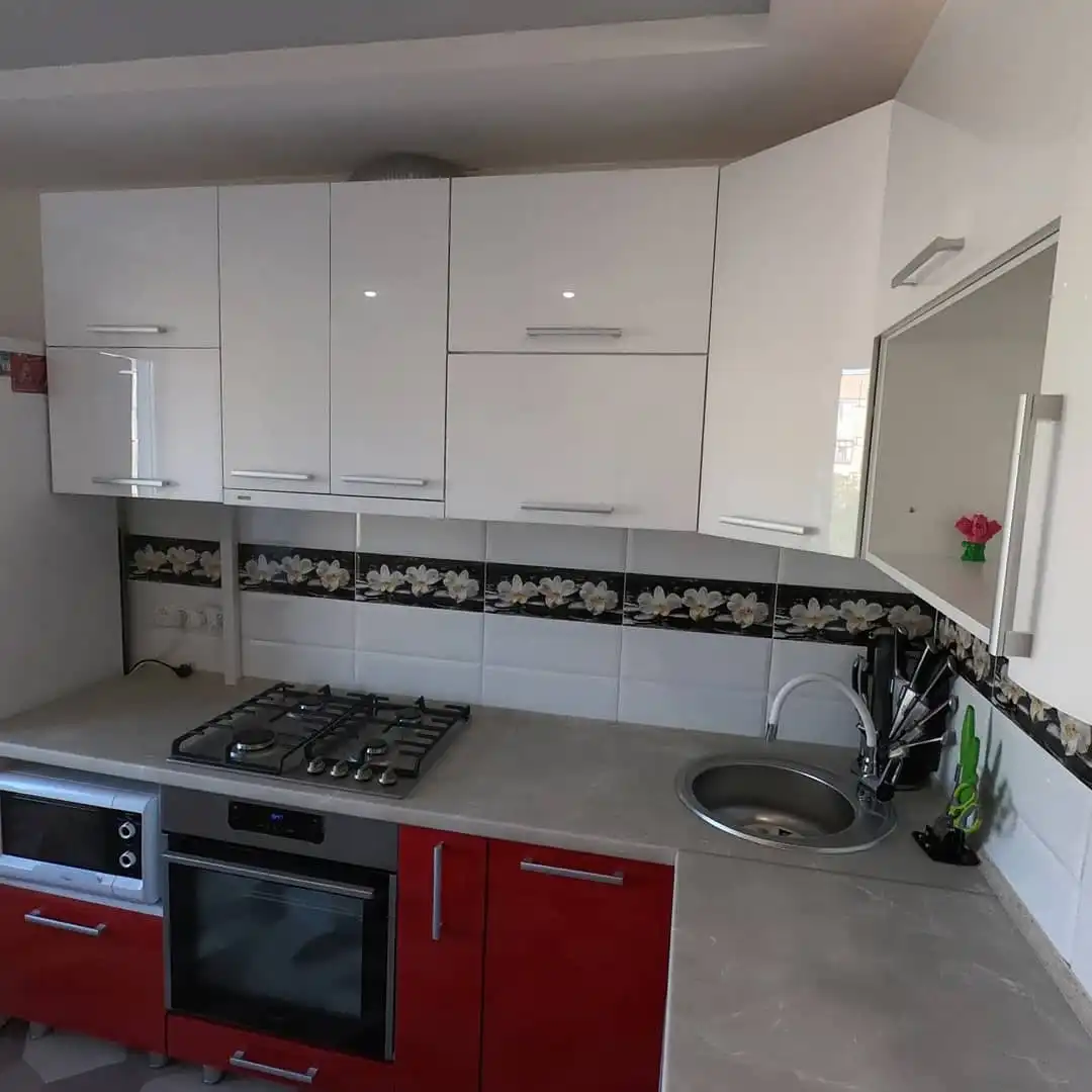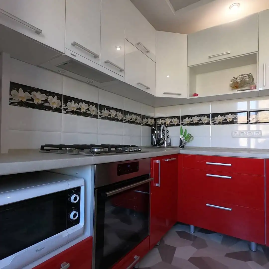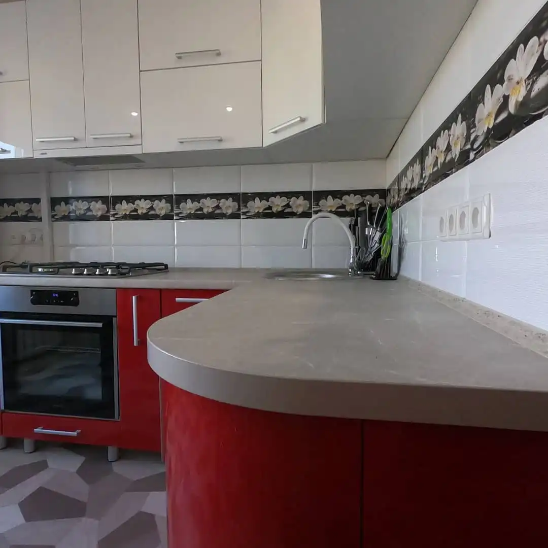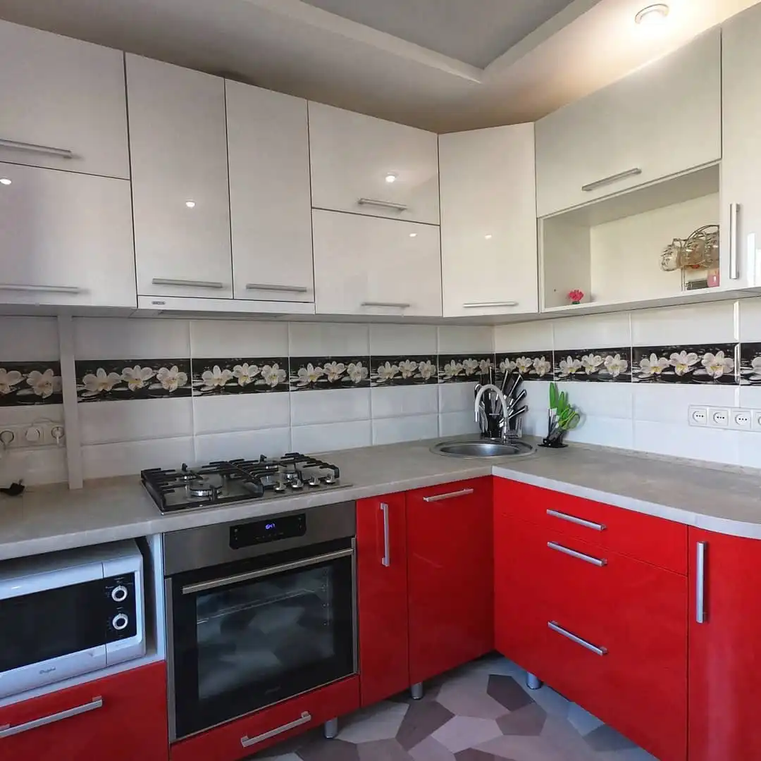 Кухня Фелиса — динамичное сочетание красного и белого в современном исполнении. Глянцевые фасады из МДФ и светлая столешница под бетон создают ощущение свежести и визуальной лёгкости. Угловая форма делает пространство функциональным, а фурнитура Boyard обеспечивает плавное и удобное использование каждый день.
