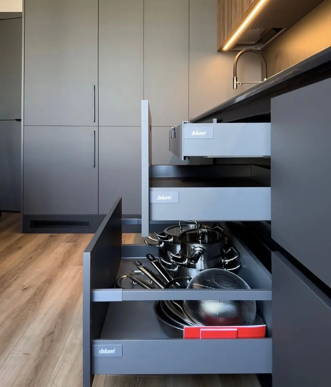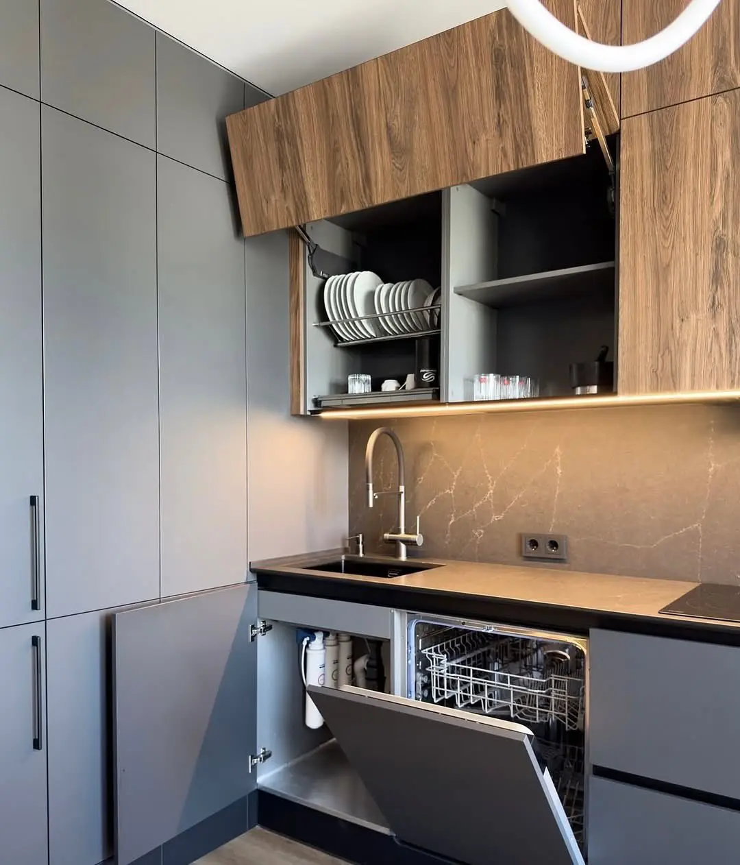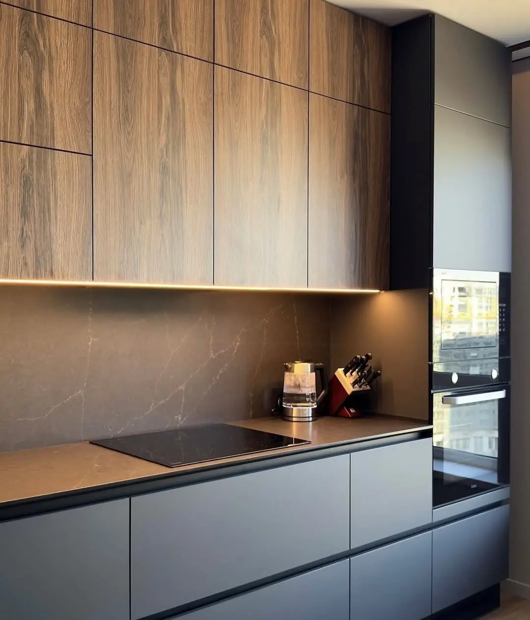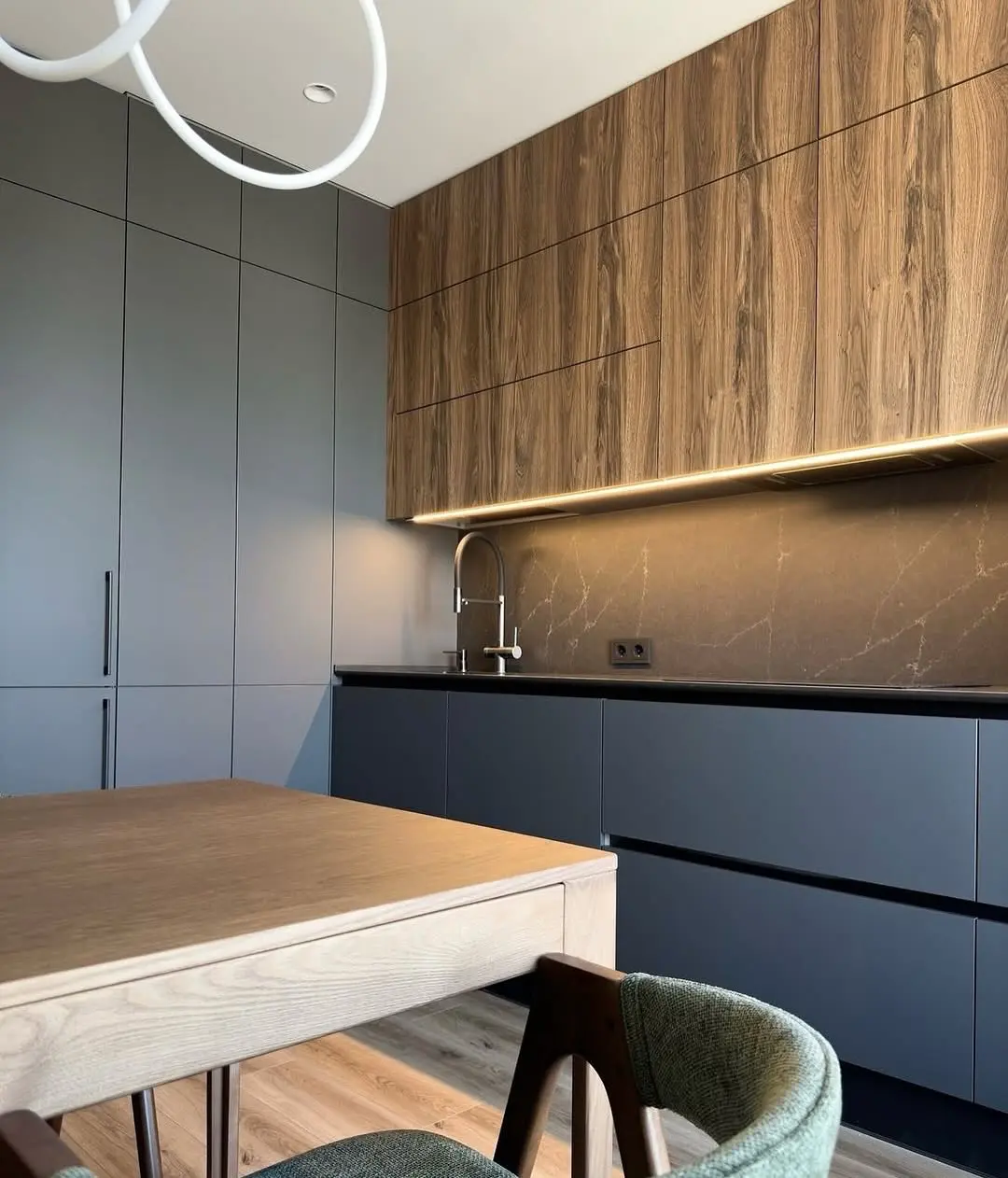 Комбинация серых матовых фасадов и тёплых деревянных панелей создаёт уют и визуальное равновесие.