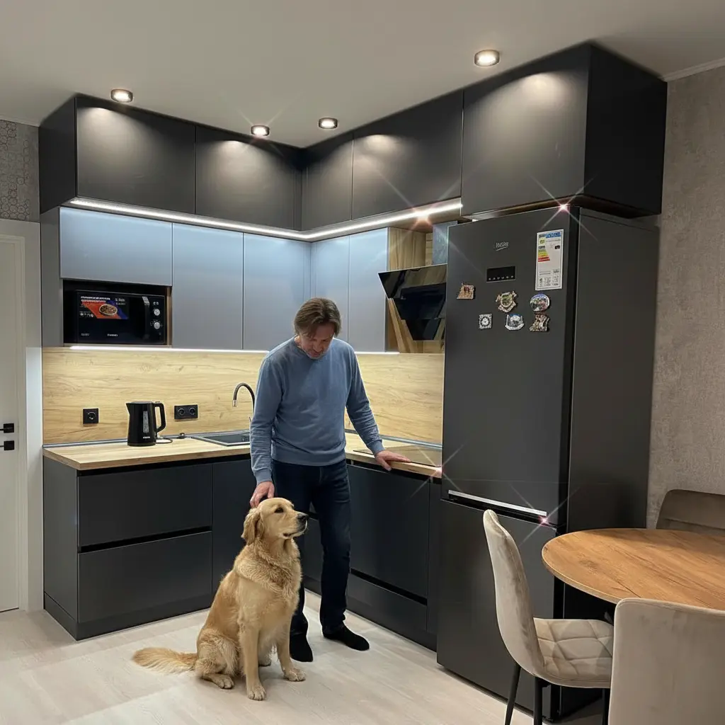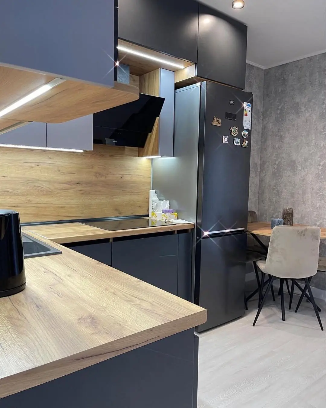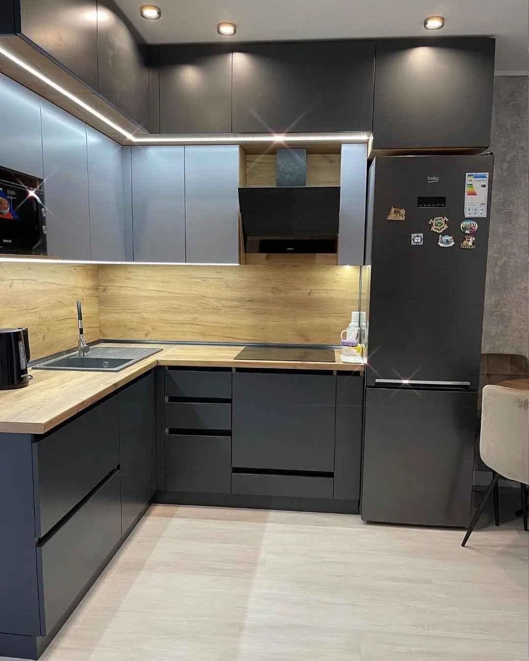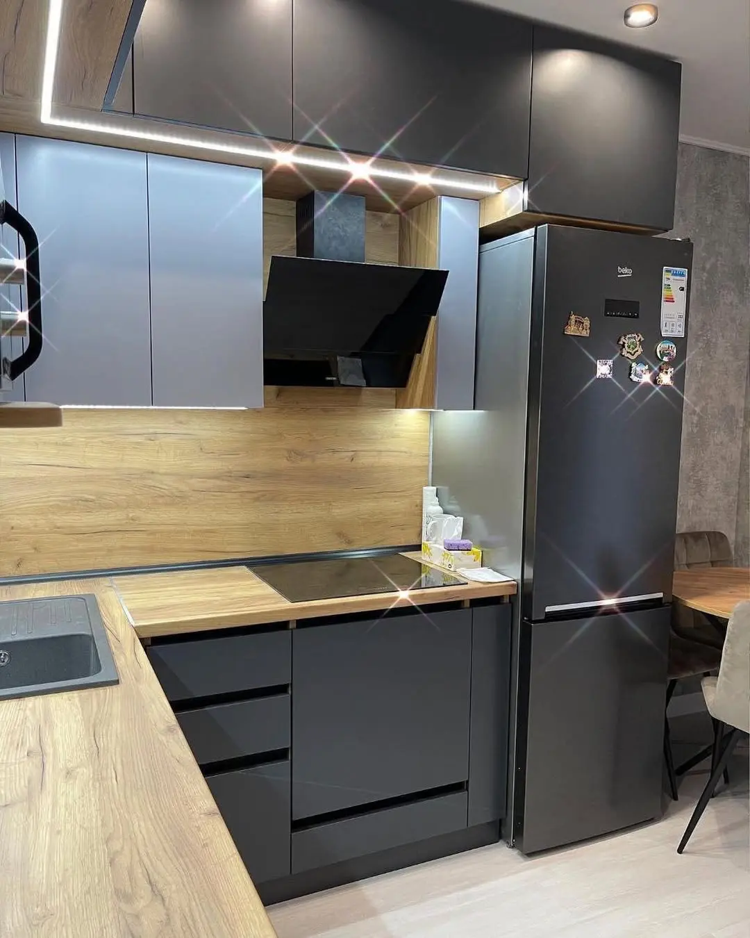 Кухня Градо сочетает глубокий графитовый матовый оттенок и выразительную древесную текстуру. Лаконичный дизайн подчеркивает минимализм интерьера, а удобная эргономика делает кухню максимально функциональной. Тёплая столешница под дерево создаёт уют, а фурнитура Firmax обеспечивает плавное и надёжное открывание.