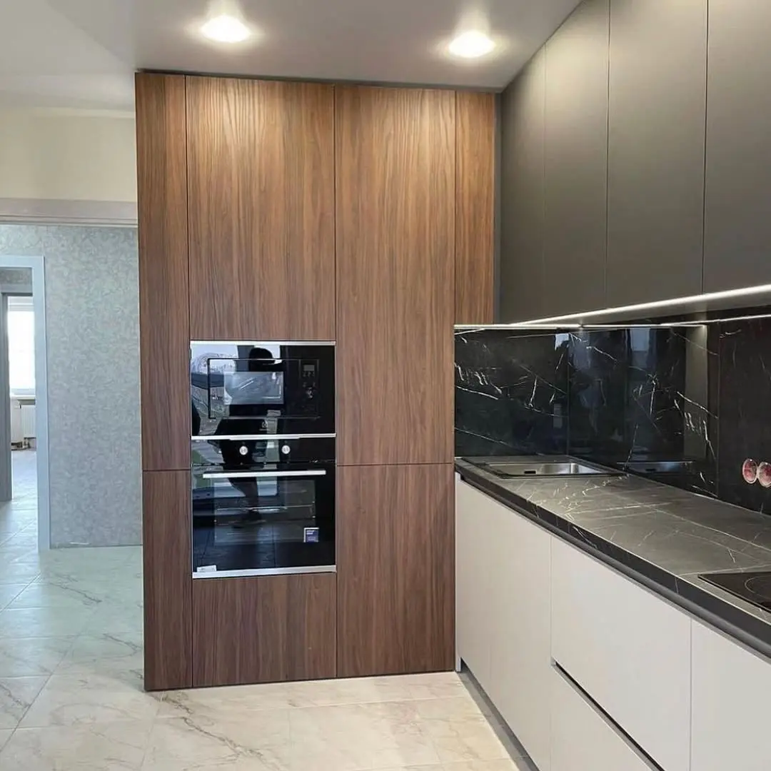 Кухня Куарцо — стильное воплощение современного дизайна с утончёнными акцентами. Контраст серых и чёрных фасадов в сочетании с тёплой деревянной текстурой создаёт атмосферу комфорта и изысканности. Мраморная столешница из искусственного камня подчёркивает премиальный характер интерьера, а фурнитура Blum гарантирует долговечность и плавность работы всех механизмов.