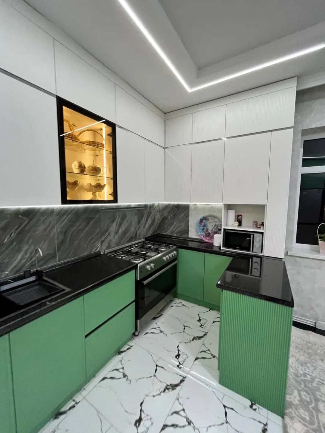 Мраморно-чёрная столешница придаёт интерьеру благородство, а встроенная подсветка витрин подчёркивает изысканный характер кухни.