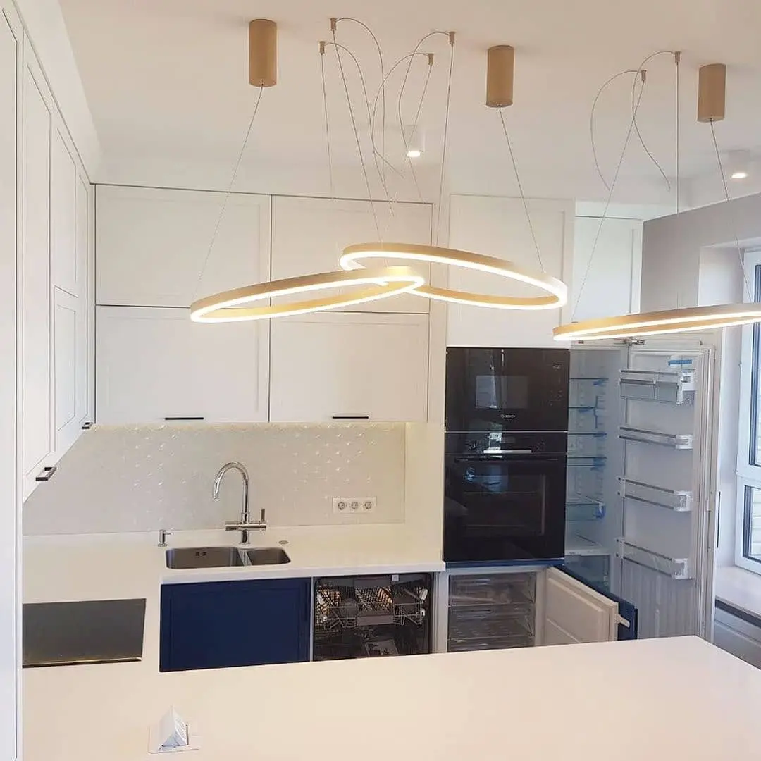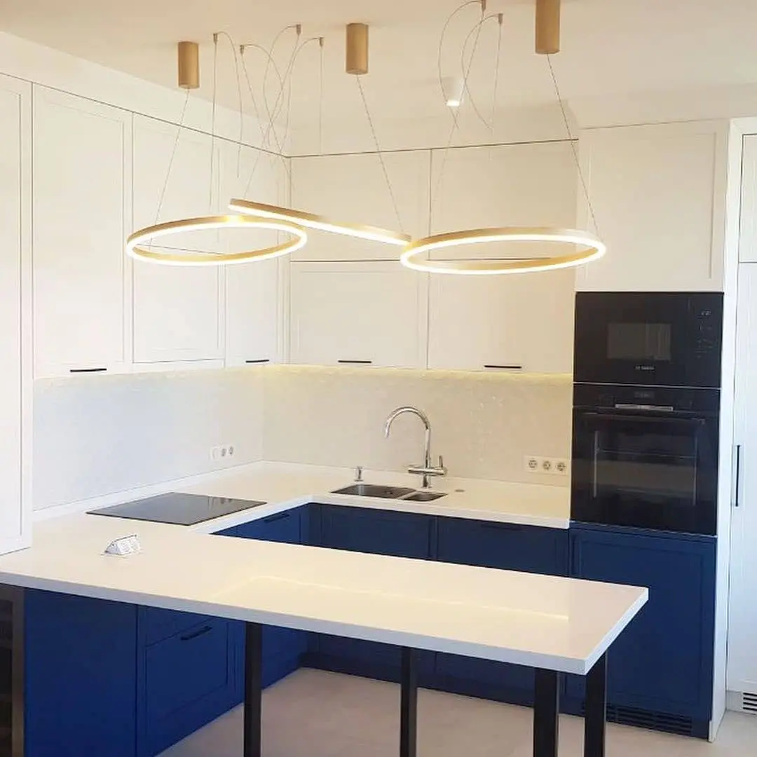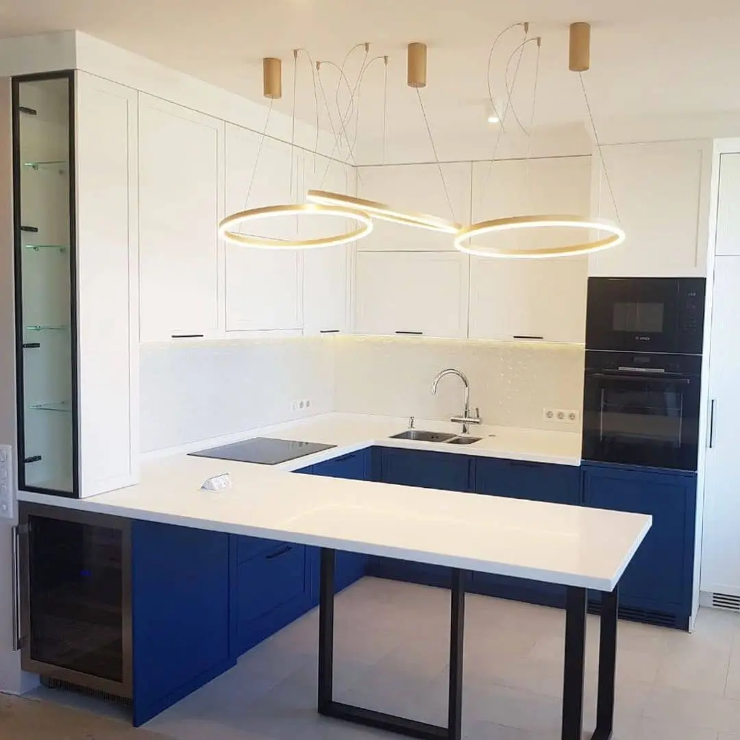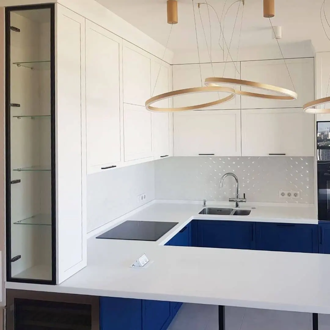 Контраст глубокого лазурного цвета и белых фасадов создаёт элегантный и динамичный образ, а барная стойка добавляет функциональности и уюта.