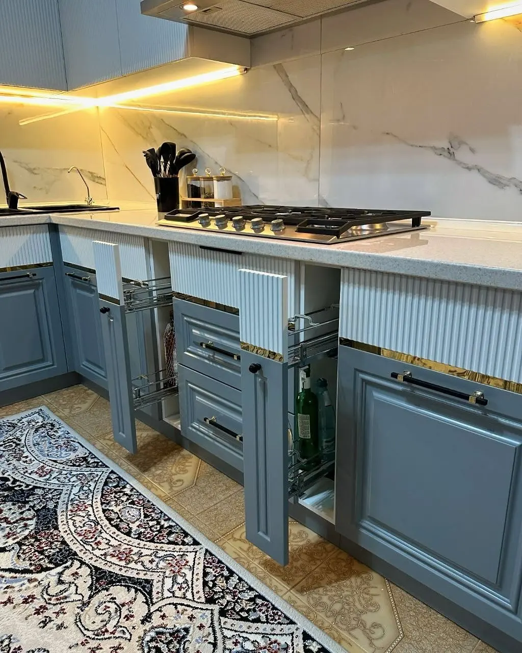 Серые фасады с фрезеровкой подчёркивают изящество форм, а фартук под мрамор и подсветка создают атмосферу уюта и утончённости.