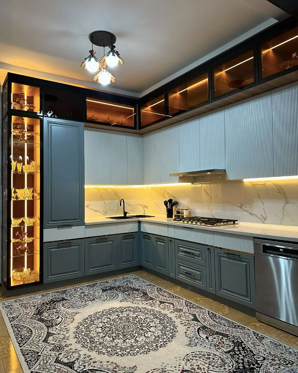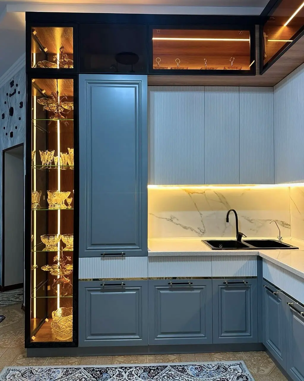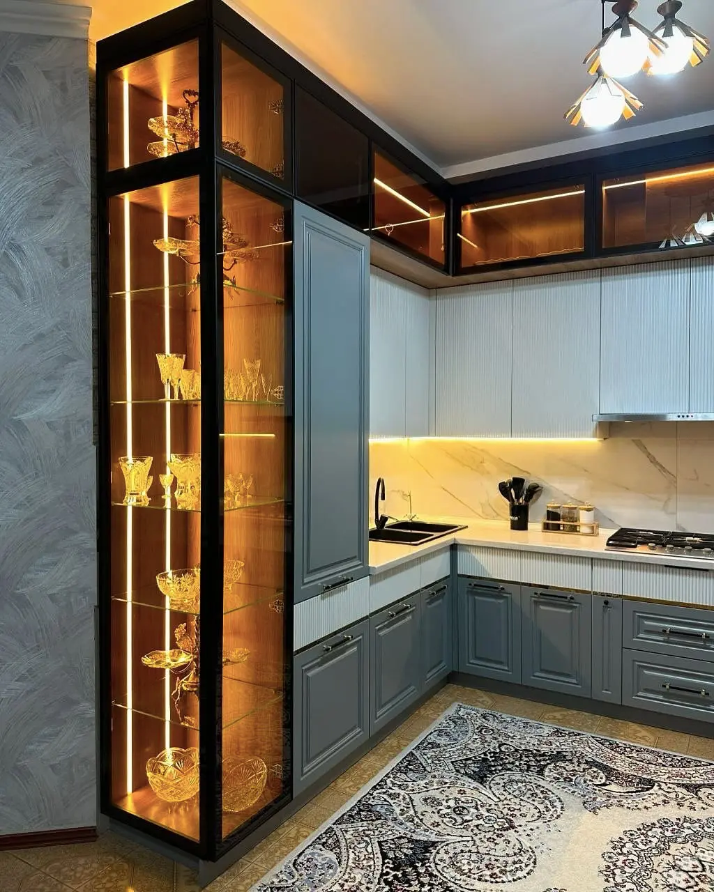 Стеклянные витрины с подсветкой добавляют лёгкость и визуальное пространство.