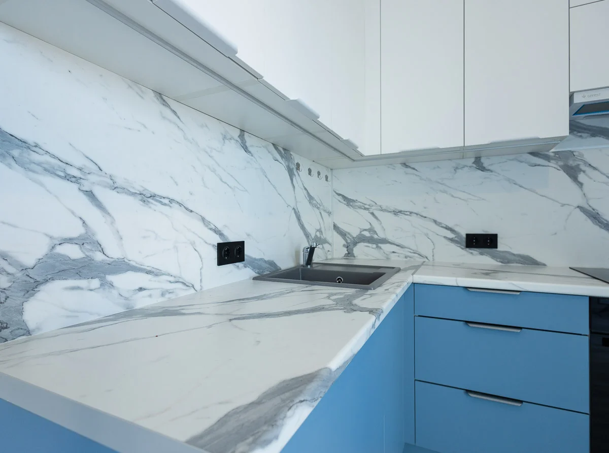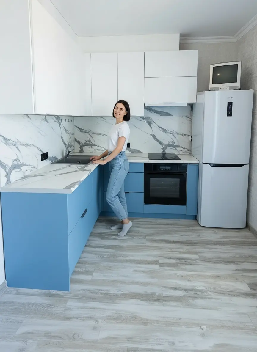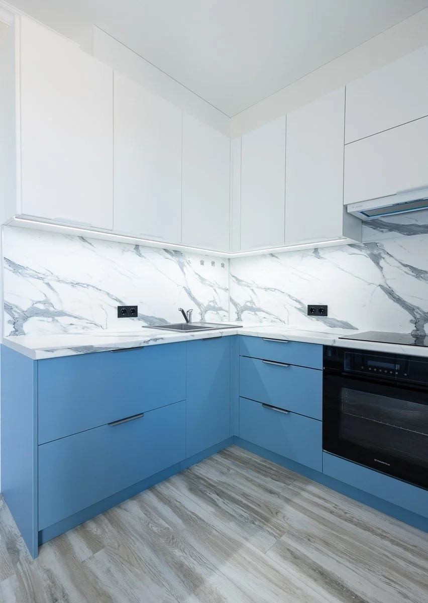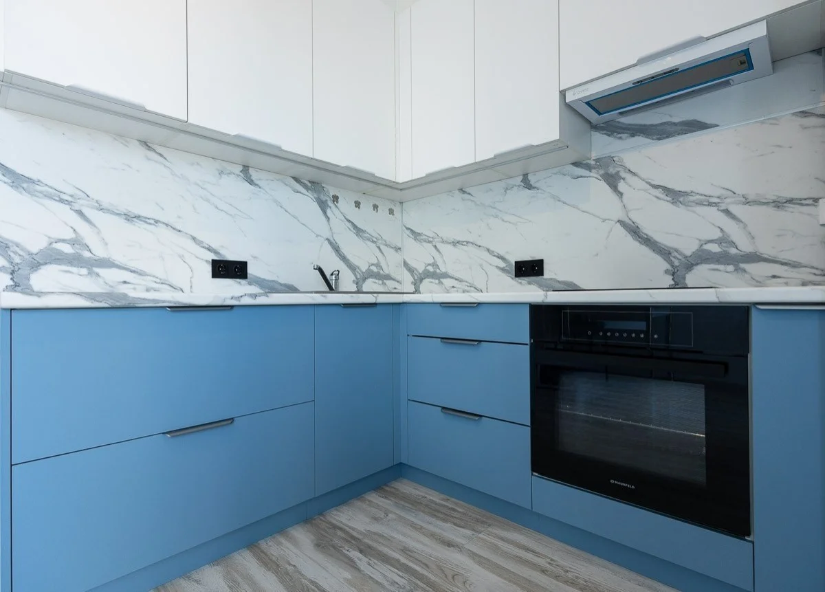 Кухня Ливорно — лёгкость, свежесть и гармония в одном пространстве. Белоснежные верхние фасады в сочетании с голубым низом создают ощущение воздушности, а глянцевая поверхность отражает свет, делая помещение визуально больше. Фурнитура Blum обеспечивает плавность и долговечность в эксплуатации, а столешница под белый мрамор придаёт интерьеру нотку изысканности.