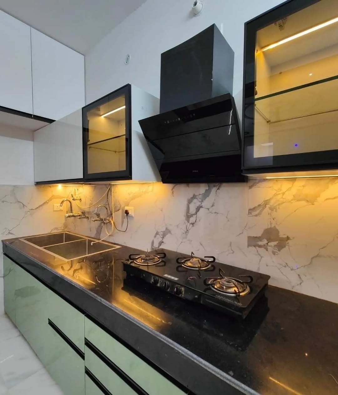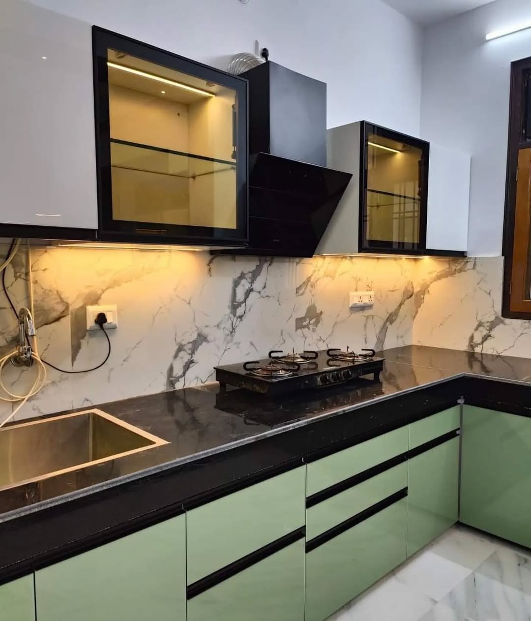 Глянцевые фасады создают эффект глубины, а мраморный фартук придаёт интерьеру утончённость.