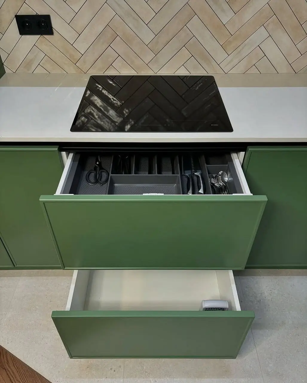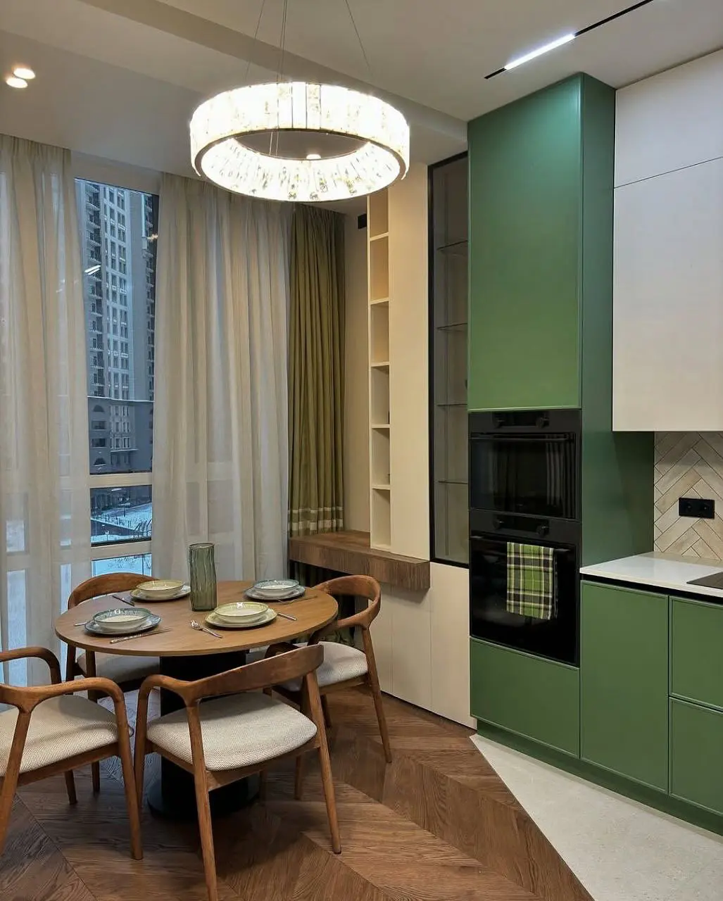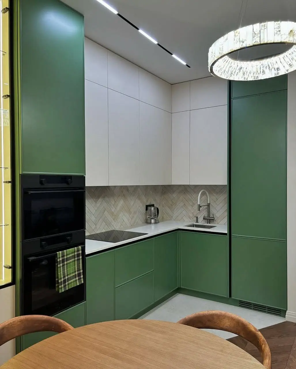 Зелёные фасады придают интерьеру свежесть, а белые шкафы добавляют света и визуального простора.