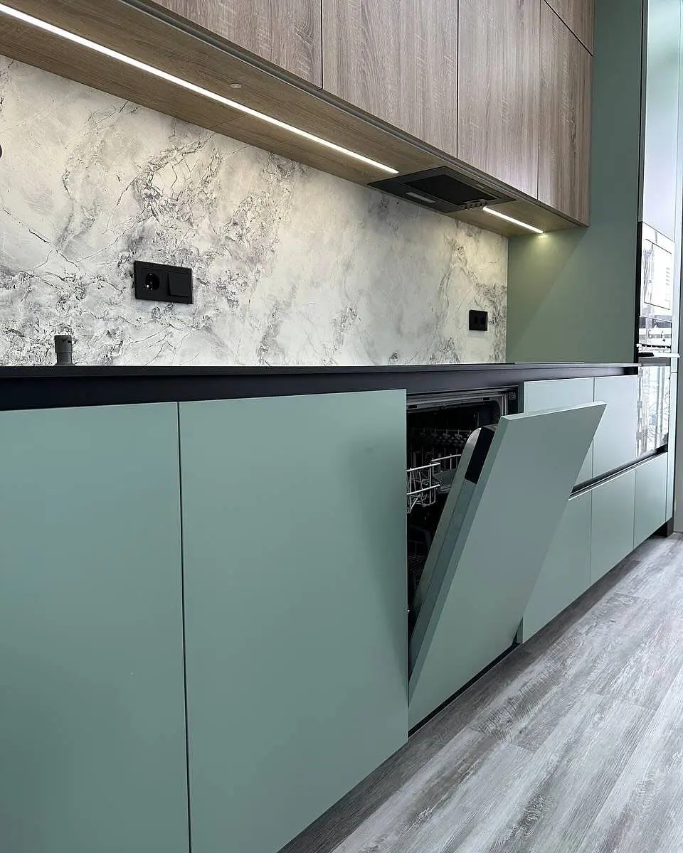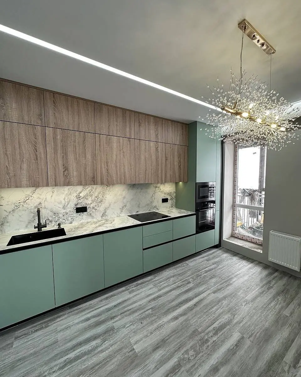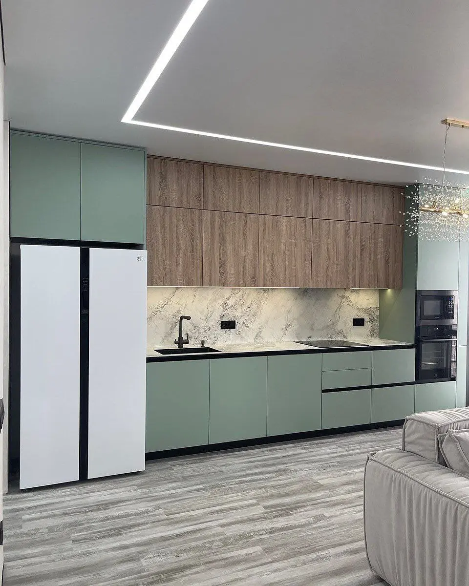 Сочетание светло-зелёных фасадов с текстурой натурального дерева создаёт атмосферу свежести и комфорта.