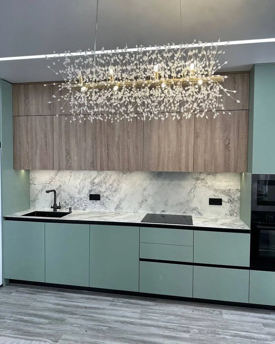 Фартук под мрамор и встроенная техника подчёркивают утончённый стиль и функциональность.