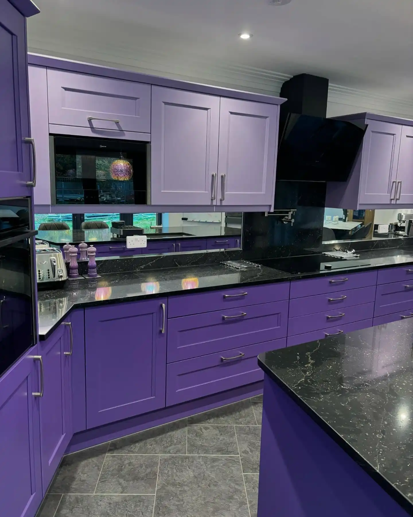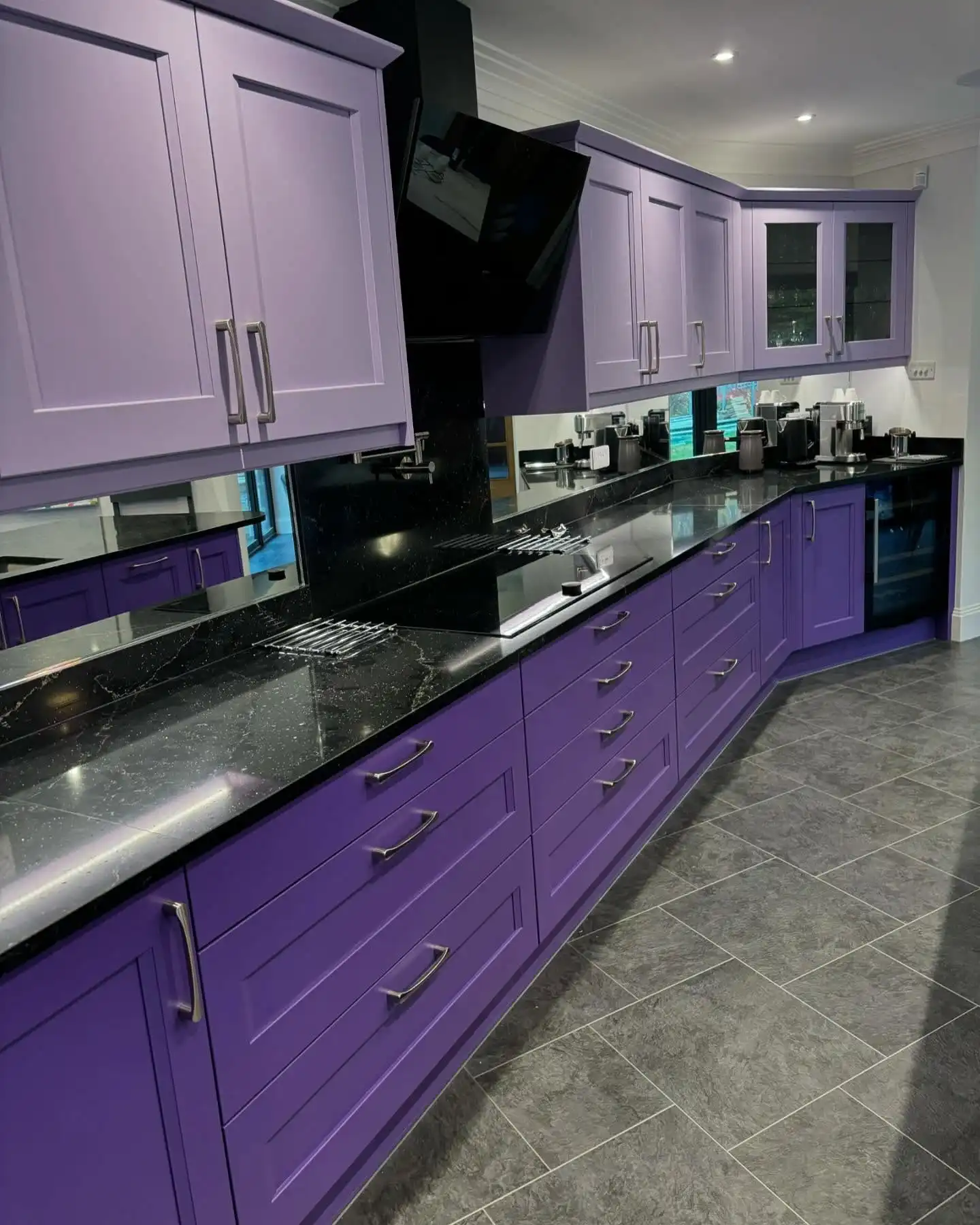 Кухня Мирея выделяется глубокими фиолетовыми тонами и лаконичным современным дизайном. Матовые фасады из МДФ с эмалью гармонируют с черной кварцевой столешницей, создавая выразительный контраст.