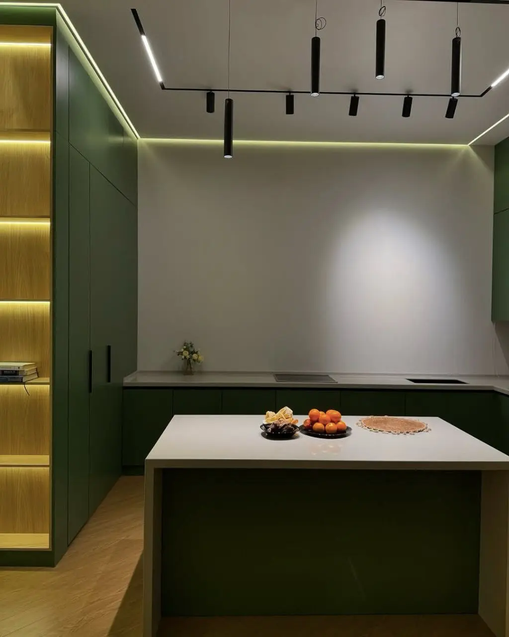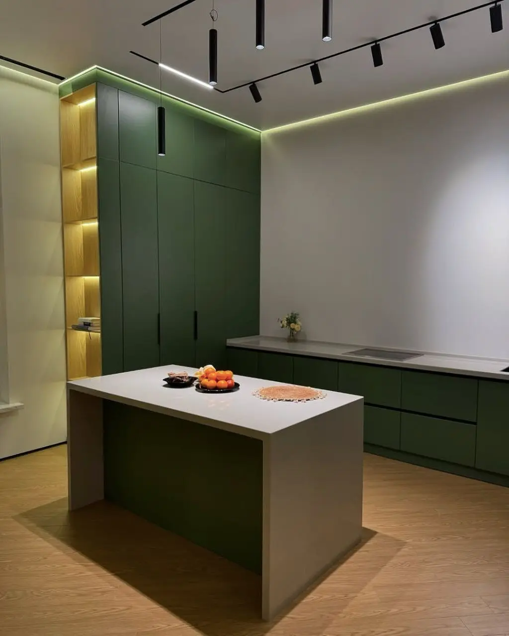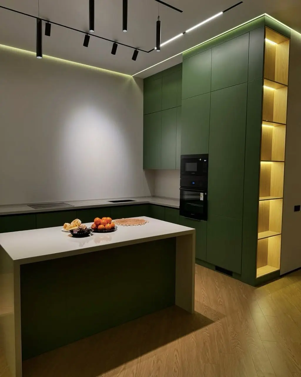 Оливковые фасады с матовым покрытием создают спокойную атмосферу, а встроенная подсветка и светлая кварцевая столешница подчёркивают элегантность.
