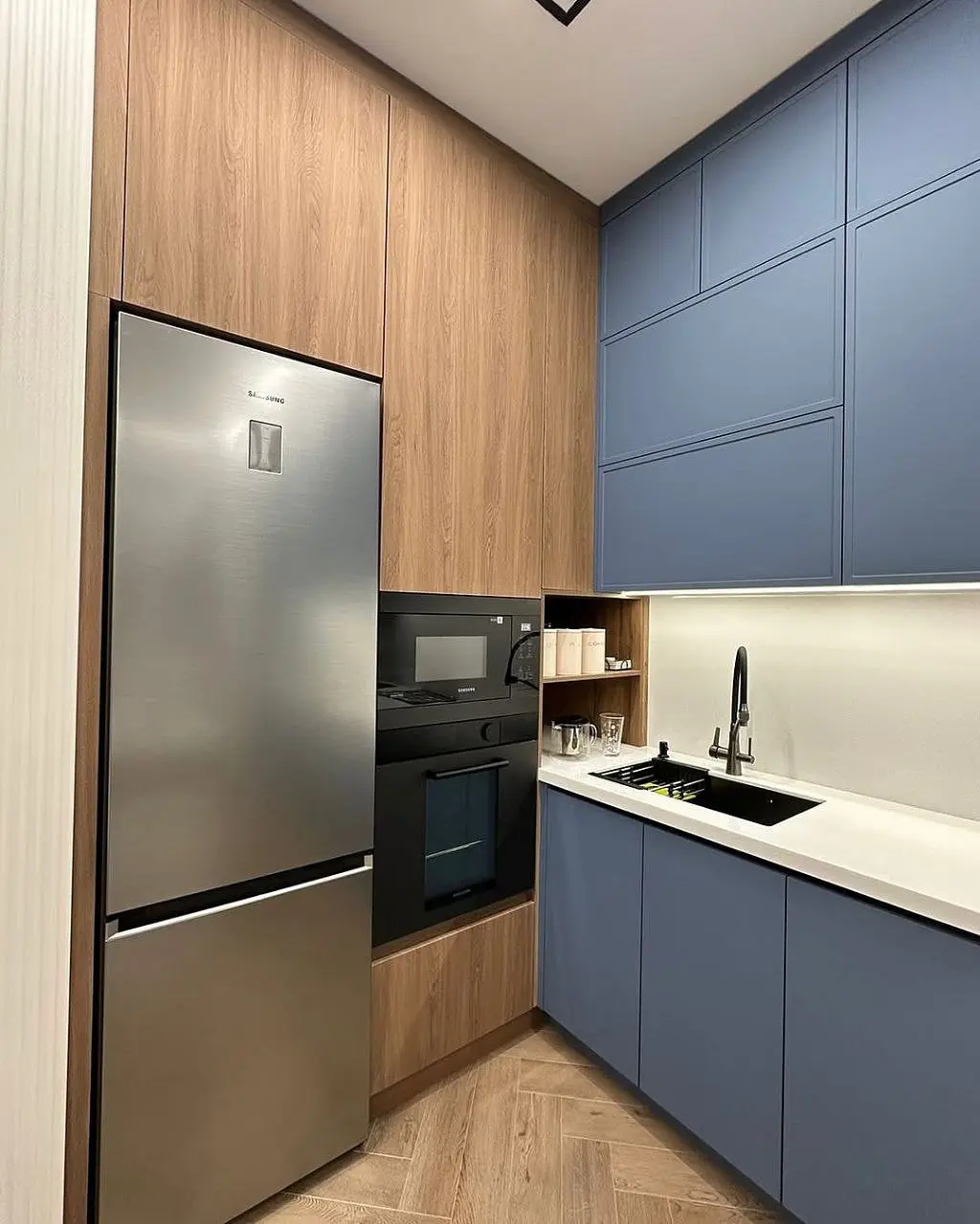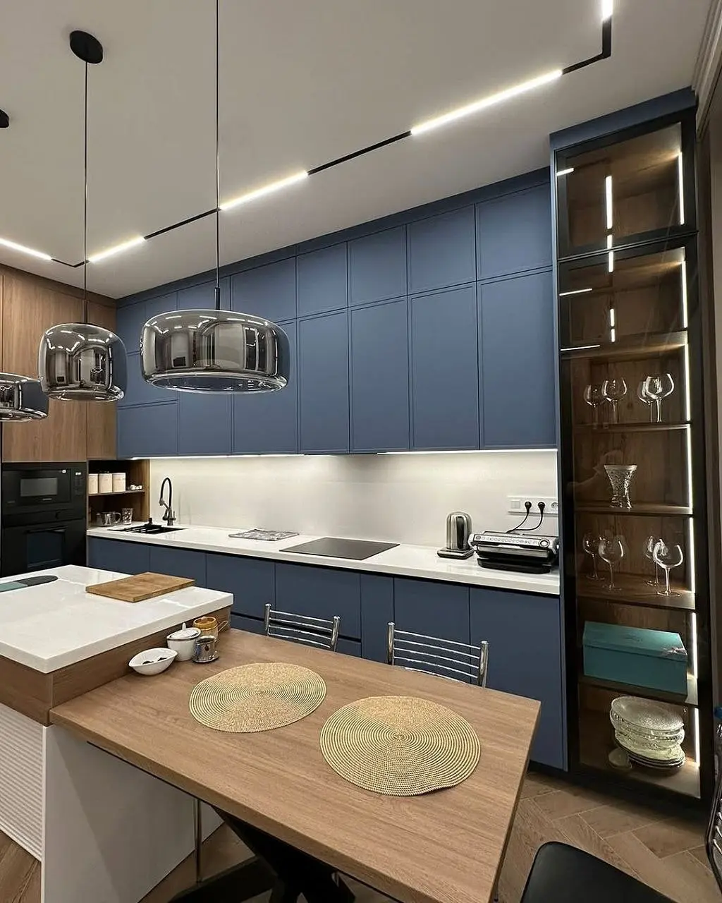 Насыщенный синий цвет в сочетании с натуральным деревом придаёт интерьеру глубину и гармонию.