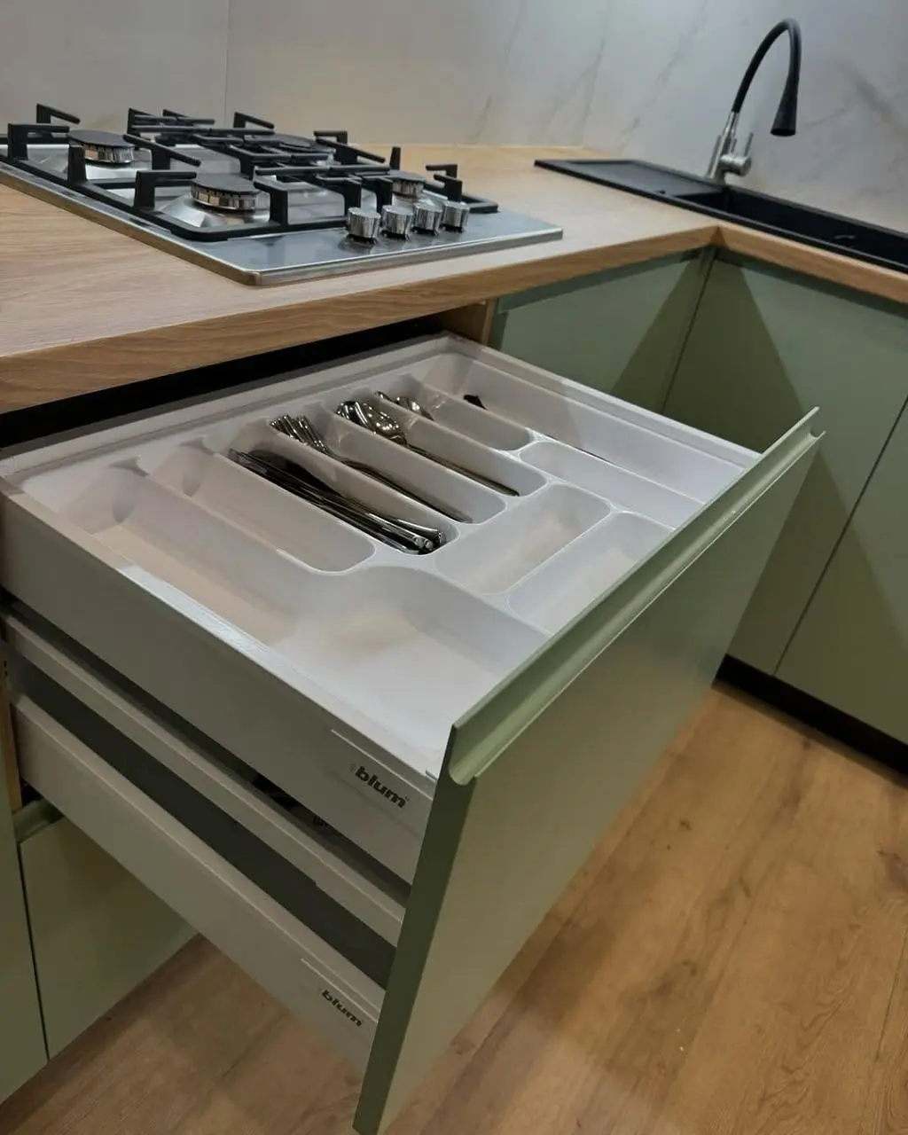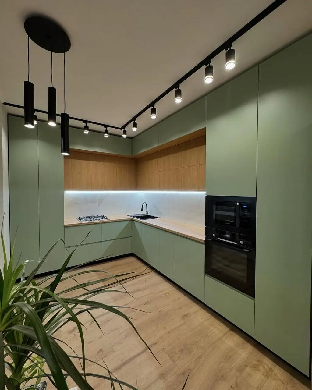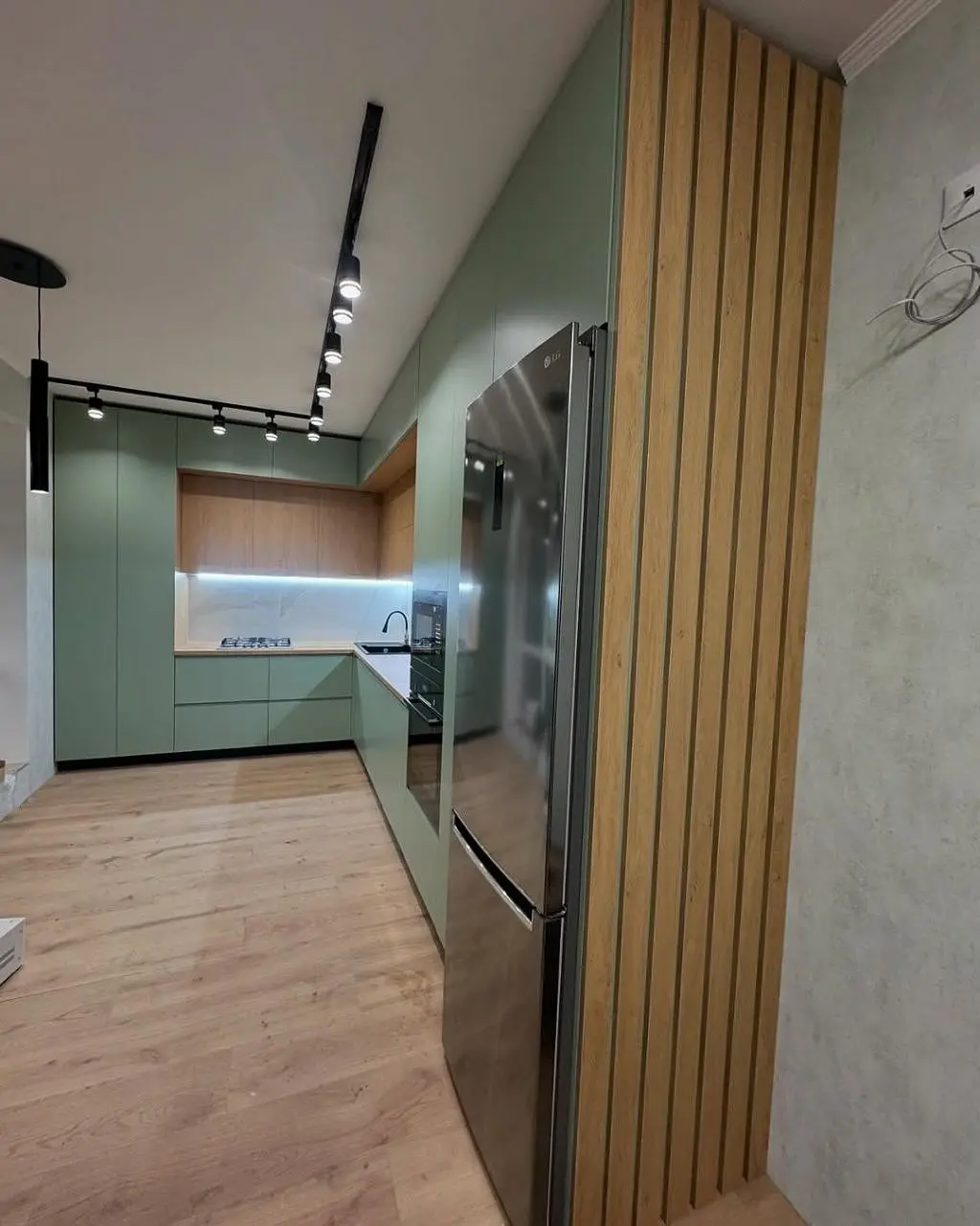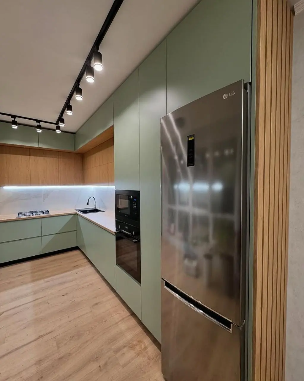 Мягкий зелёный цвет фасадов идеально сочетается с тёплыми деревянными элементами, создавая атмосферу уюта и природного равновесия.