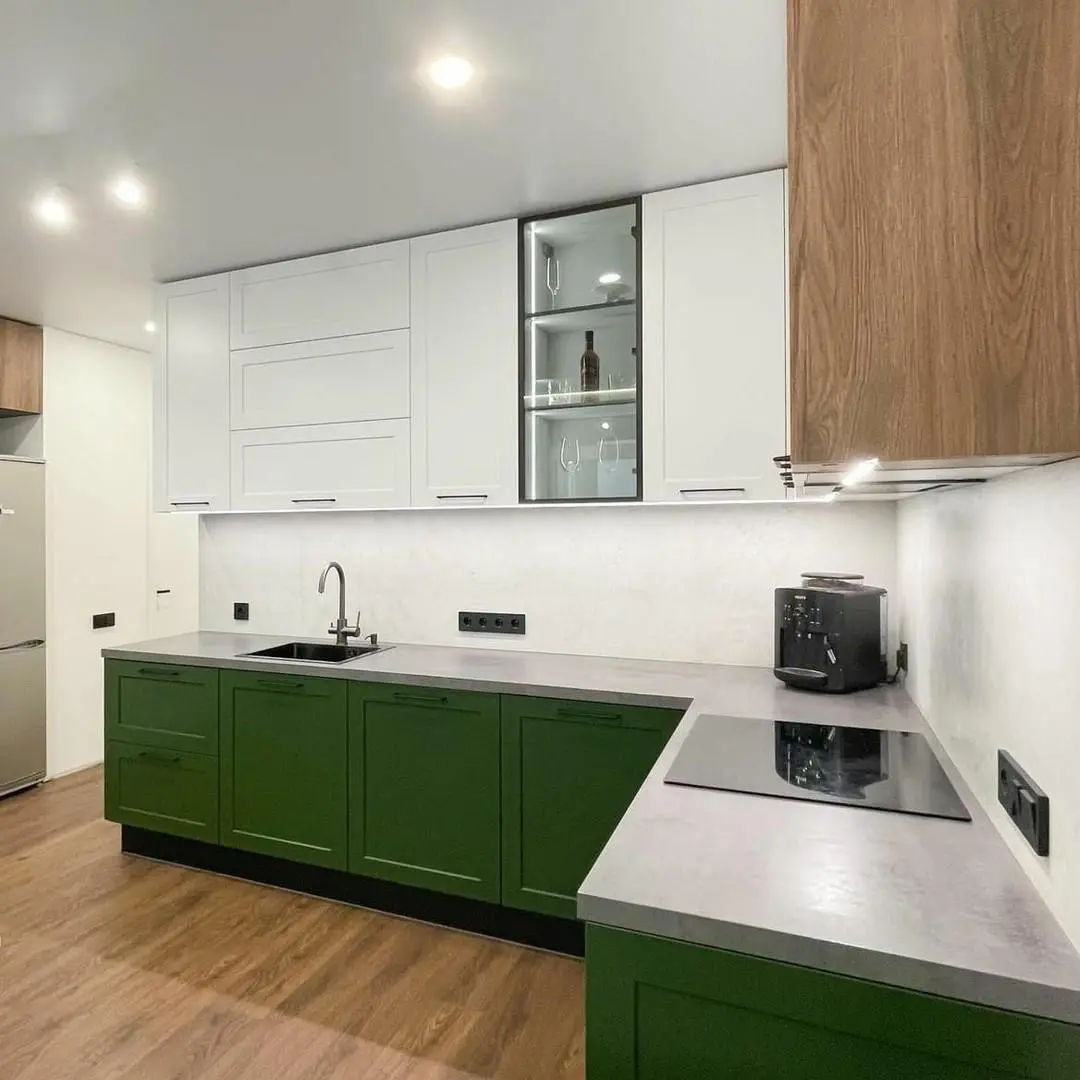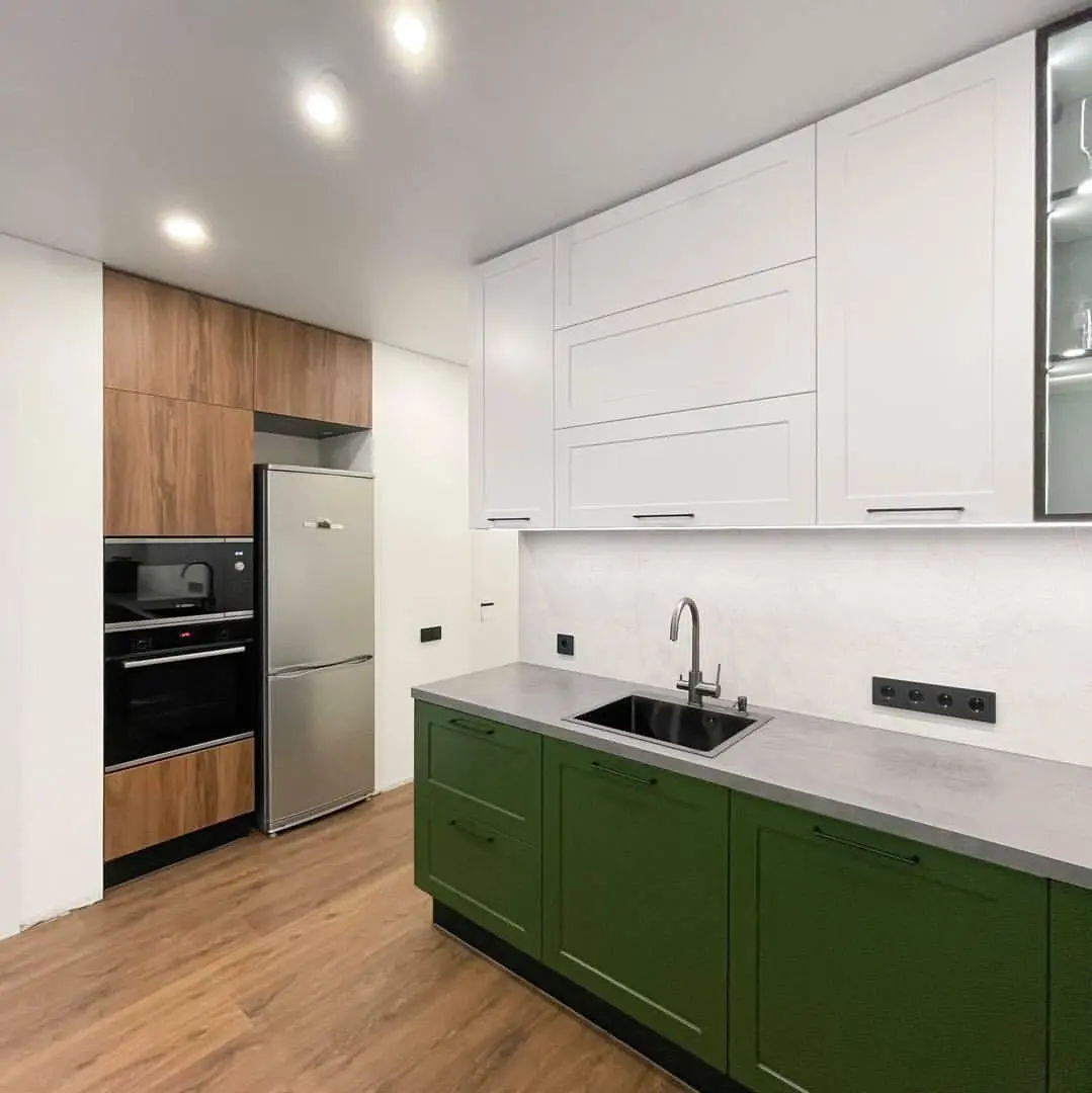 Зелёные нижние фасады придают интерьеру свежесть, а белые верхние шкафы делают пространство светлым и просторным.