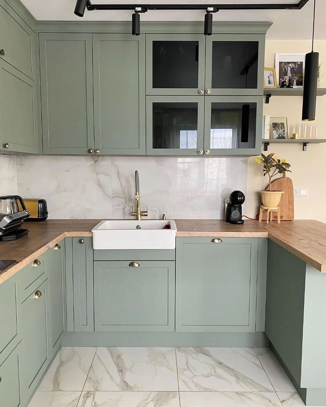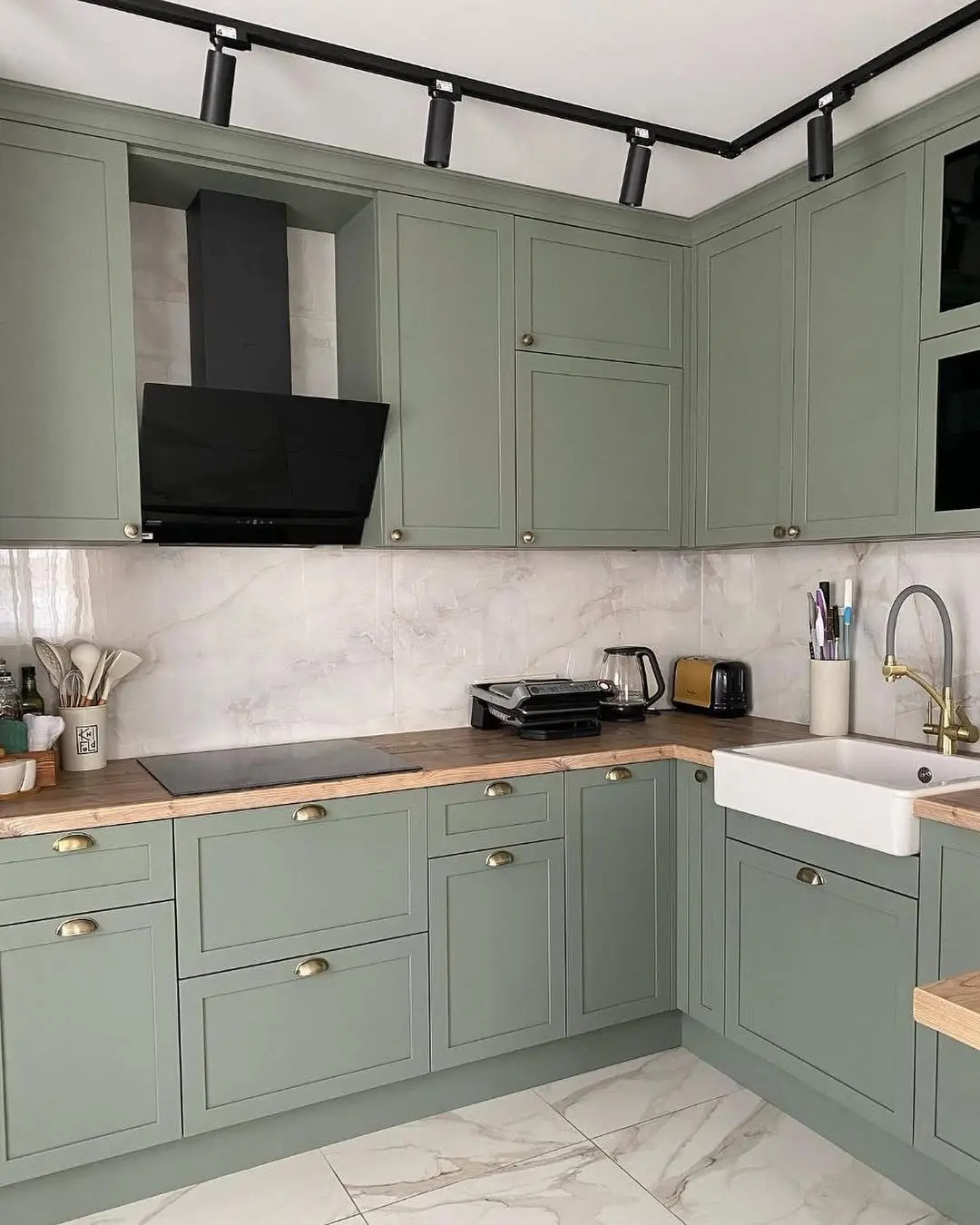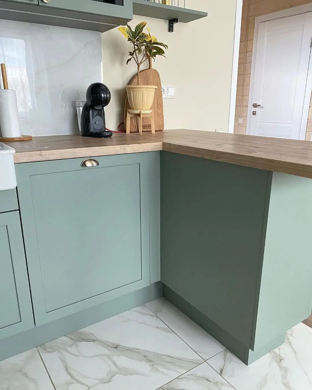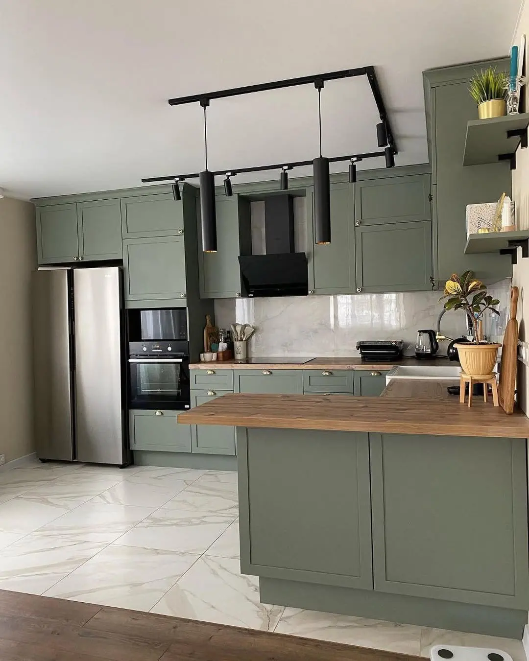 Оливковые фасады с изысканной фрезеровкой сочетаются с деревянной столешницей, создавая уют и спокойствие в пространстве.