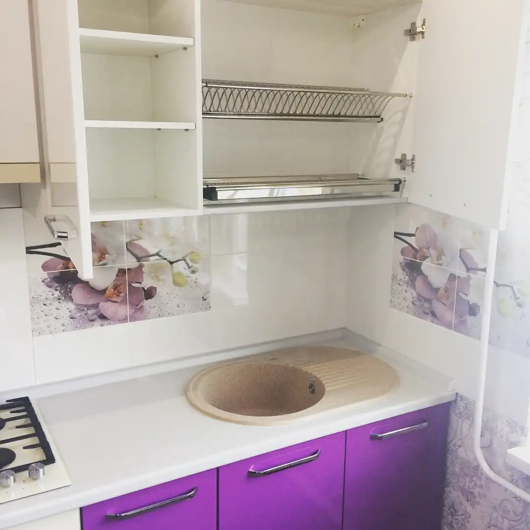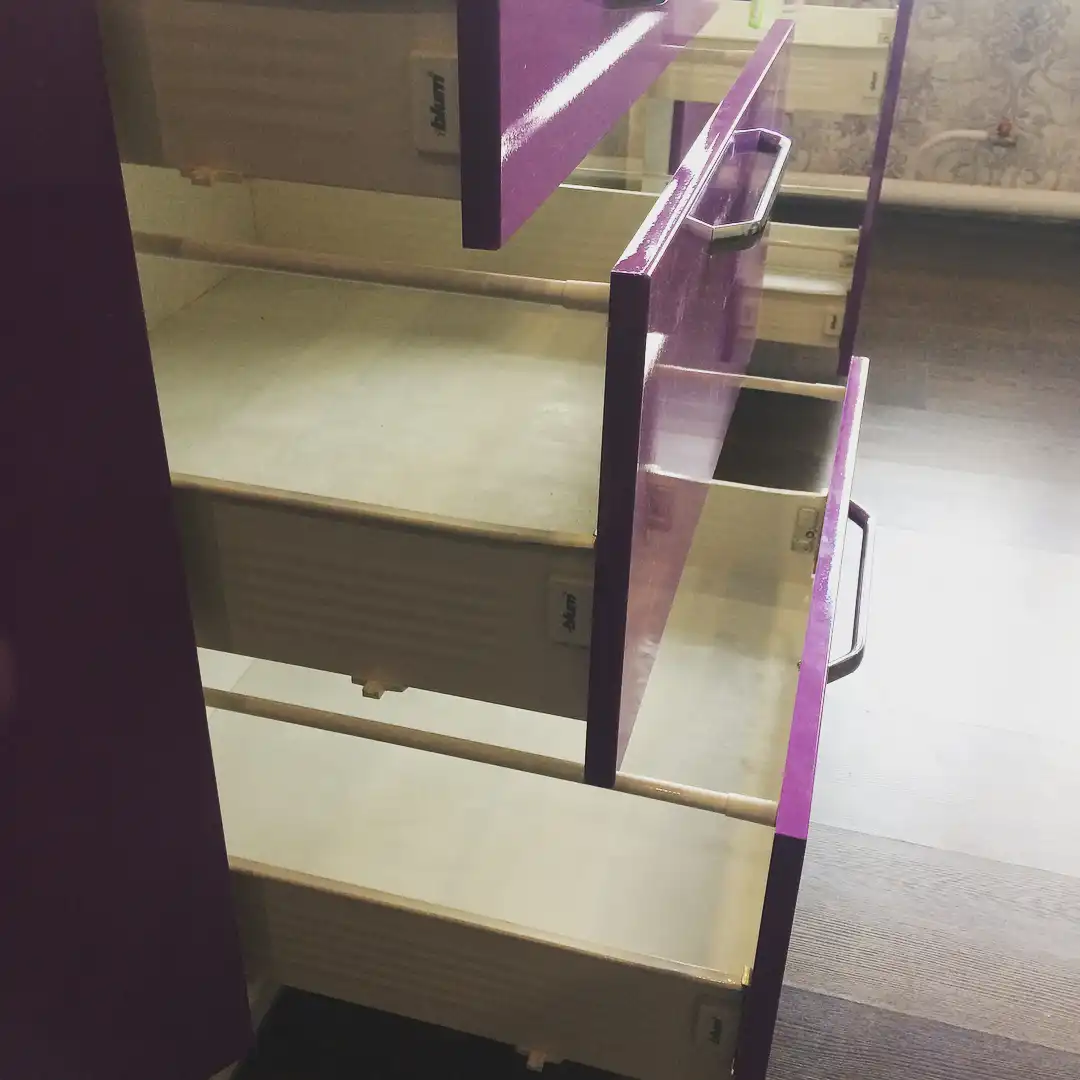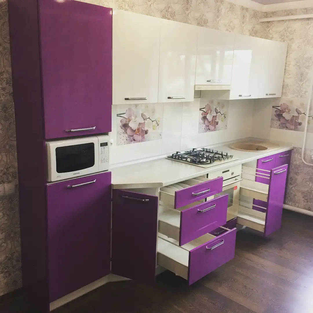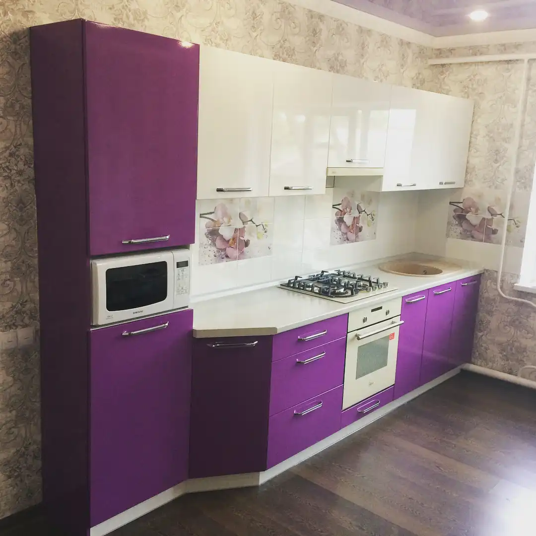Кухня Селеста выполнена в современном сочетании белого и фиолетового оттенков. Глянцевые фасады из МДФ отражают свет и визуально делают помещение просторнее.
