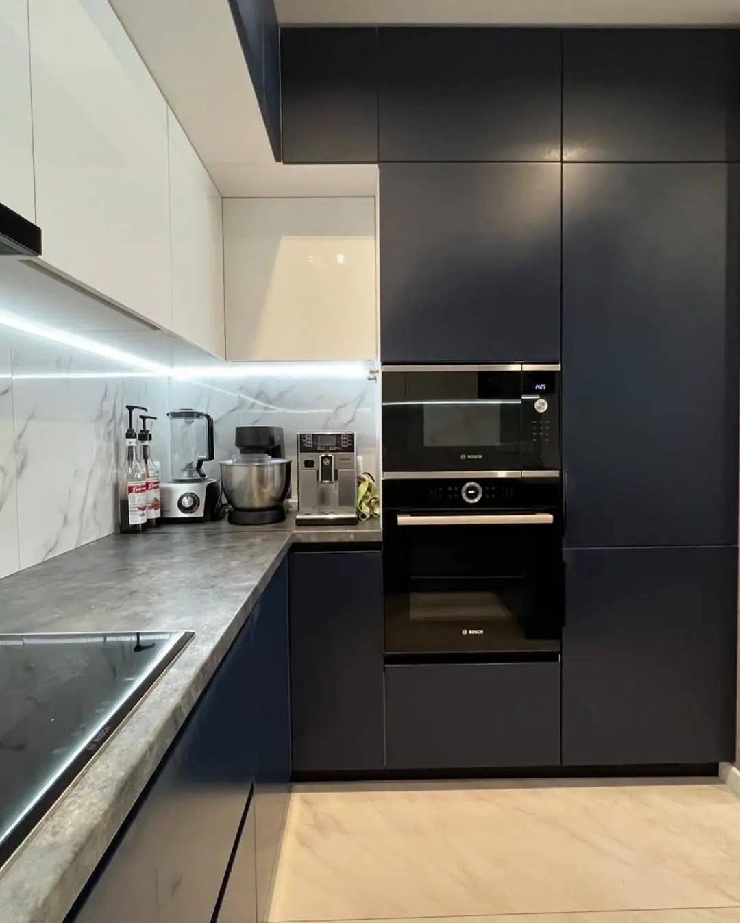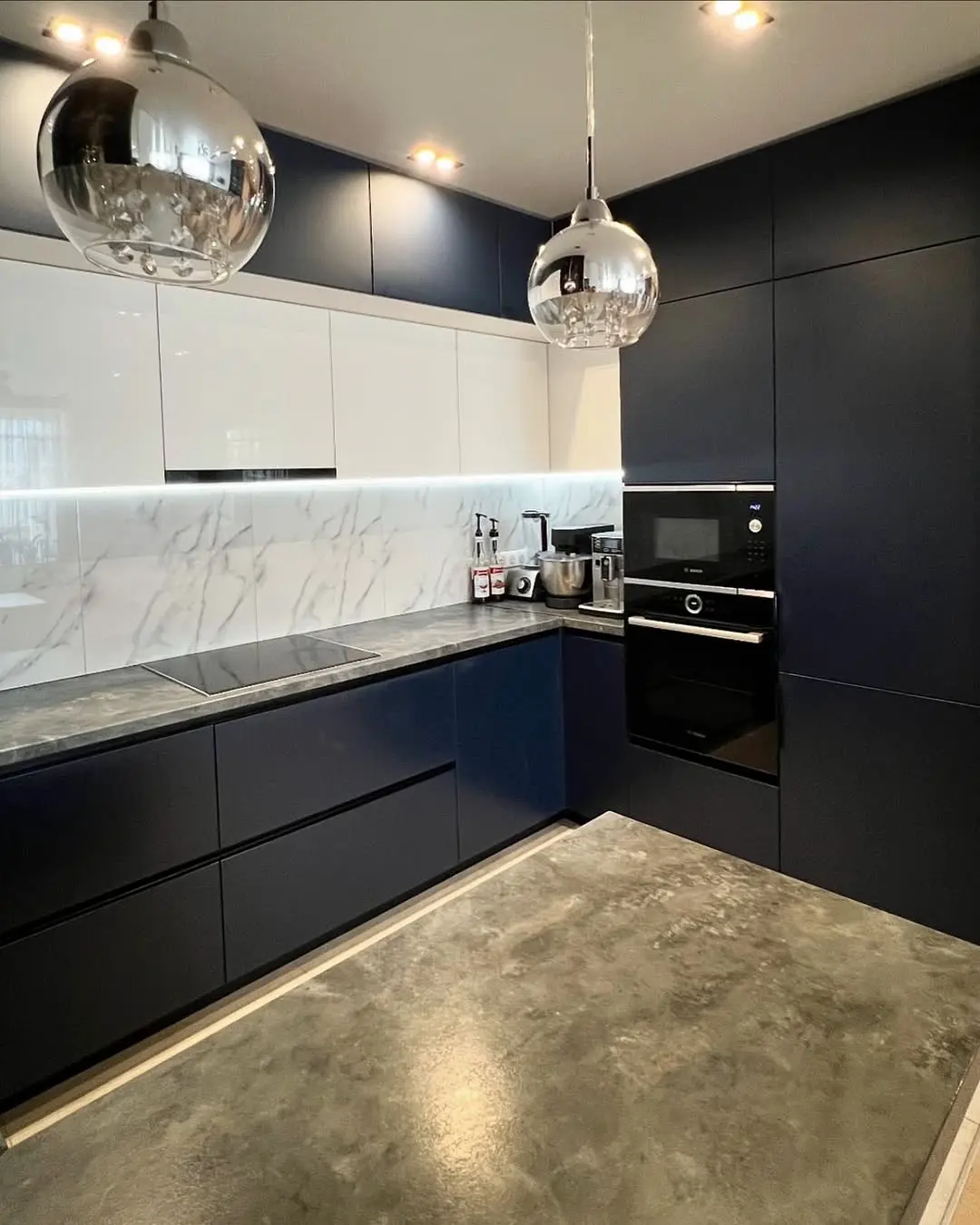 Сочетание глубокого синего цвета и белых глянцевых фасадов создаёт эффект простора и утончённости.
