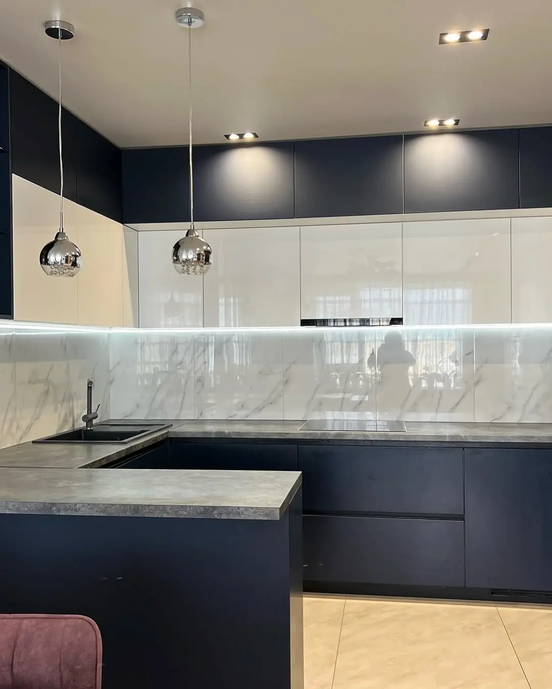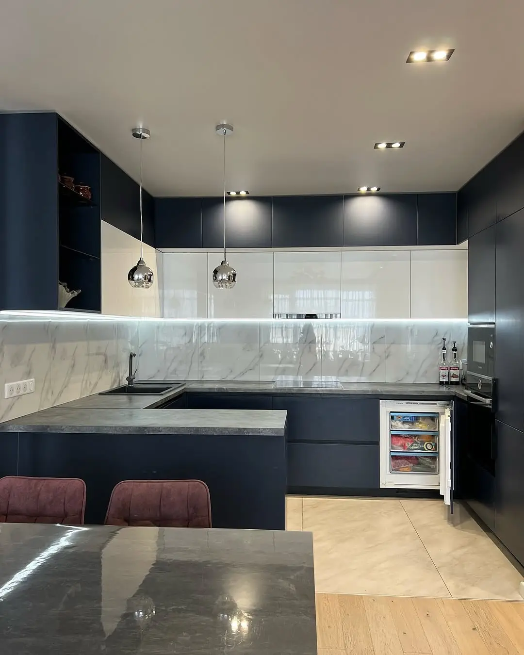 Фартук под мрамор добавляет благородство, а столешница из камня подчёркивает современный характер интерьера.