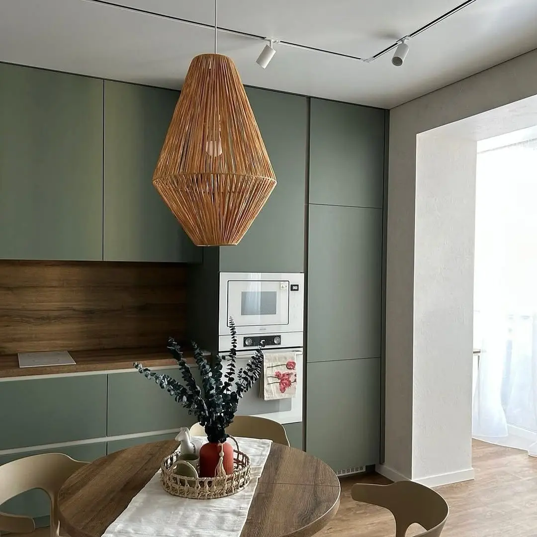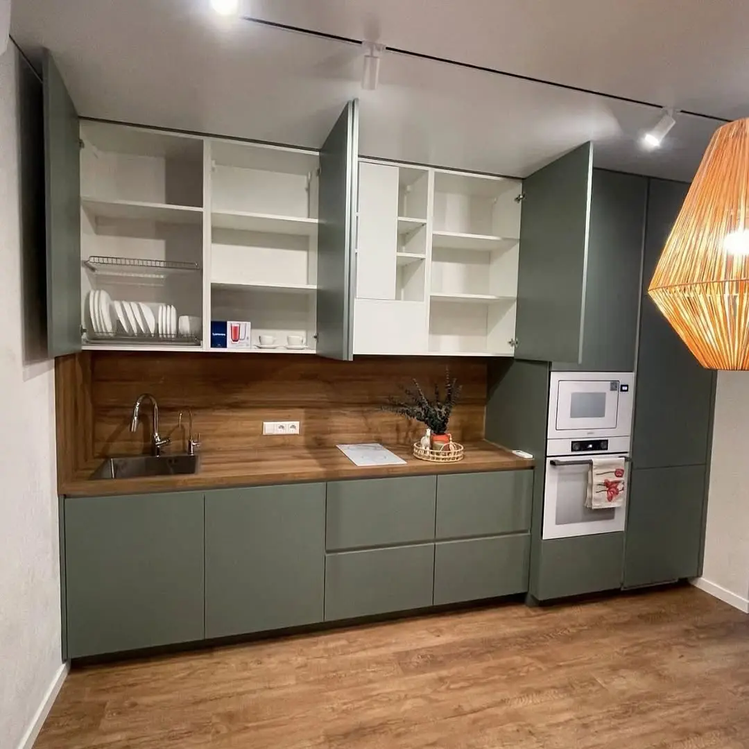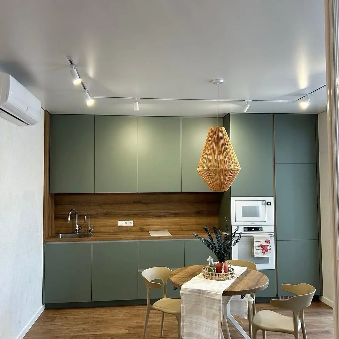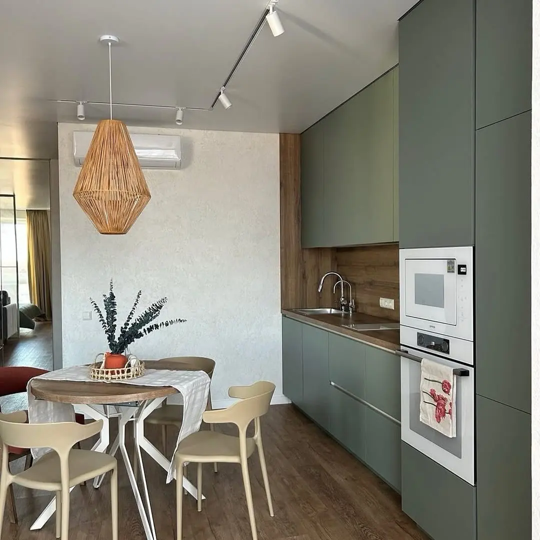 Матовое зелёное покрытие фасадов в сочетании с древесной текстурой создаёт тёплую и спокойную атмосферу.