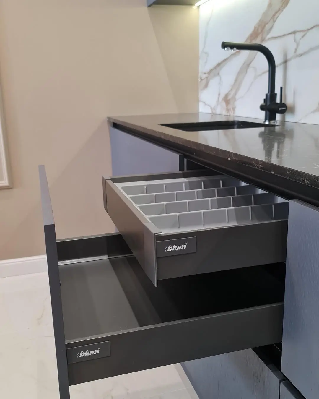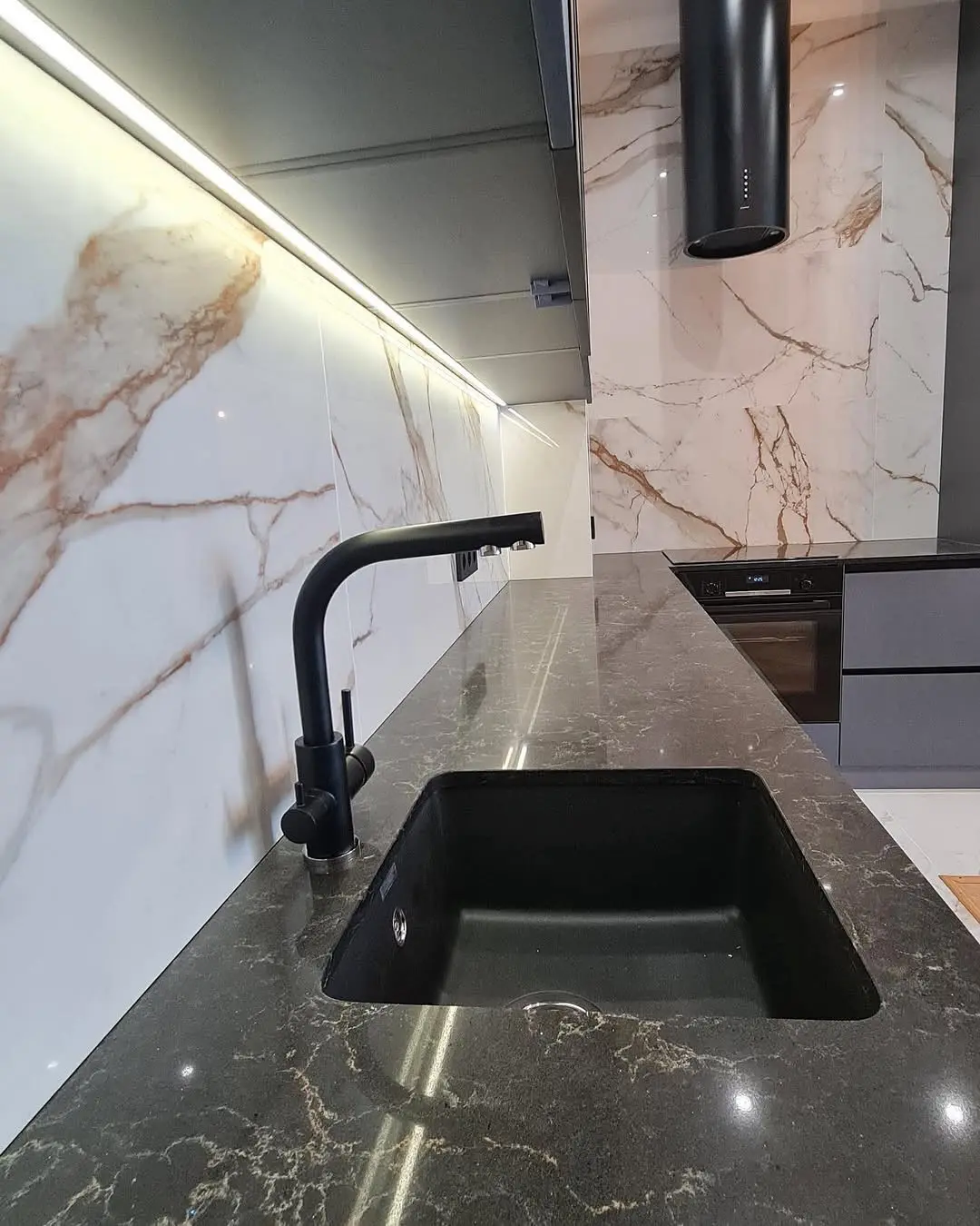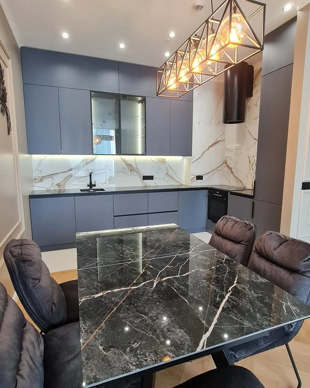 Матовые синие фасады создают ощущение глубины, а фартук под мрамор добавляет благородства интерьеру.