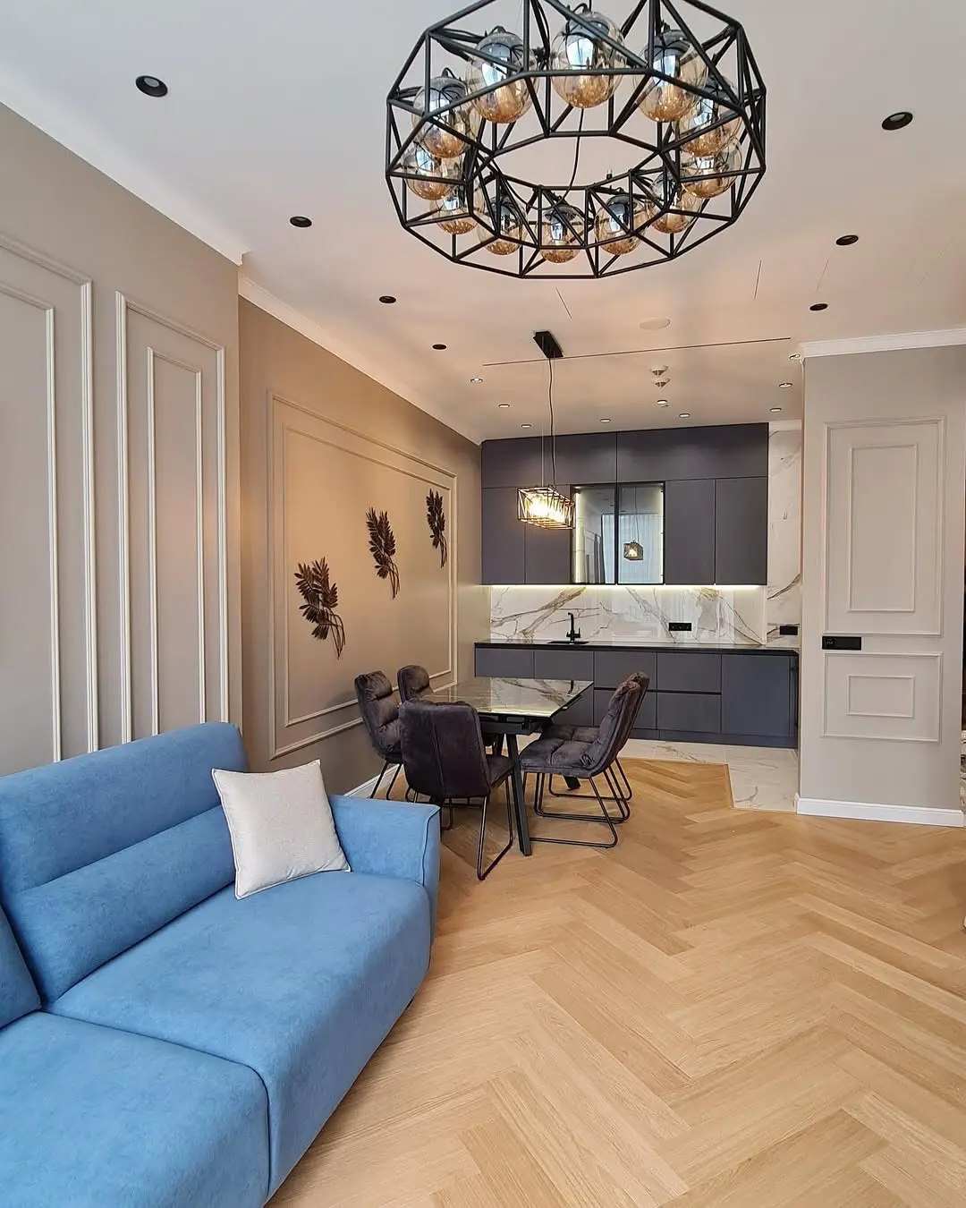 Современное освещение и стеклянные элементы делают дизайн лёгким и изысканным.