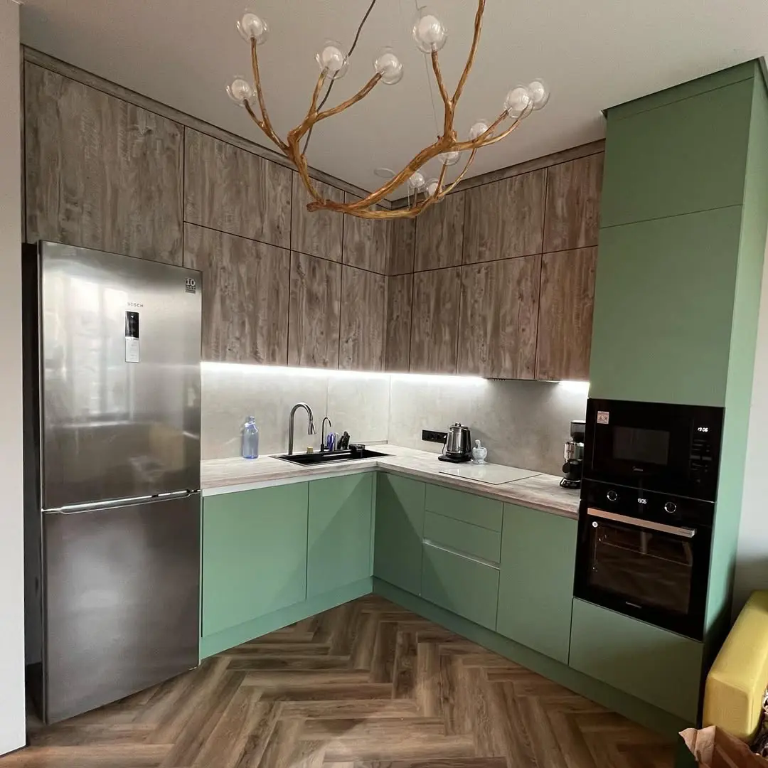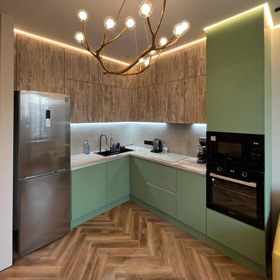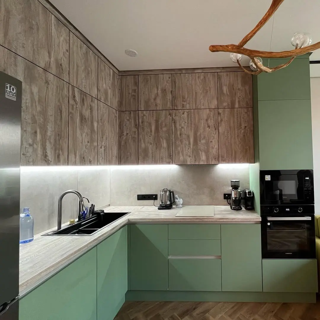Мягкий зелёный оттенок нижних фасадов дополняется текстурой дерева сверху, создавая уютное и сбалансированное пространство.