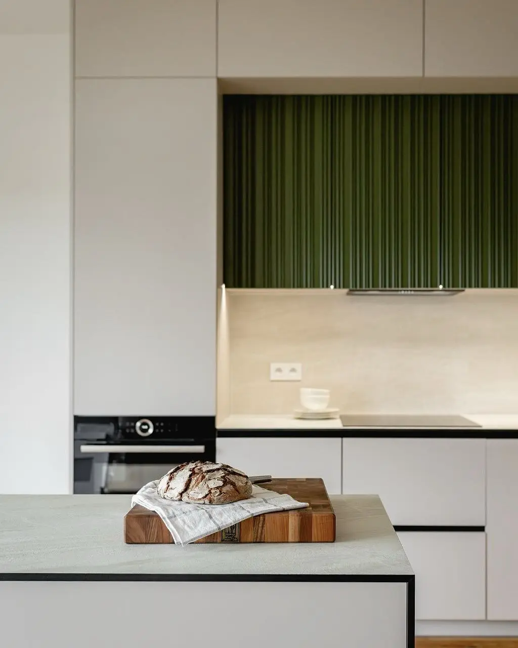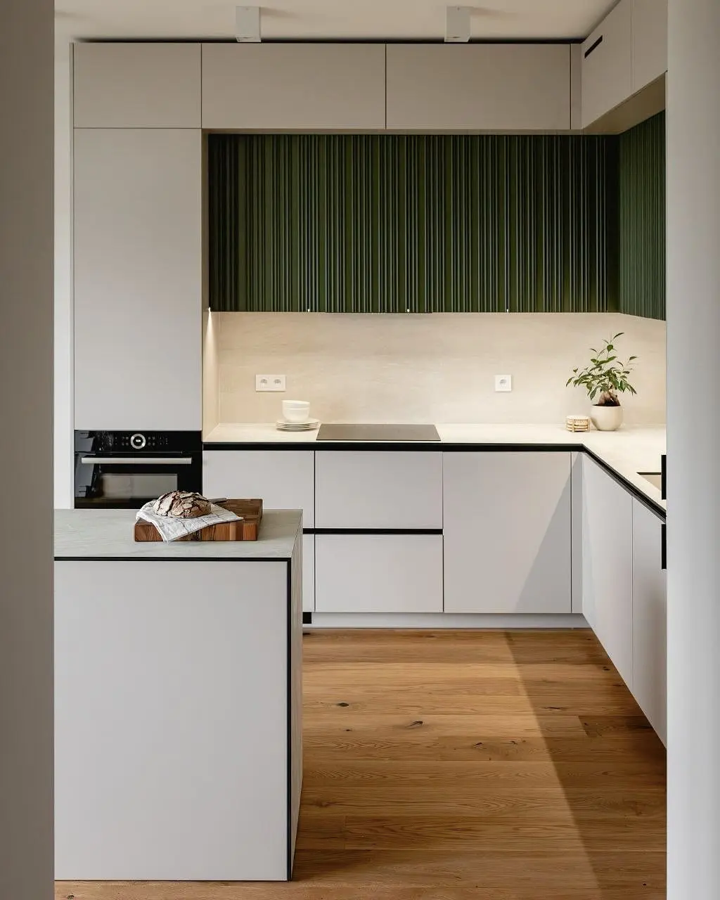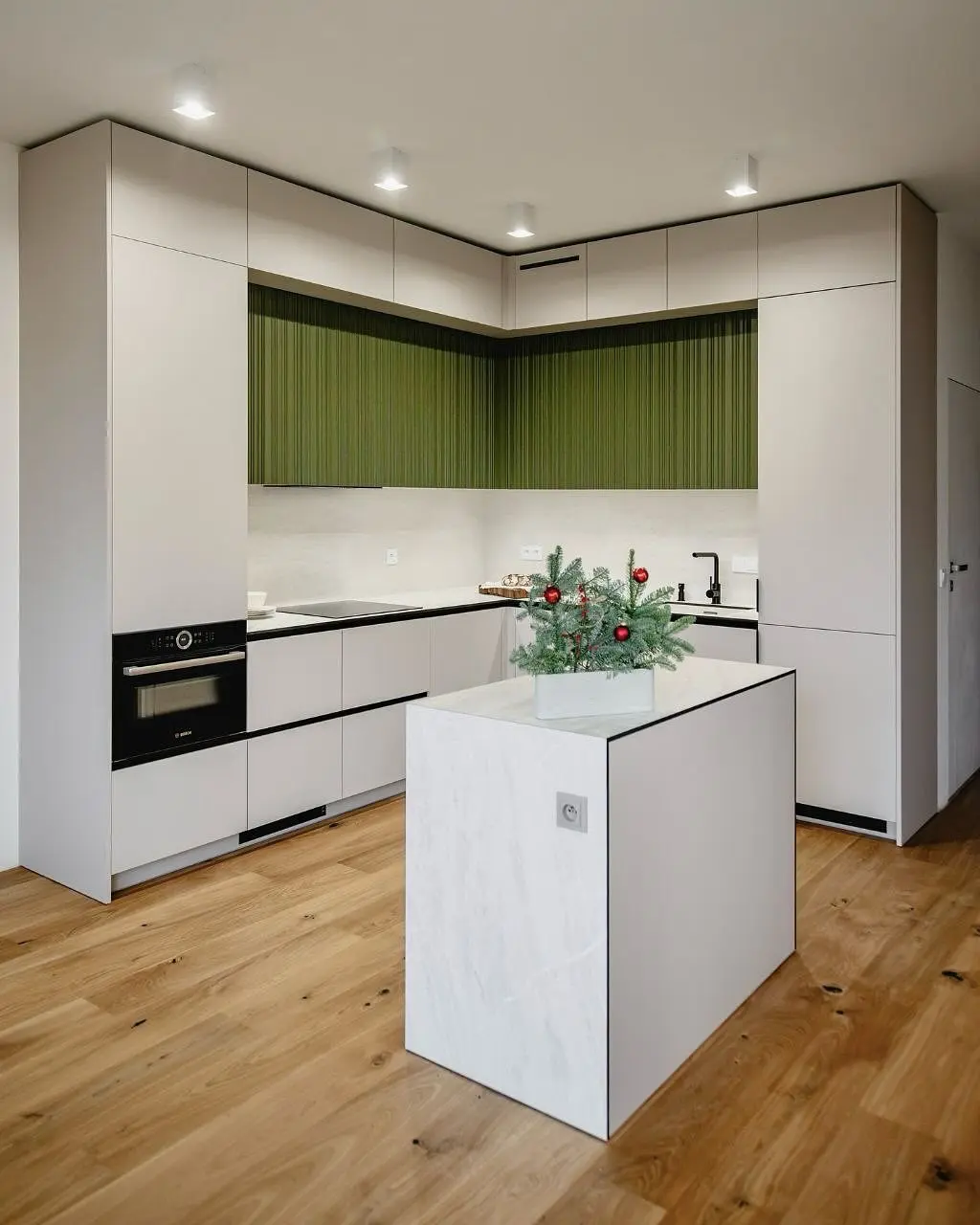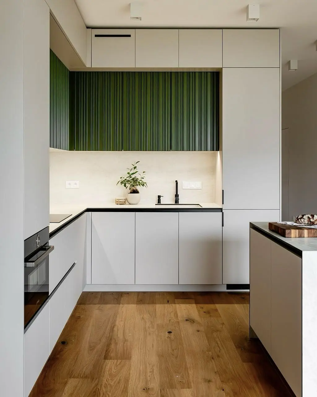 Белые фасады с матовым покрытием подчёркивают лёгкость и чистоту, а зелёные акценты добавляют свежести и индивидуальности.
