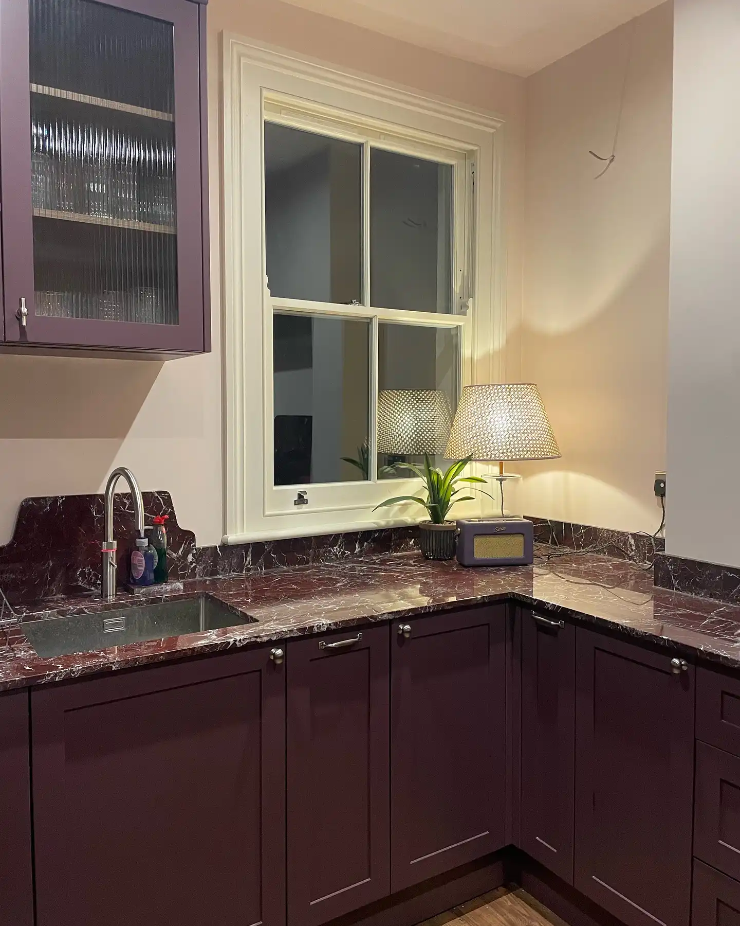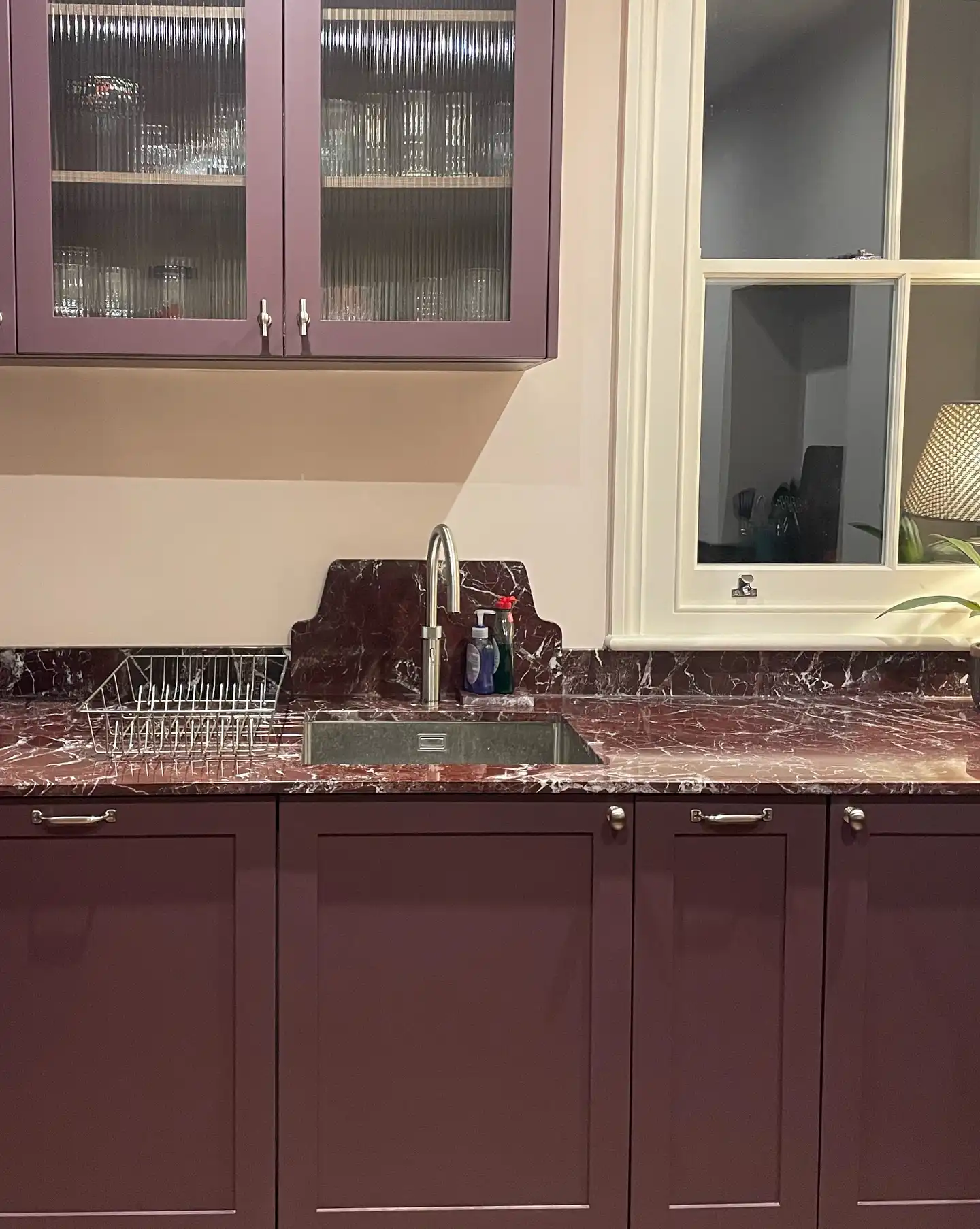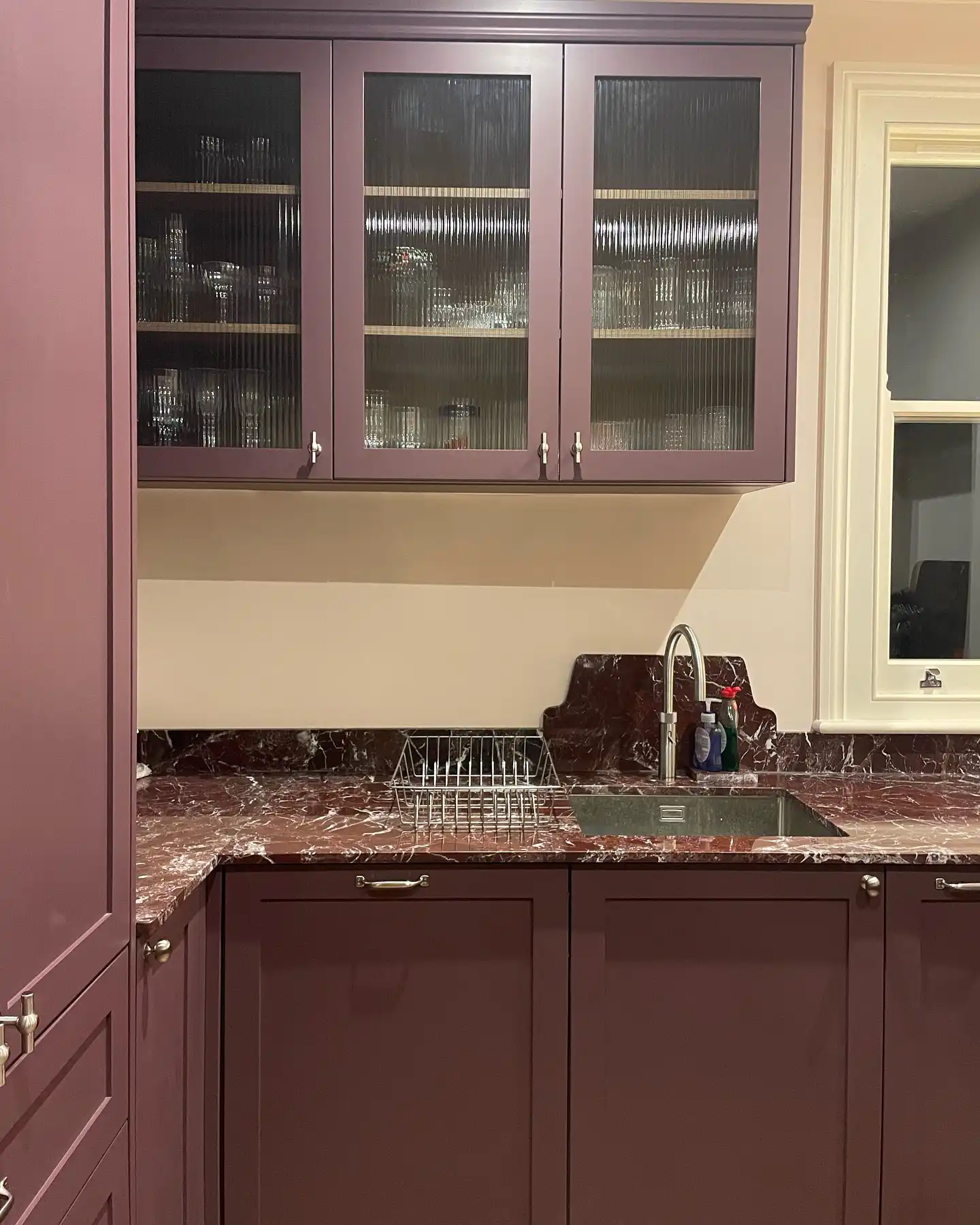 Кухня Вердена выполнена в насыщенном бордово-фиолетовом оттенке с матовой эмалью, создавая атмосферу уюта и глубины. Тёплый тон фасадов гармонирует с мраморной столешницей тёмно-коричневого цвета.