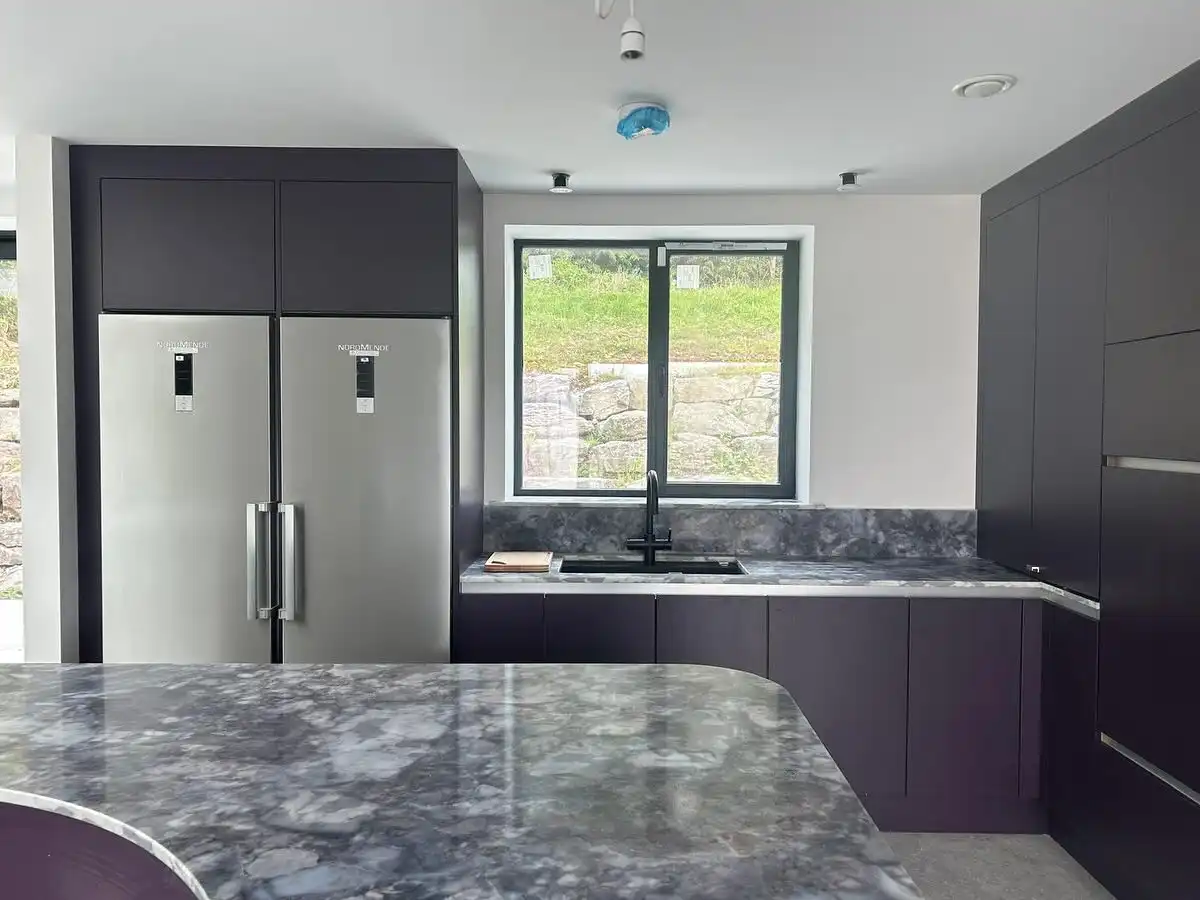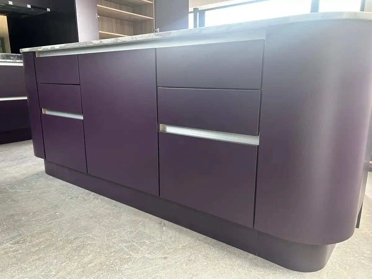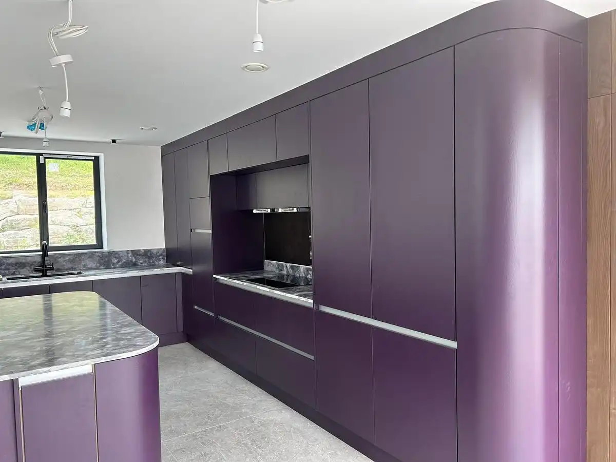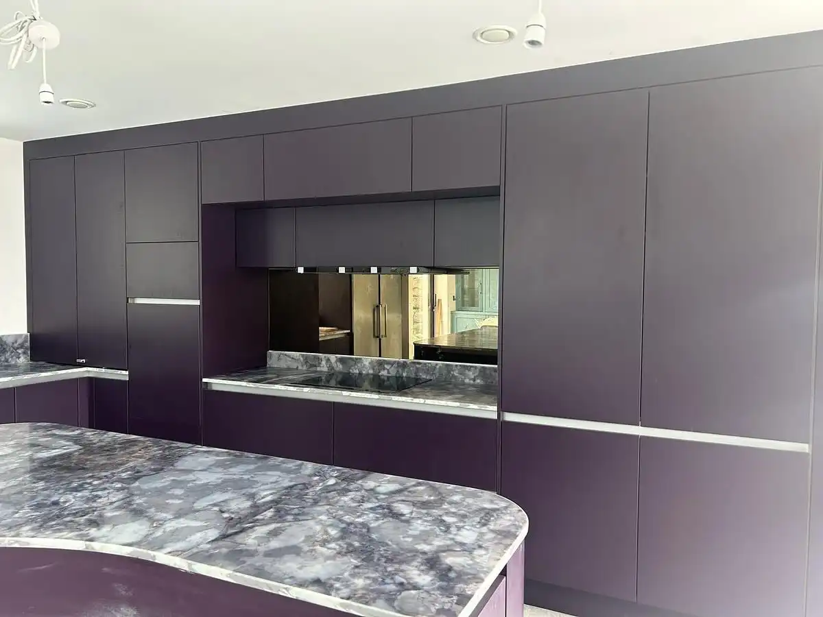 Кухня Вивиана выполнена в благородном сливово-фиолетовом оттенке с мягким матовым покрытием, создающим атмосферу спокойного комфорта. Фасады из МДФ с эмалью и кварцевая столешница под серый мрамор подчёркивают современный минимализм и практичность. Фурнитура Blum обеспечивает плавность хода и долговечность. П-образная форма с островом делает кухню удобной для готовки и общения, сохраняя ощущение простора и уюта.