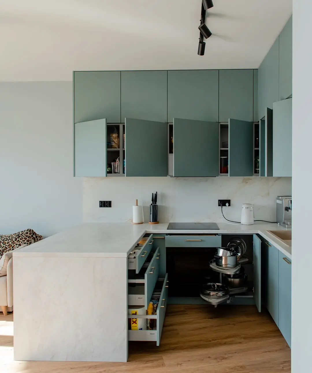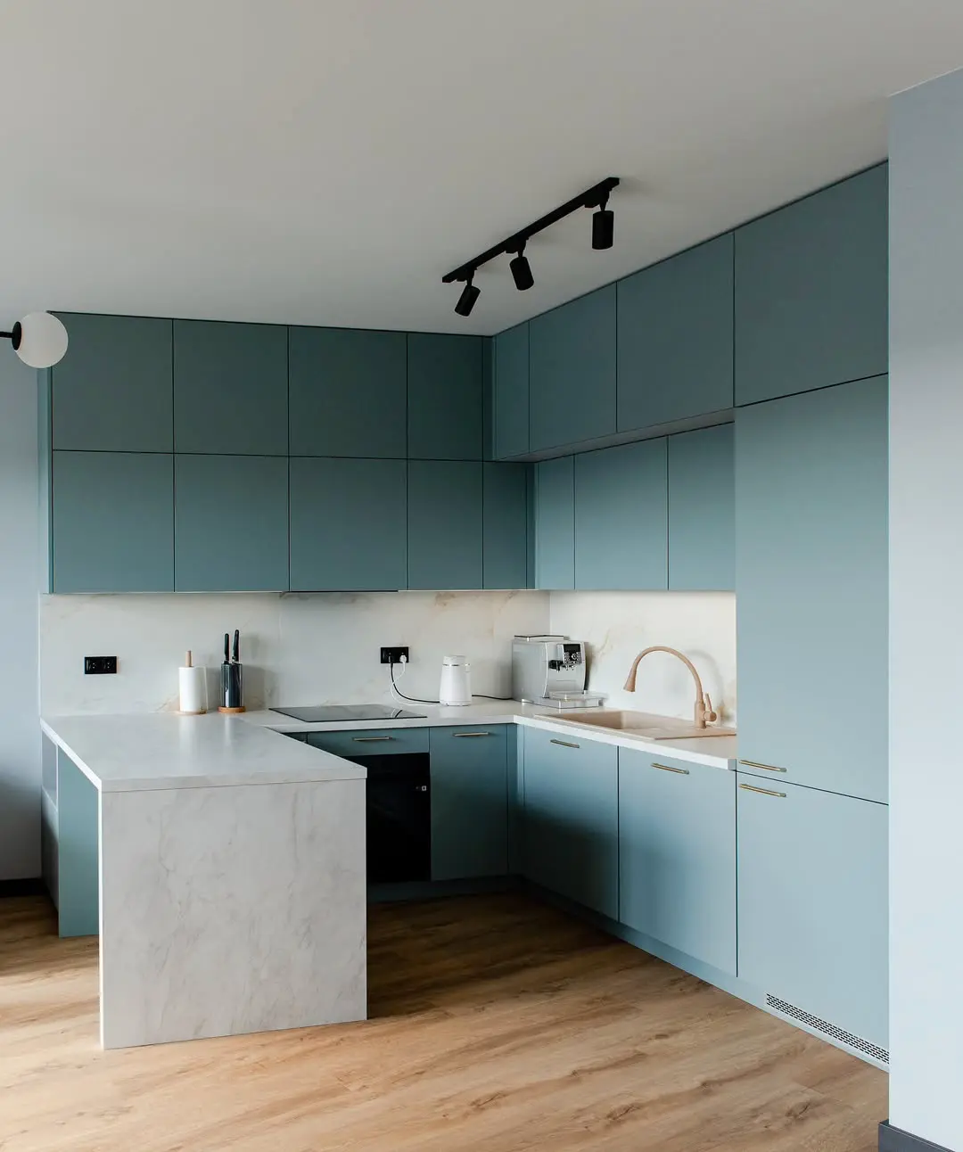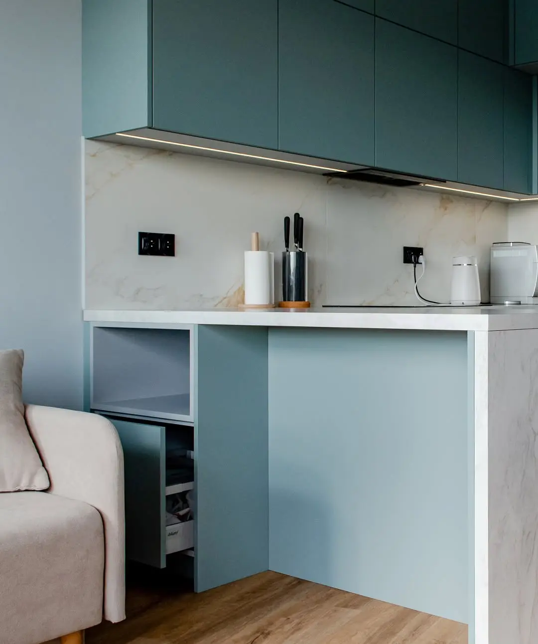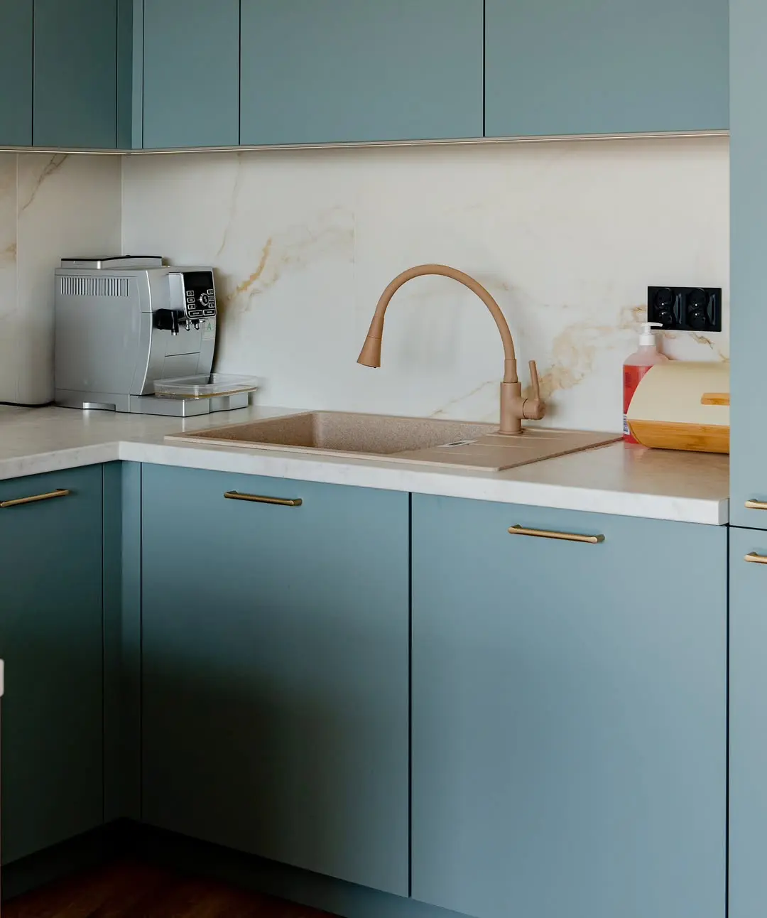 Кухня Айрис — воплощение лёгкости и современного вкуса. Мягкий голубой оттенок фасадов гармонирует с мраморной столешницей и бежевыми акцентами. Лаконичные линии, скрытая фурнитура и функциональное расположение модулей создают уютное и стильное пространство. Кухня идеально подойдёт для тех, кто ценит спокойствие, порядок и естественную эстетику.