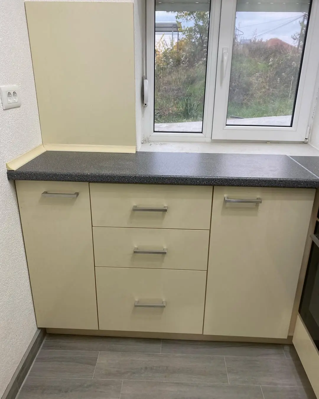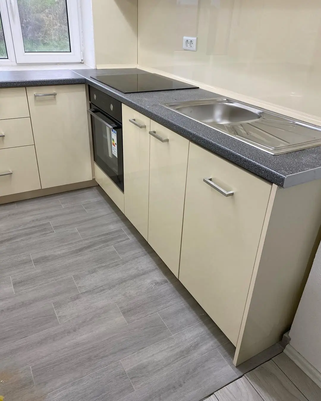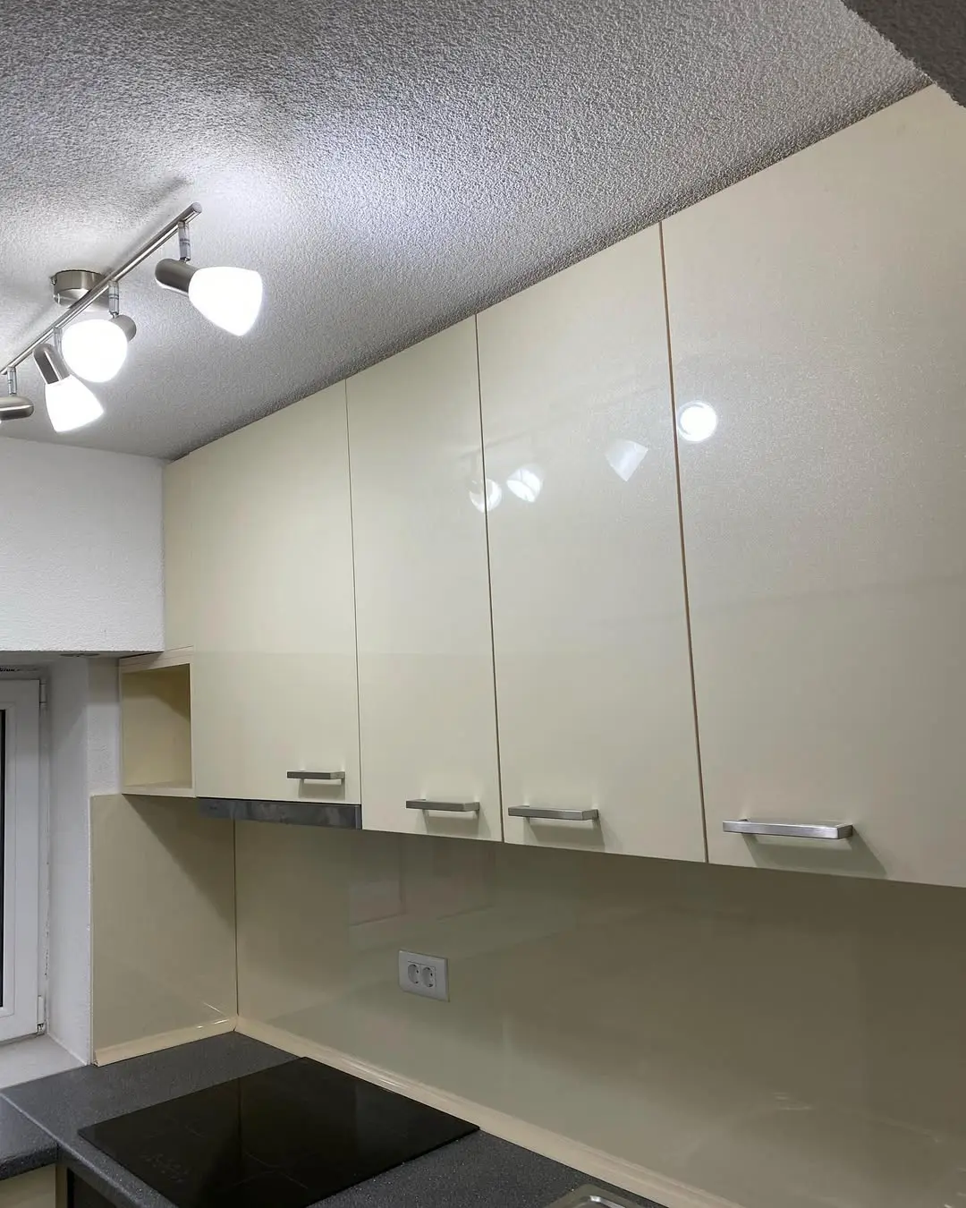 Кухня Алисона — светлое, аккуратное и практичное решение для небольших помещений. Глянцевые кремовые фасады добавляют визуального пространства, а тёмно-серая фактурная столешница подчёркивает контраст и делает кухню более выразительной. Удобная Г-образная планировка обеспечивает комфортную рабочую зону, а функциональные шкафы дают достаточно места для хранения.