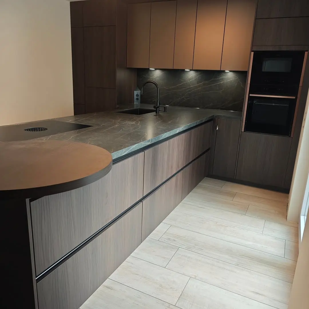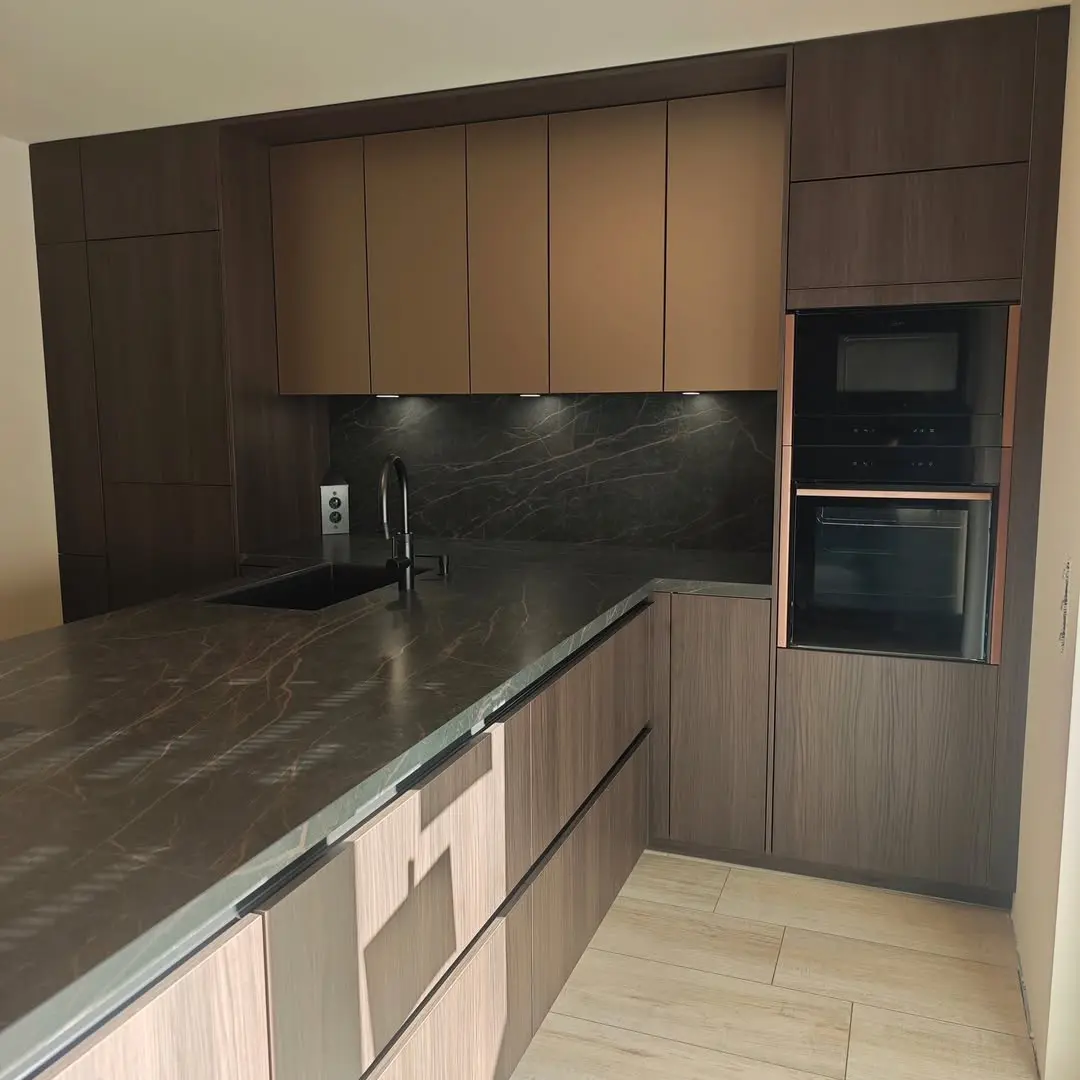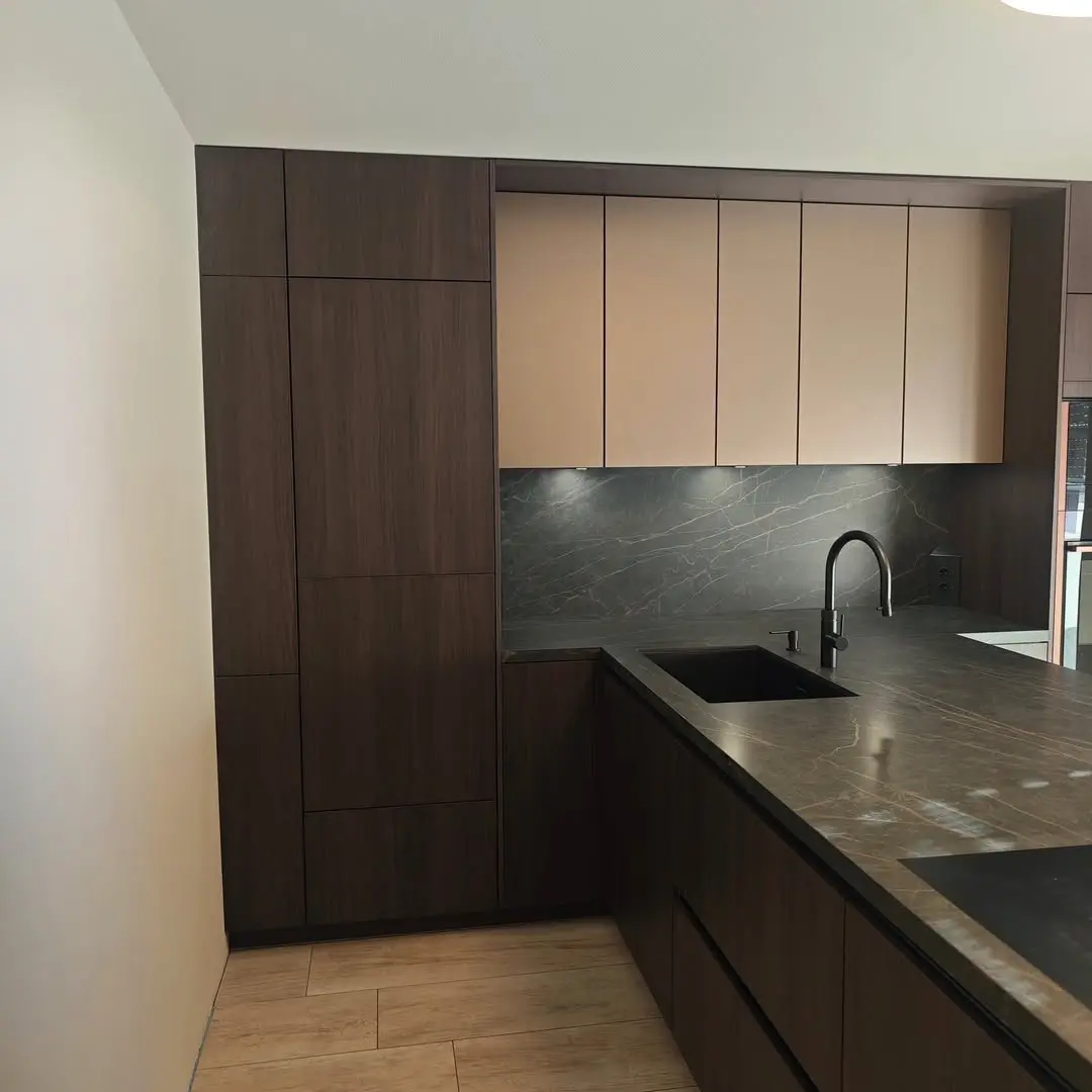 Тёмные фасады под натуральный шпон делают кухню солидной и благородной, а верхние шкафы в оттенке капучино добавляют мягкости и визуального баланса. Акцентная столешница из искусственного камня с мраморными прожилками подчёркивает дорогой образ и объединяет композицию с фартуком. Продуманная барная зона расширяет рабочую поверхность, а скрытые ручки создают чистую, лаконичную геометрию.