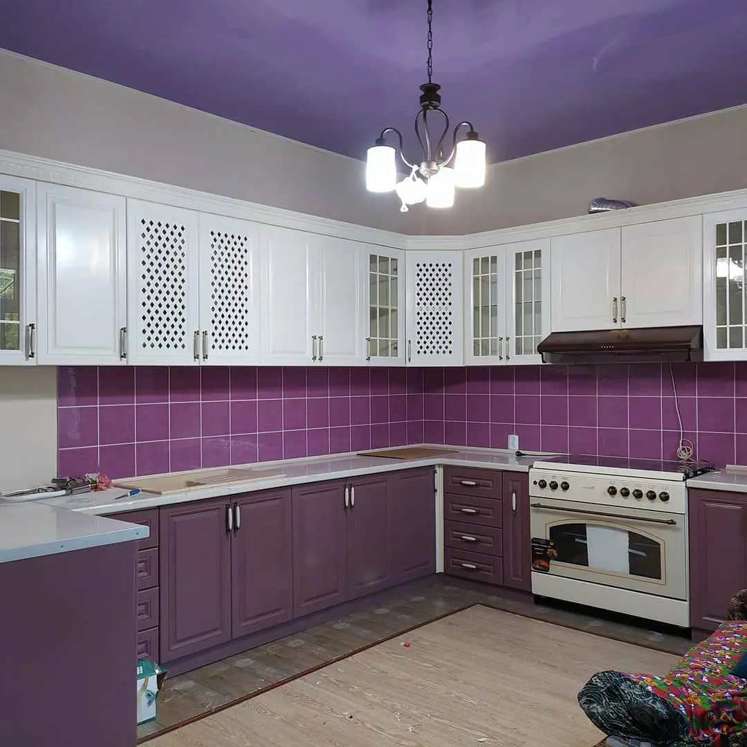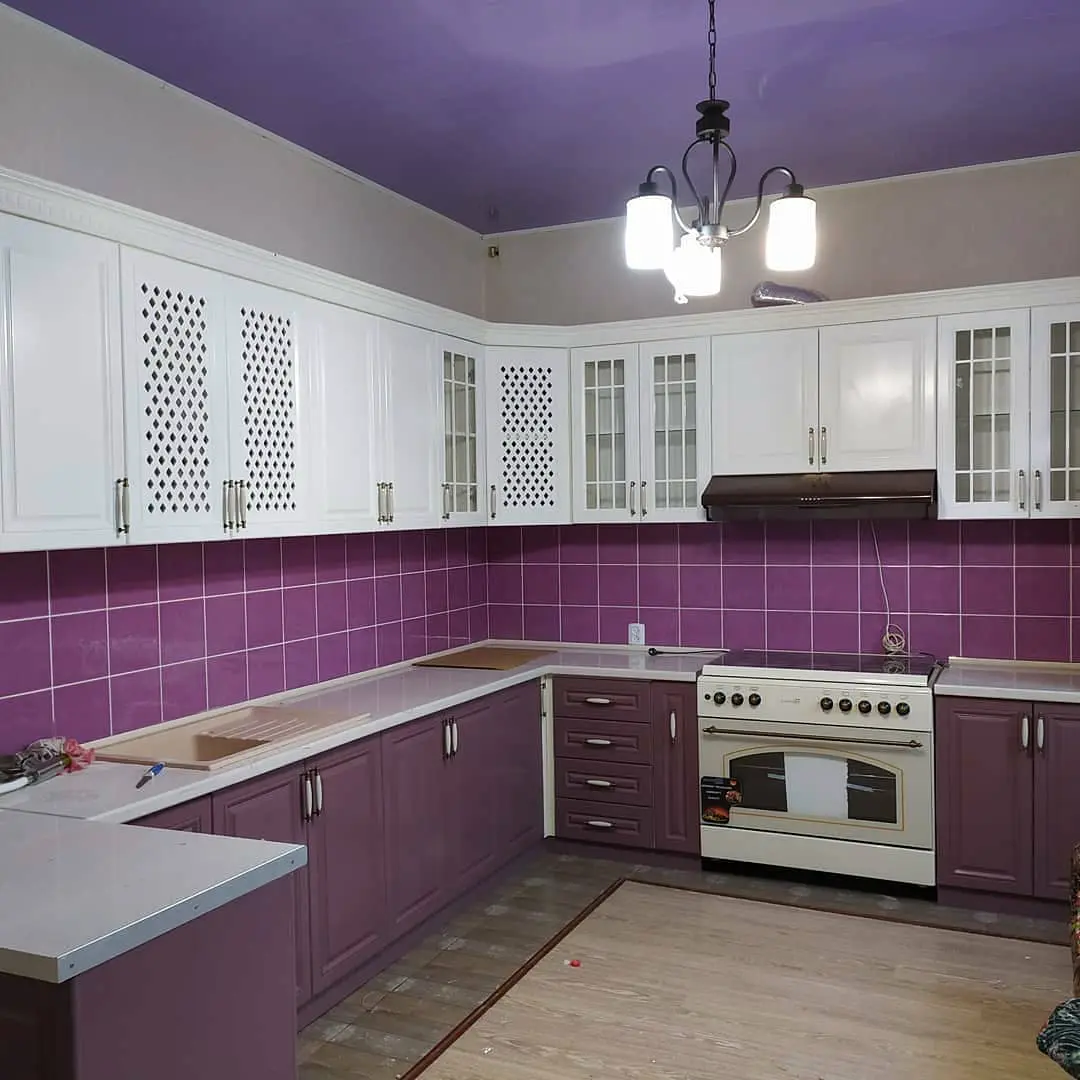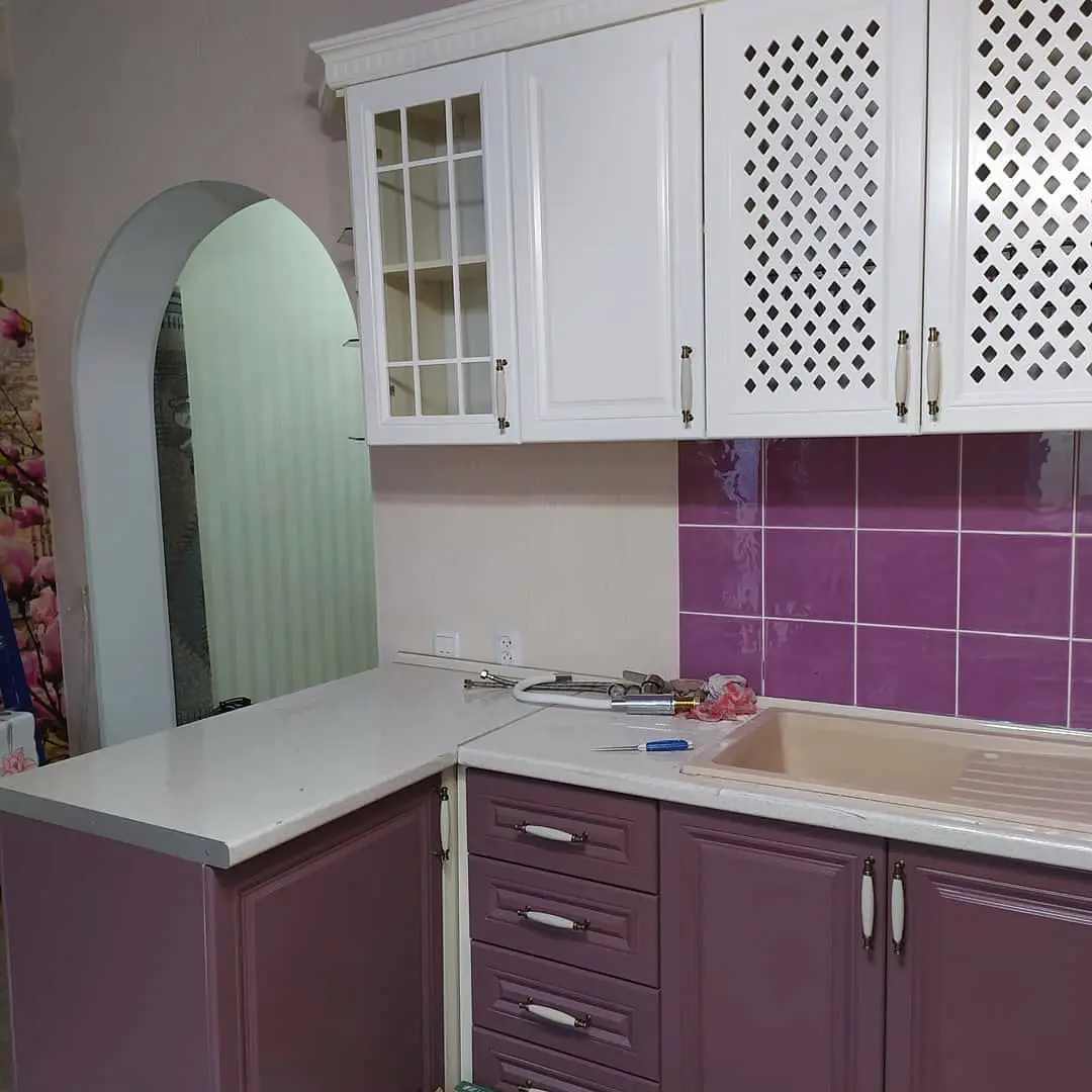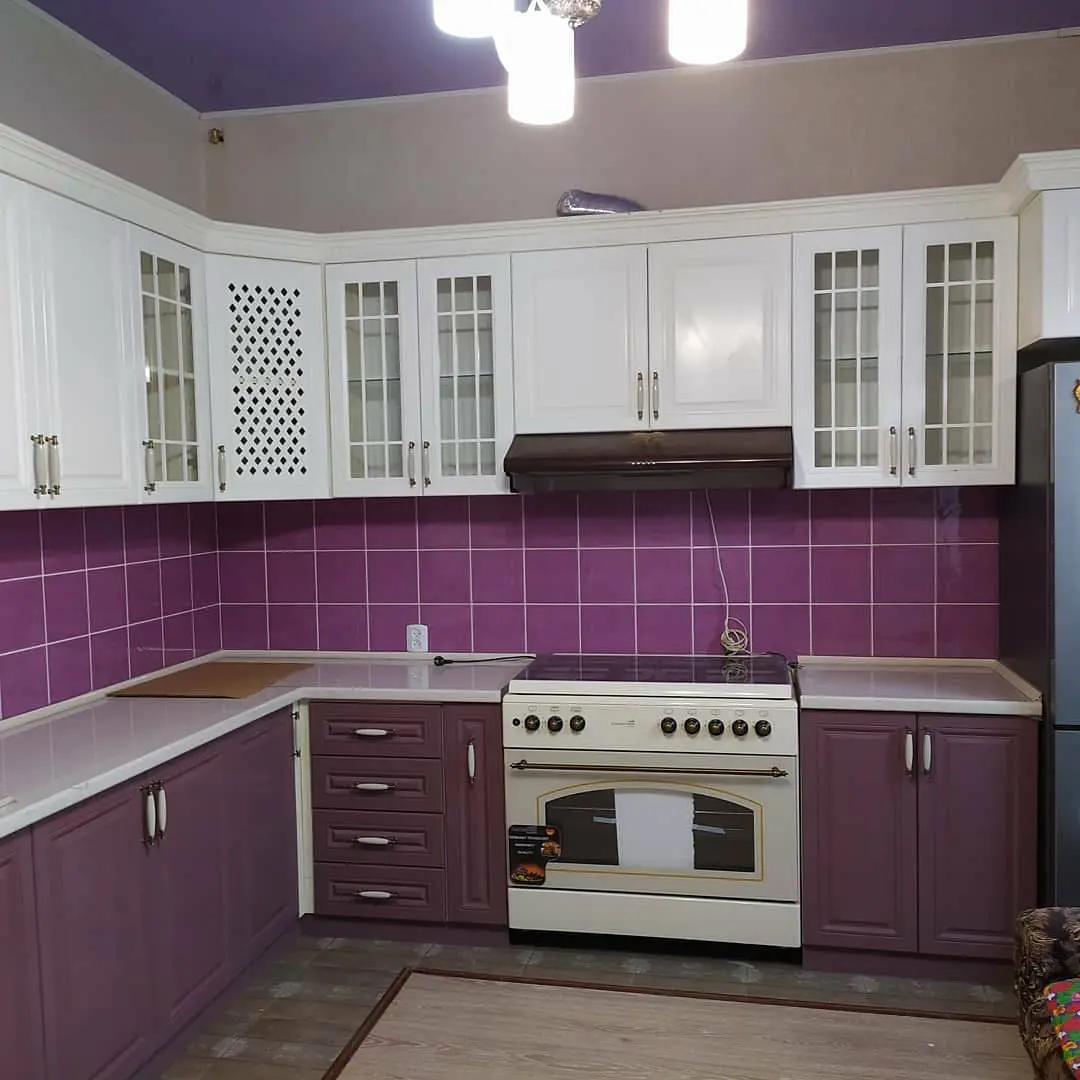 Кухня Амели — яркий пример классики с нежным акцентом цвета. Сочетание фиолетовых нижних фасадов и белых верхних шкафов делает интерьер выразительным, но в то же время уютным. Ажурные и стеклянные фасады добавляют лёгкости, а глянцевая плитка фартука подчёркивает глубину цвета. Угловая планировка обеспечивает продуманную функциональность, а для рабочих поверхностей использован прочный светлый пластик. Кухня выглядит свежо, аккуратно и идеально подходит для помещений, где хочется создать атмосферу тепла и индивидуального стиля.