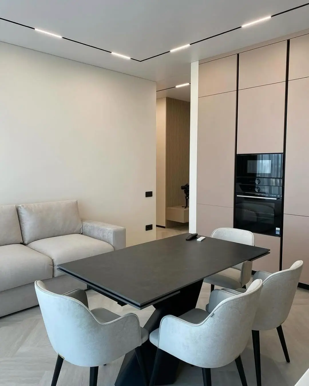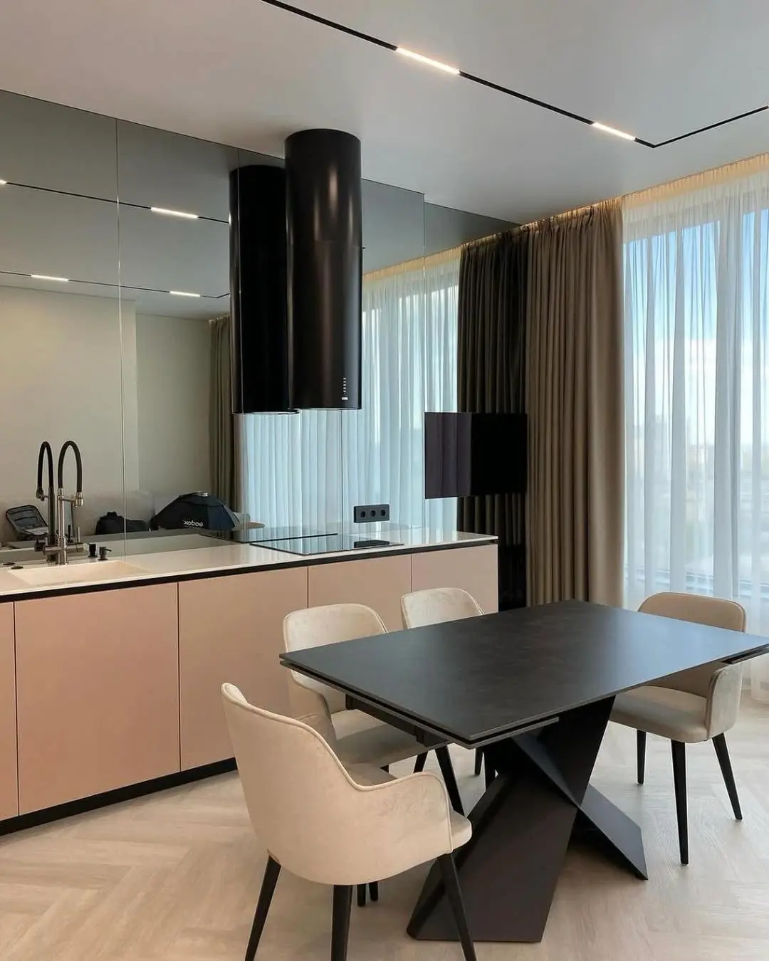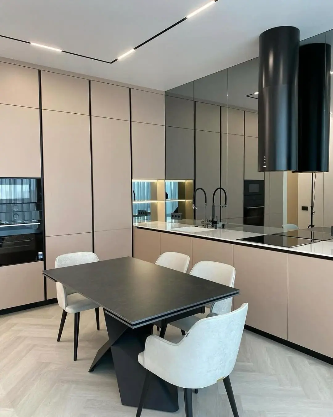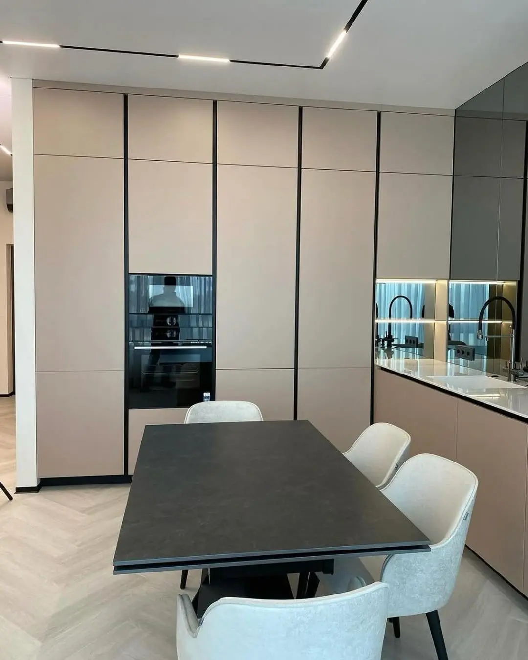 Кухня Астория — стиль и спокойствие в каждом штрихе. Фасады в розово-бежевом оттенке создают ощущение уюта, а чёрные детали придают дизайну глубину и характер. Зеркальный фартук и встроенная подсветка визуально расширяют пространство, делая интерьер по-настоящему современным.