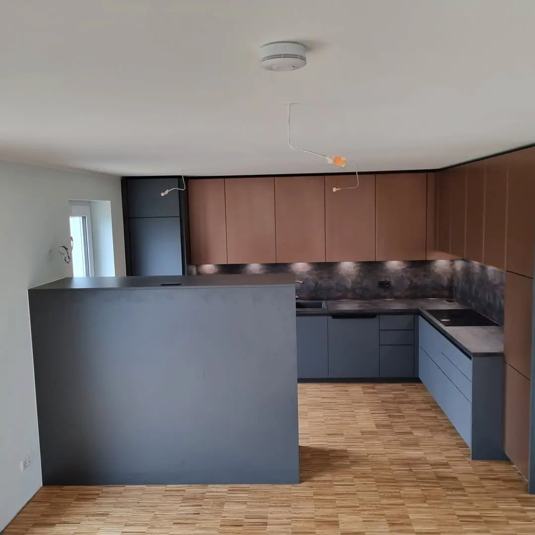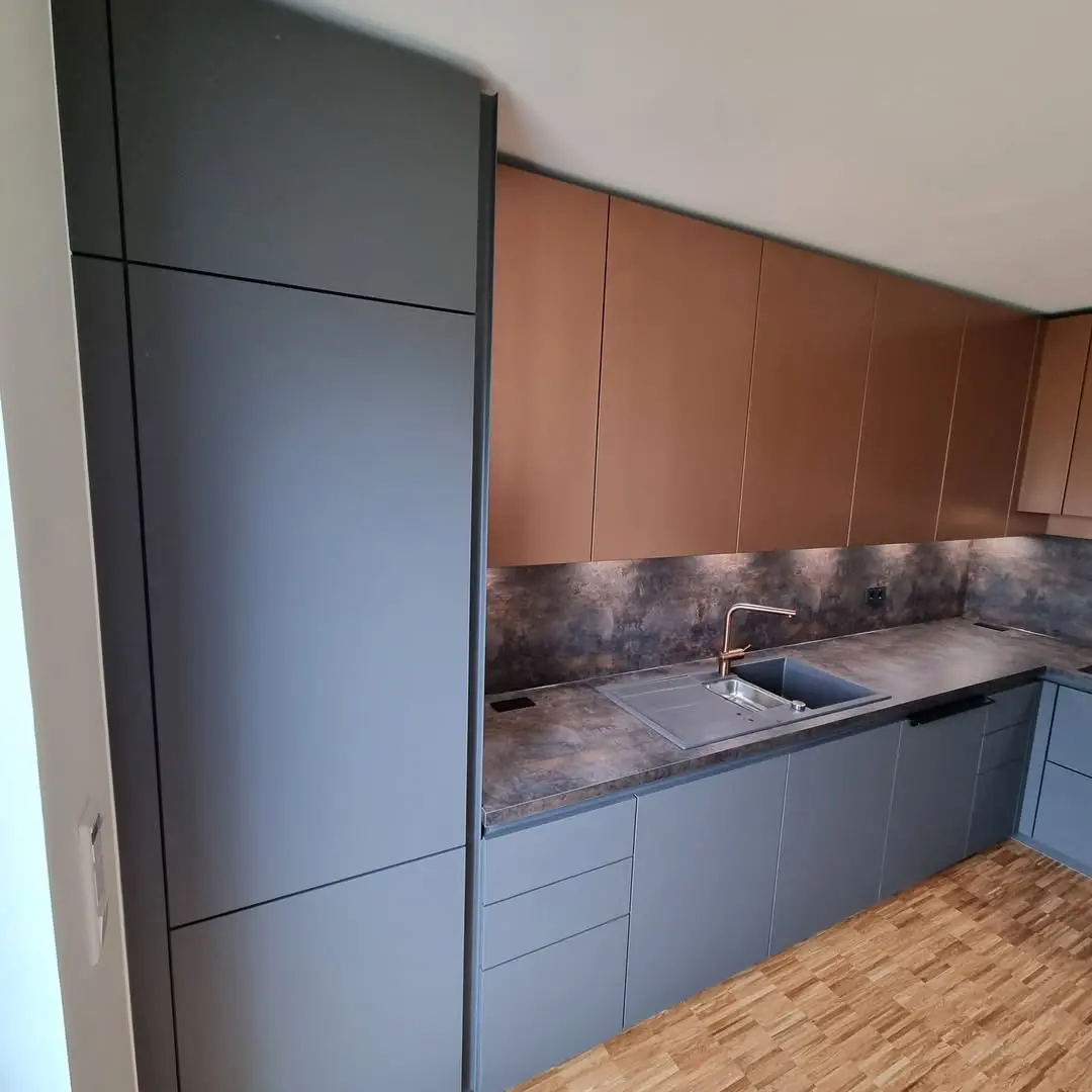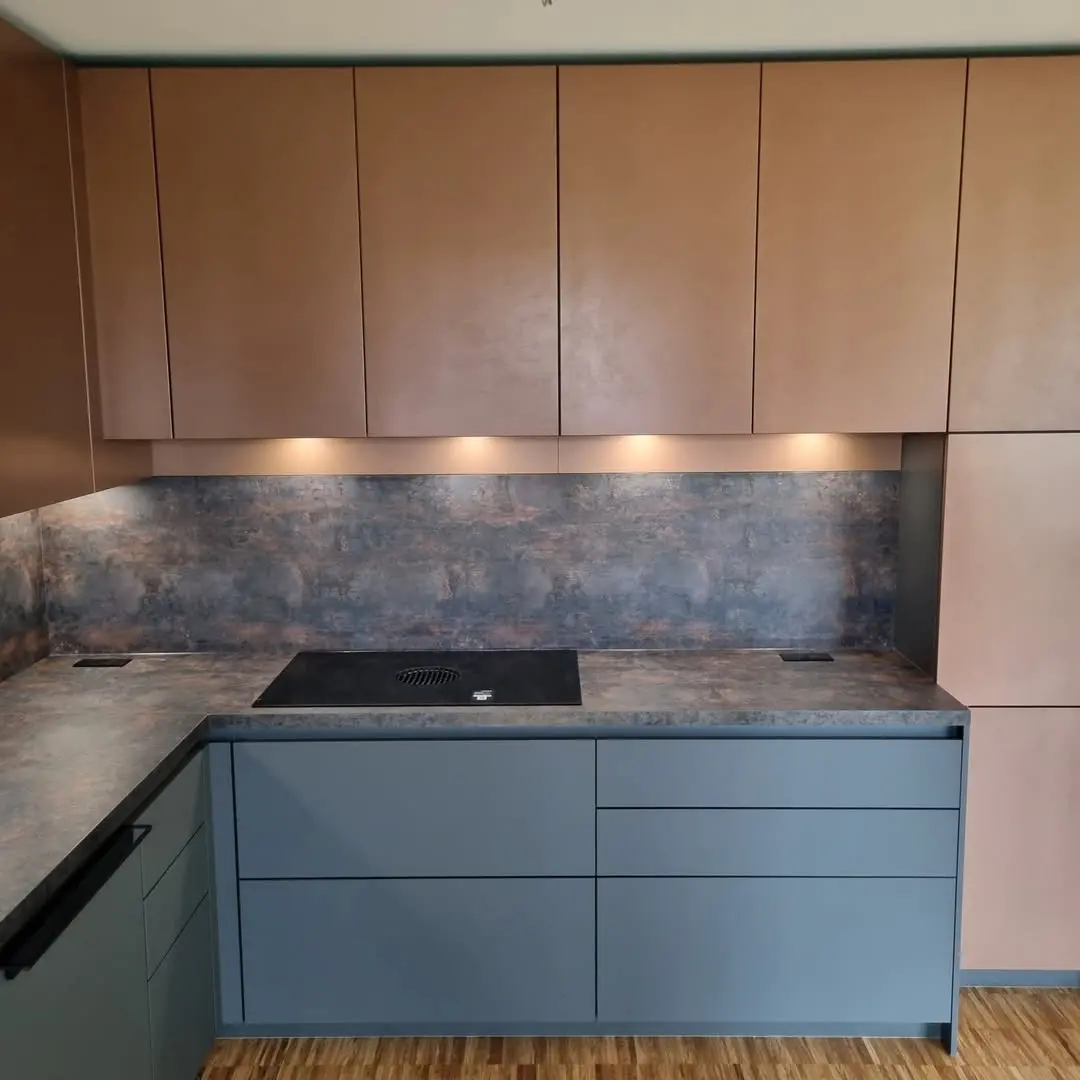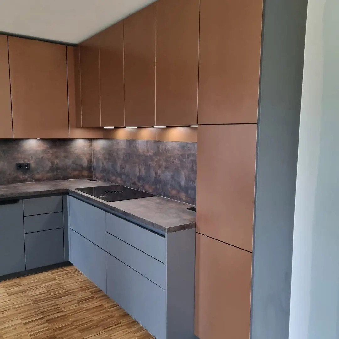Кухня Элантра — стильная и выразительная модель, в которой гармонично сочетаются коричневые нижние фасады, серые высокие модули и бронзовые верхние шкафы. Матовые поверхности создают глубокий, благородный эффект, а каменная столешница и фартук с текстурой под металл подчеркивают премиальность кухни.