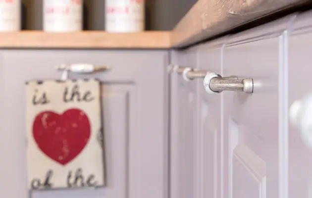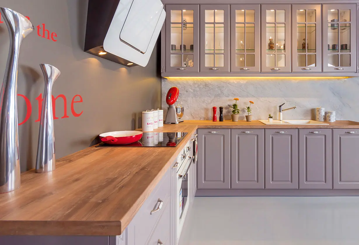 Матовые фрезерованные фасады создают атмосферу комфорта, а витринные модули придают лёгкость и аккуратность. Тёплая деревянная столешница гармонирует с пастельным тоном фасадов, а фартук под мрамор добавляет интерьеру свет и элегантность.