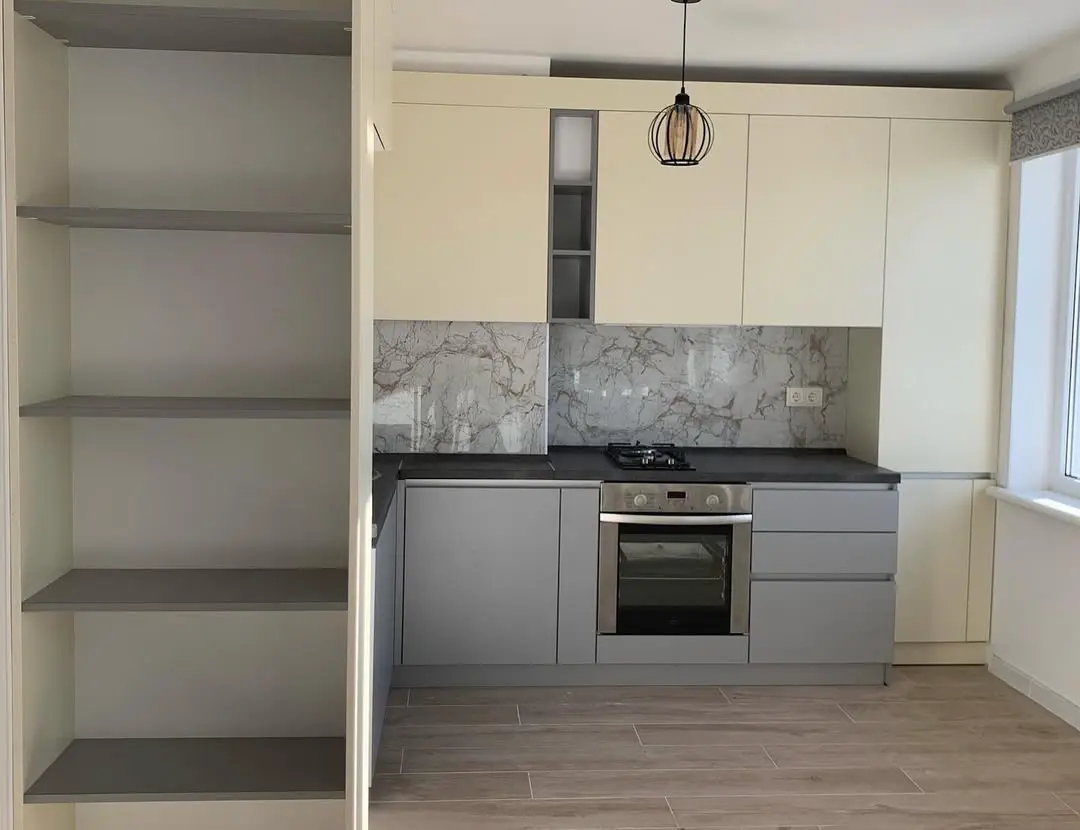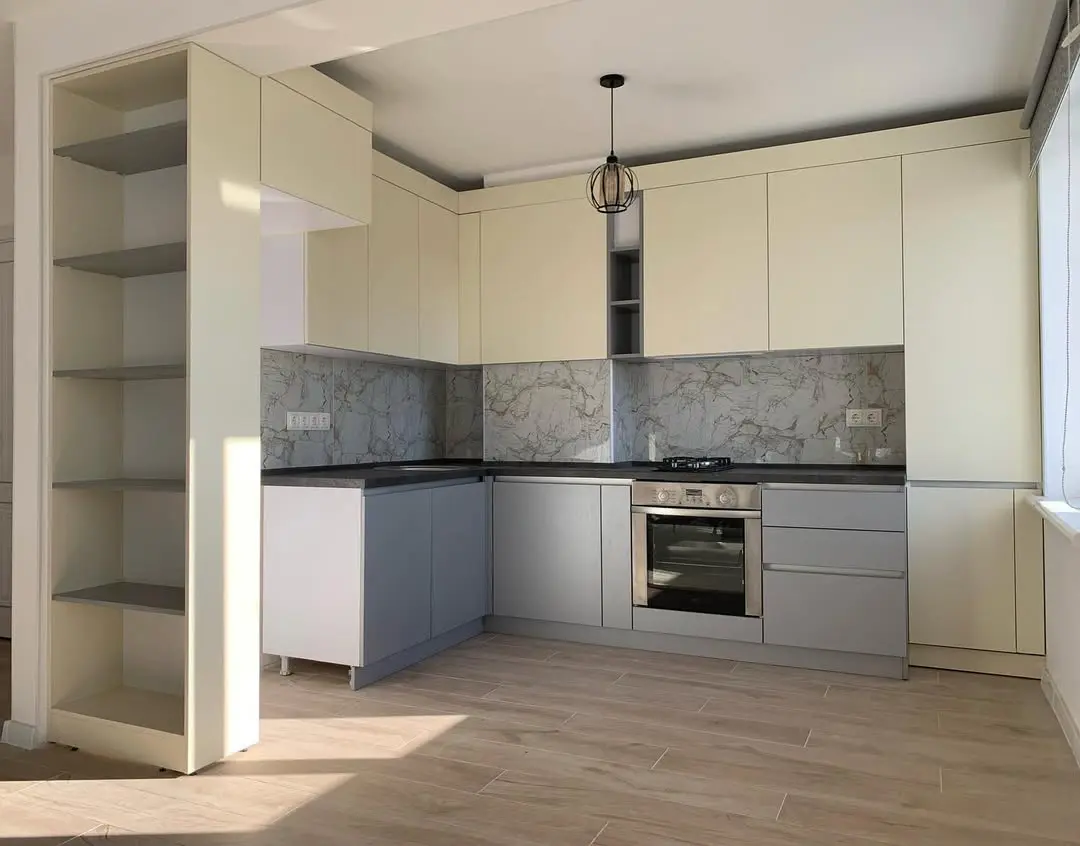 Кухня Эвисса — это современное сочетание мягкого ванильного оттенка и элегантного холодного серого. Светлые верхние фасады создают лёгкость и визуально расширяют пространство, а тёмно-серые нижние модули добавляют глубину и порядок. Мраморный фартук задаёт акцент и делает интерьер более премиальным, при этом сохраняется минималистичная геометрия и чистые линии. Матовые фасады смотрятся дорого и спокойны в уходе, а фурнитура с доводчиками обеспечивает комфорт и долговечность.