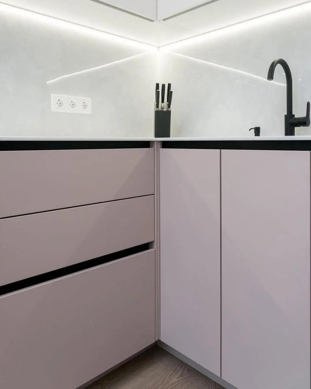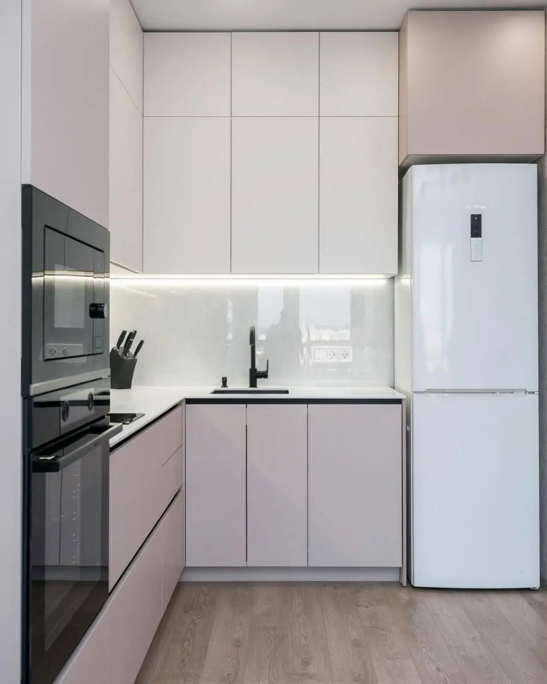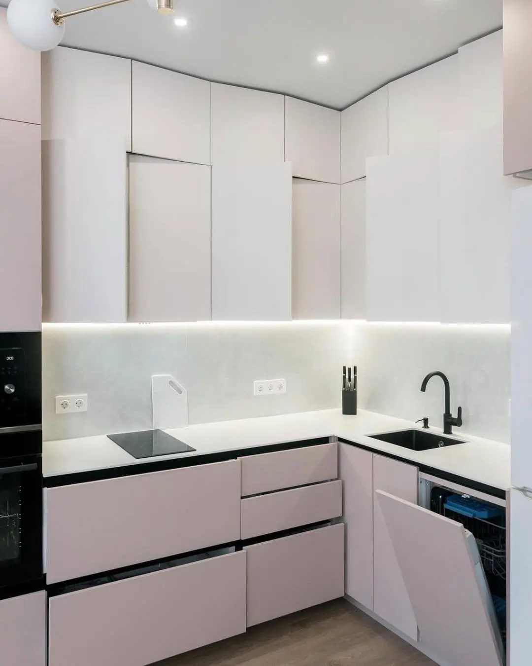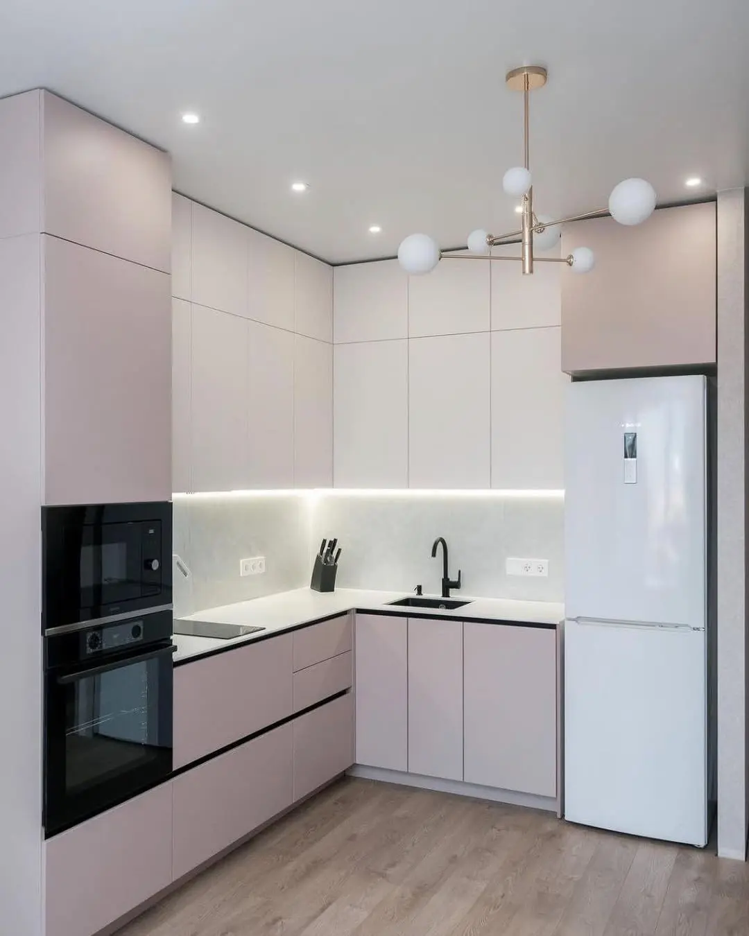 Кухня Илария выполнена в современном минималистичном стиле. Контраст белого и розового делает интерьер лёгким и свежим. Гладкие фасады без ручек подчёркивают лаконичность дизайна. Эта кухня идеально подойдёт для современных квартир и небольших пространств.